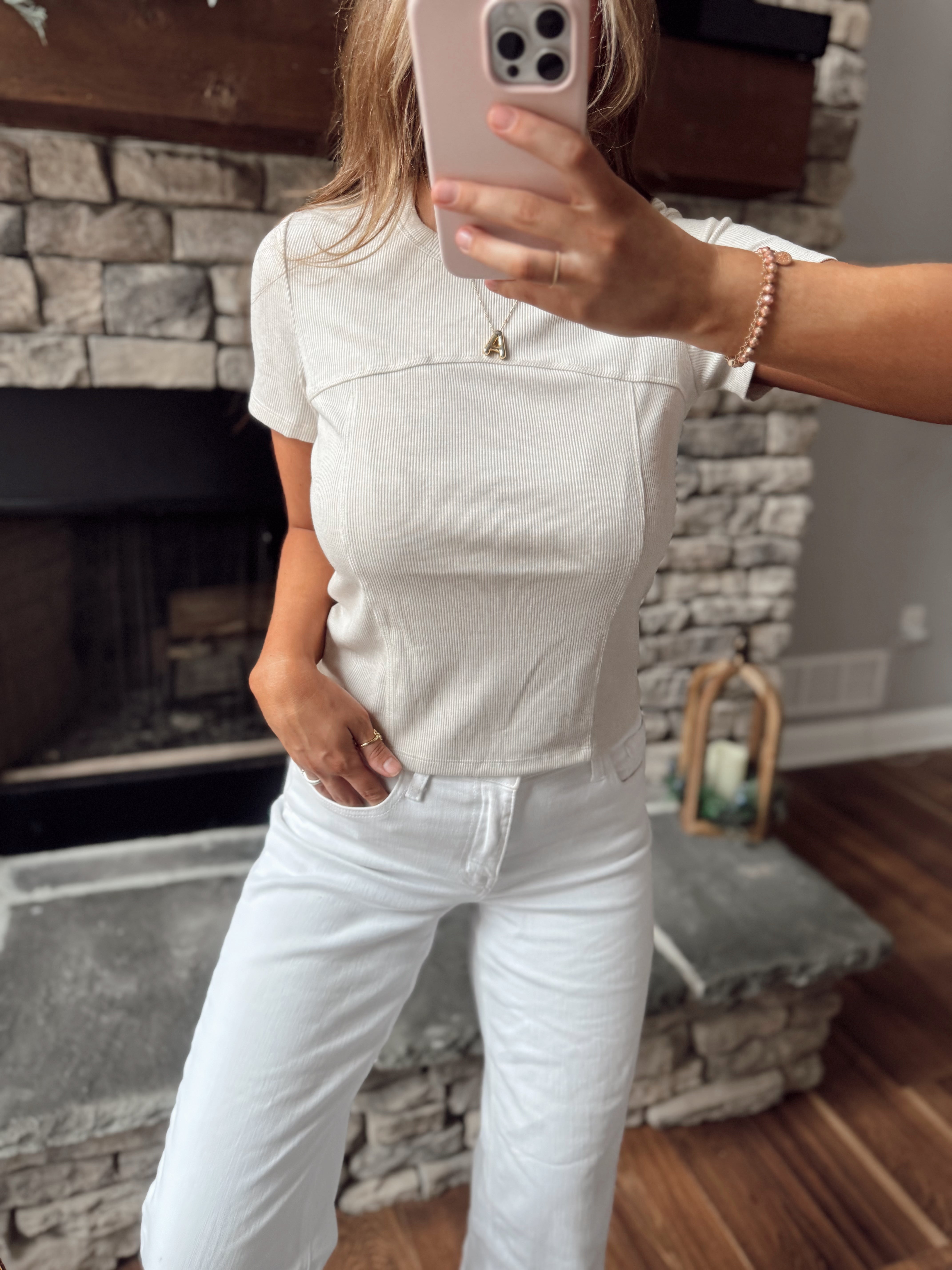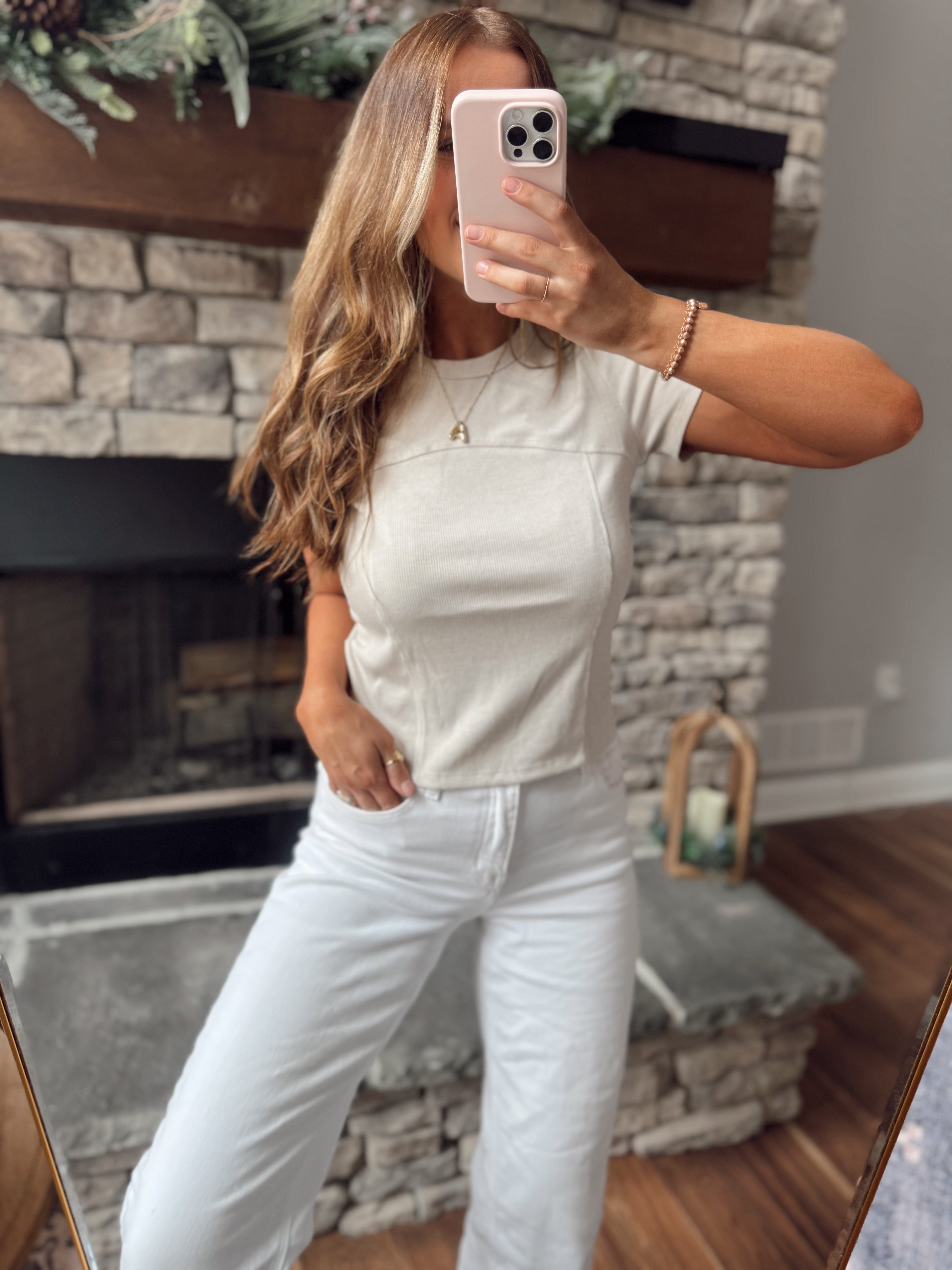 Light Taupe Grey Ribbed Seam Detailed Tee