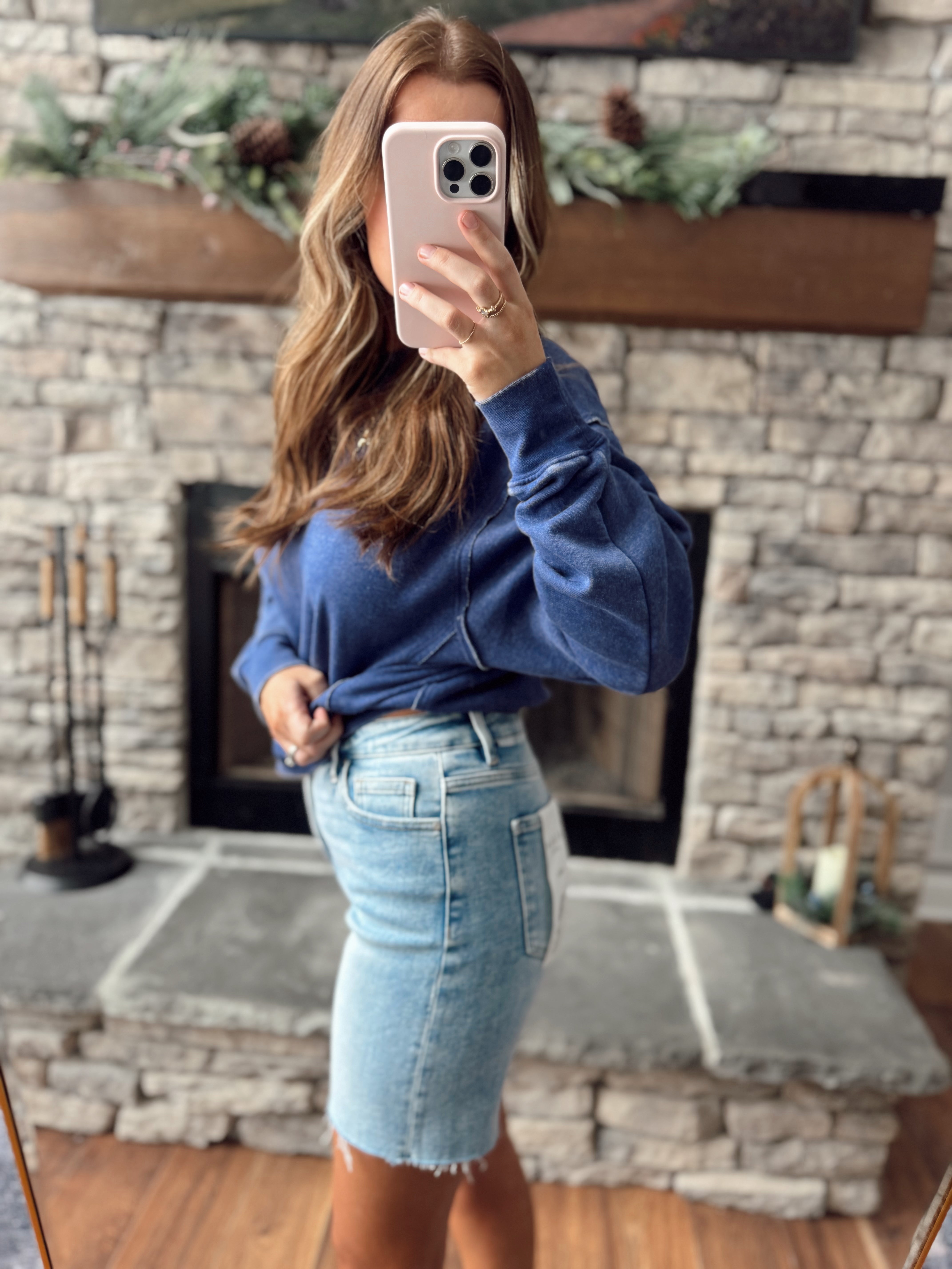 Light Risen Tummy Control Midi Length Raw Hem Denim Shorts