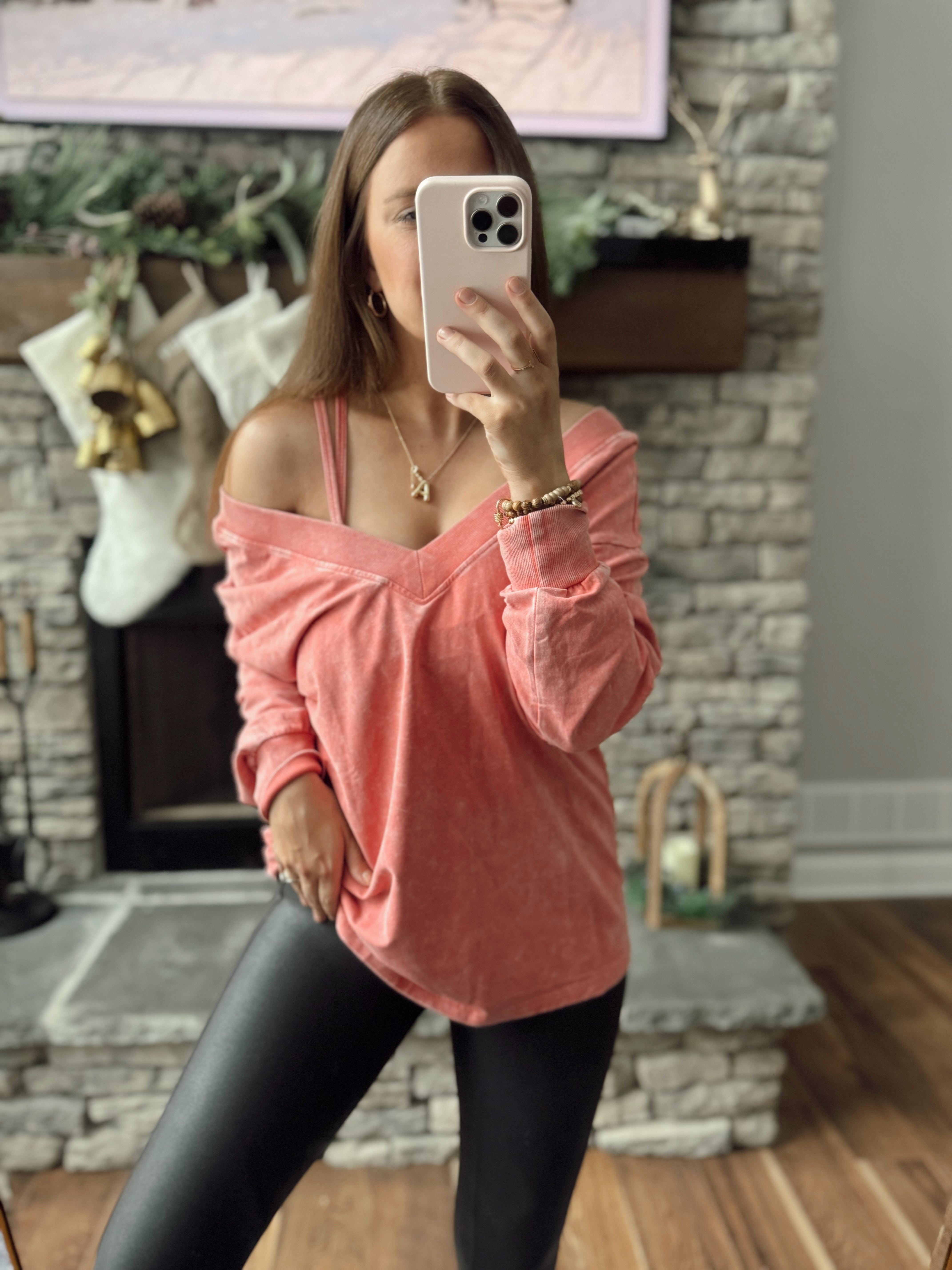 Mineral Washed Pink Cotton Deep V Long Sleeve