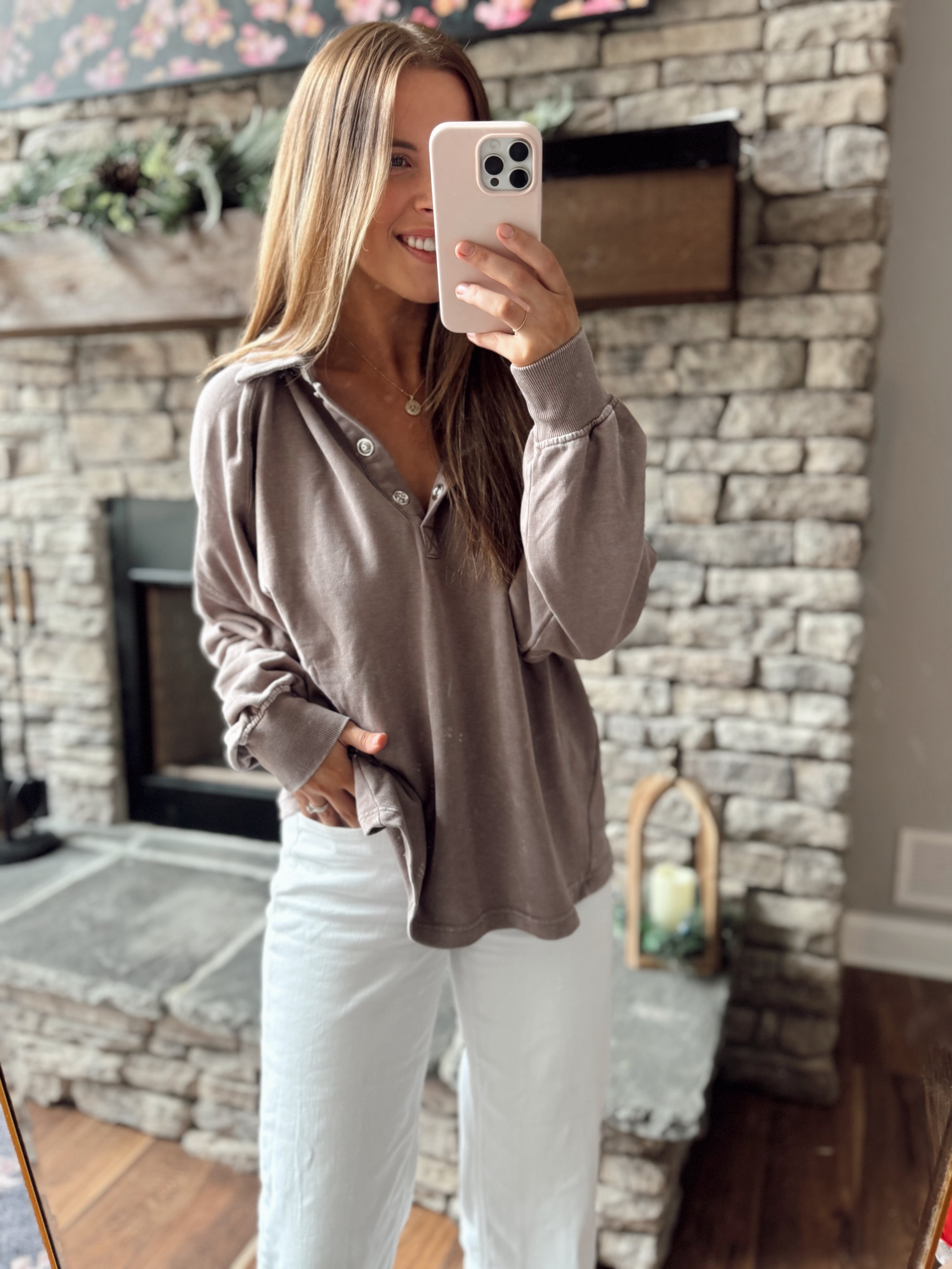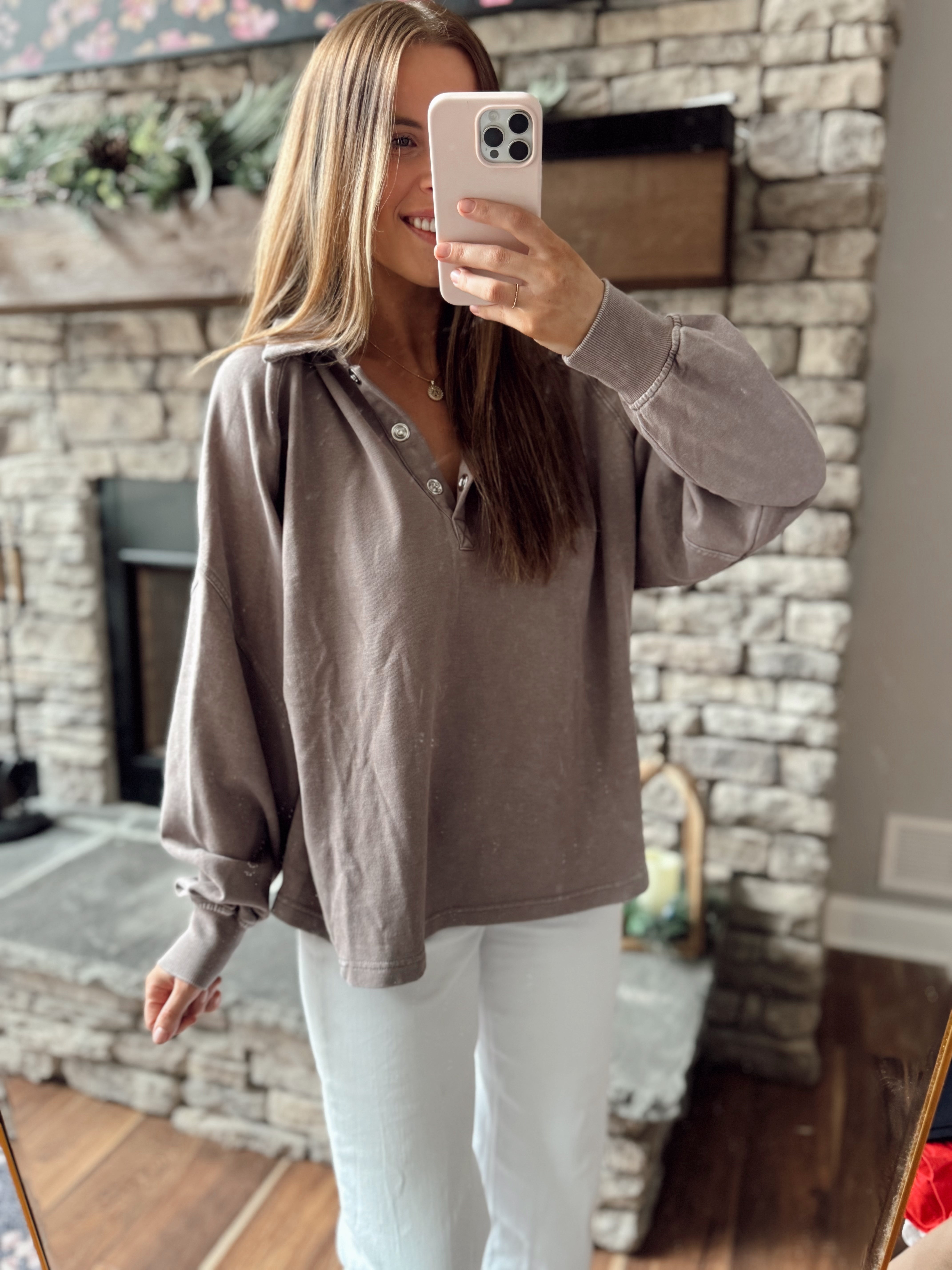 Mocha Casual Outing Mineral Washed Polo Sweatshirt