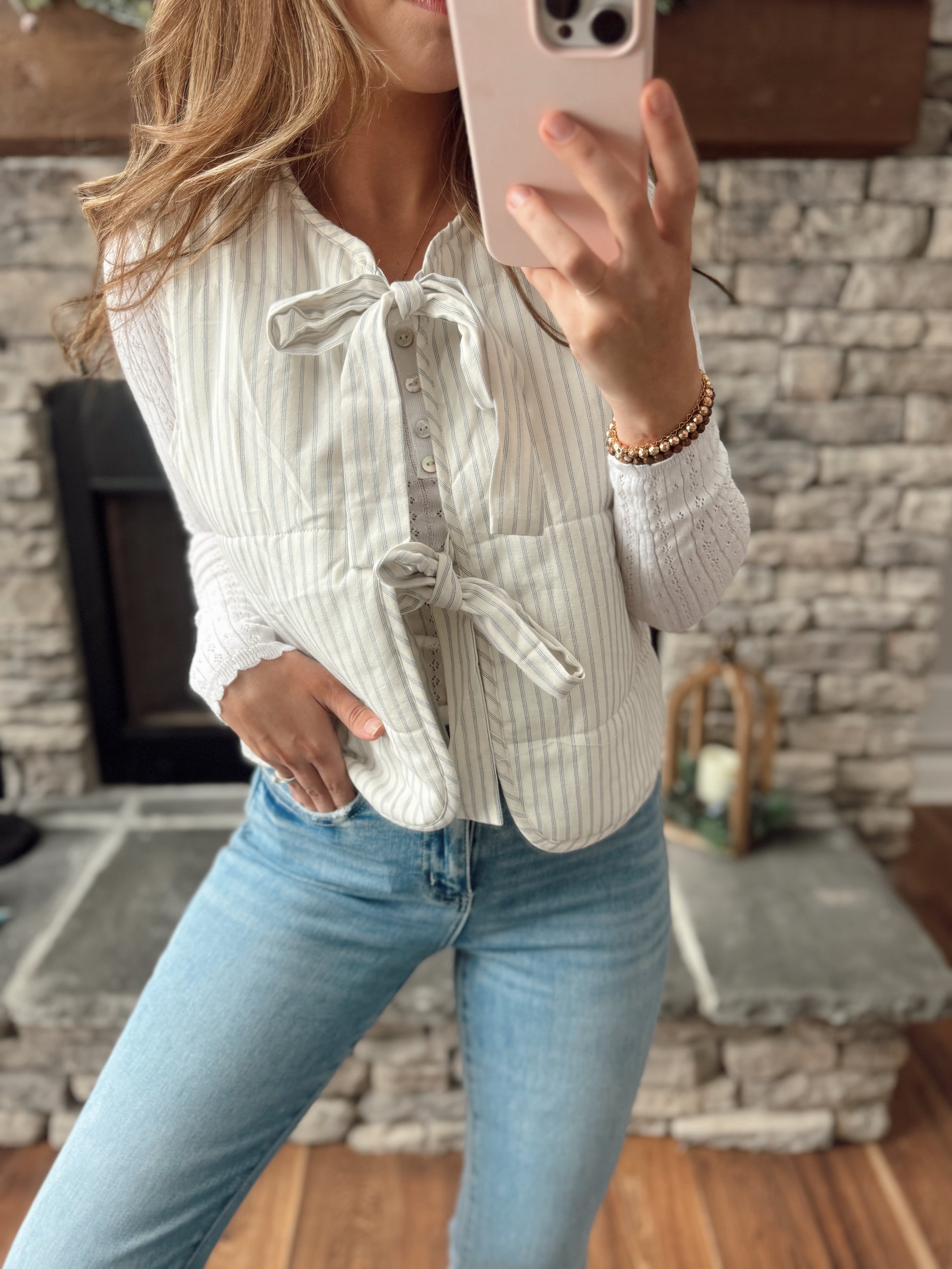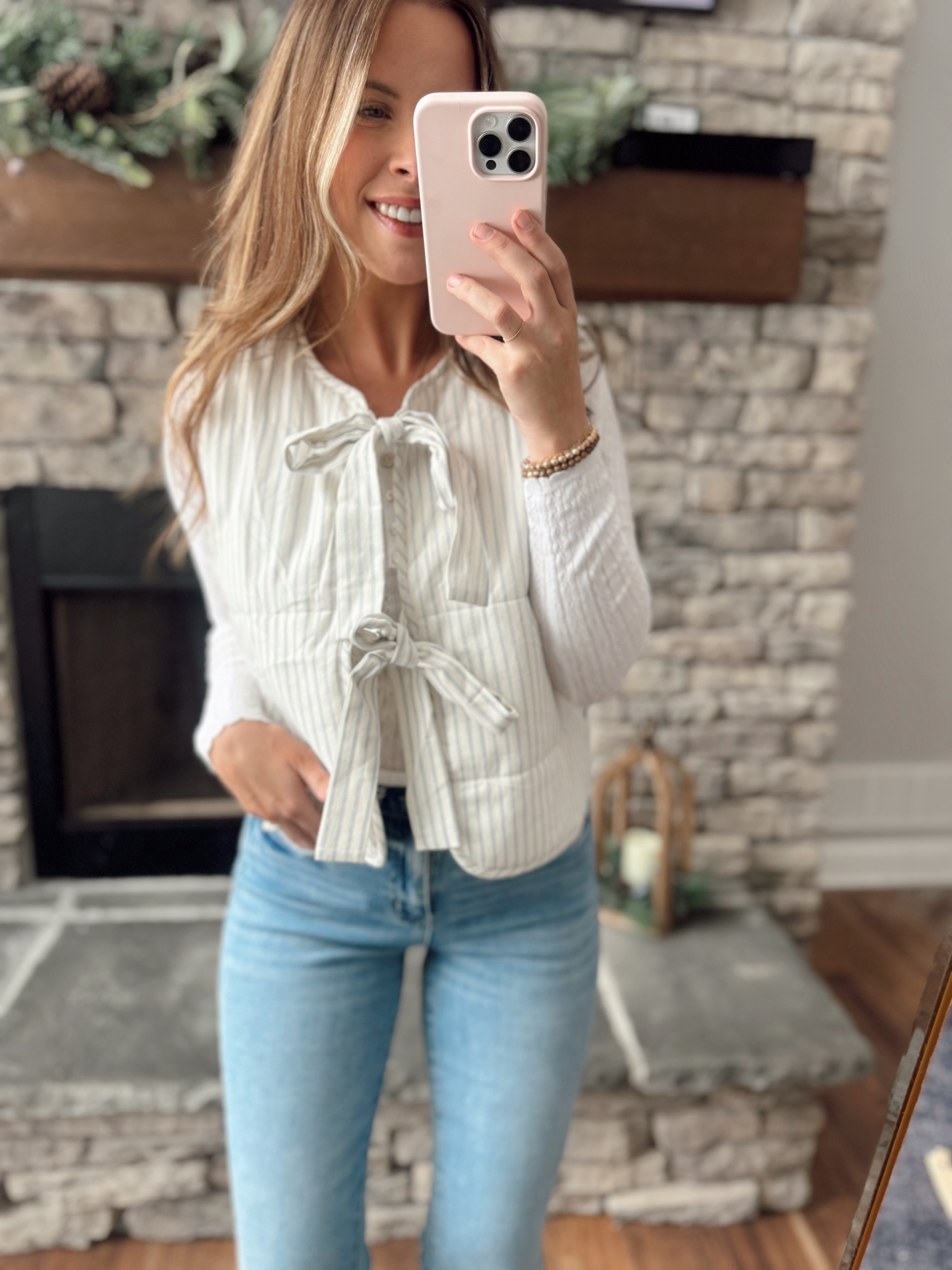 Modern Chic White/Blue Pin Stripe Front Ties Puffer Vest