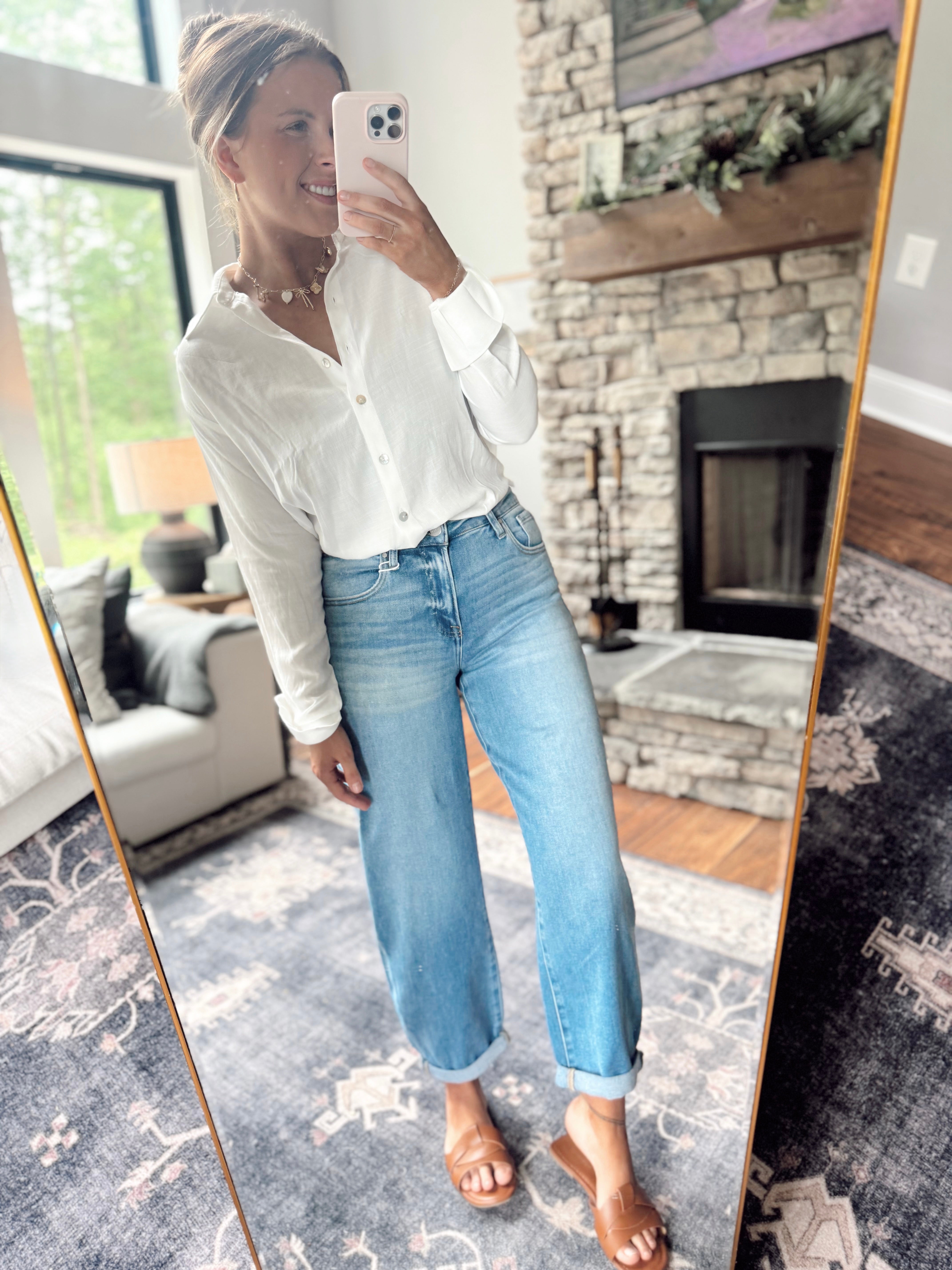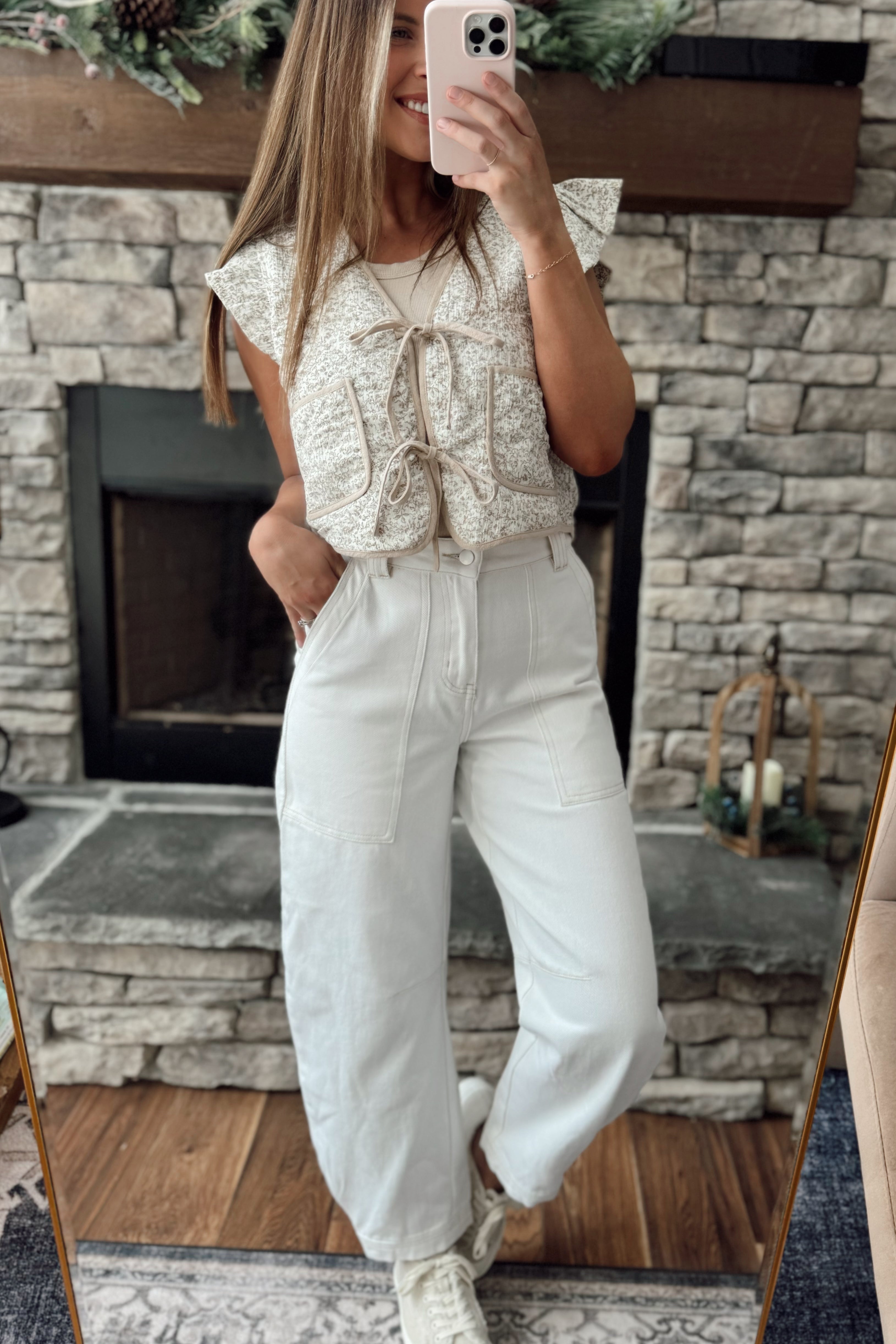 Trend Maker Ivory Balloon Fit Snap Button Straight Ankle Denim