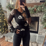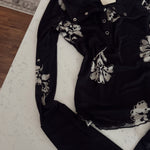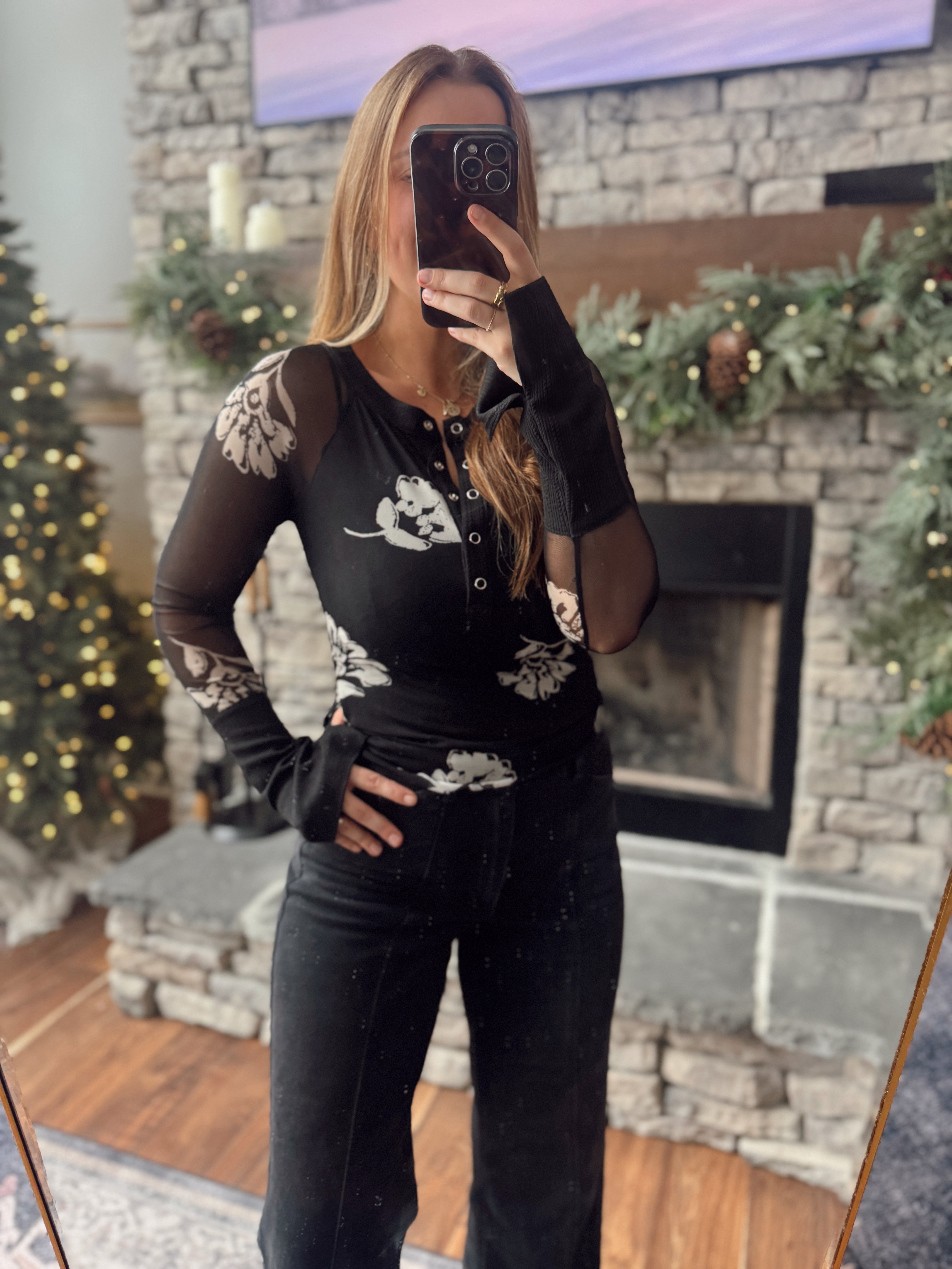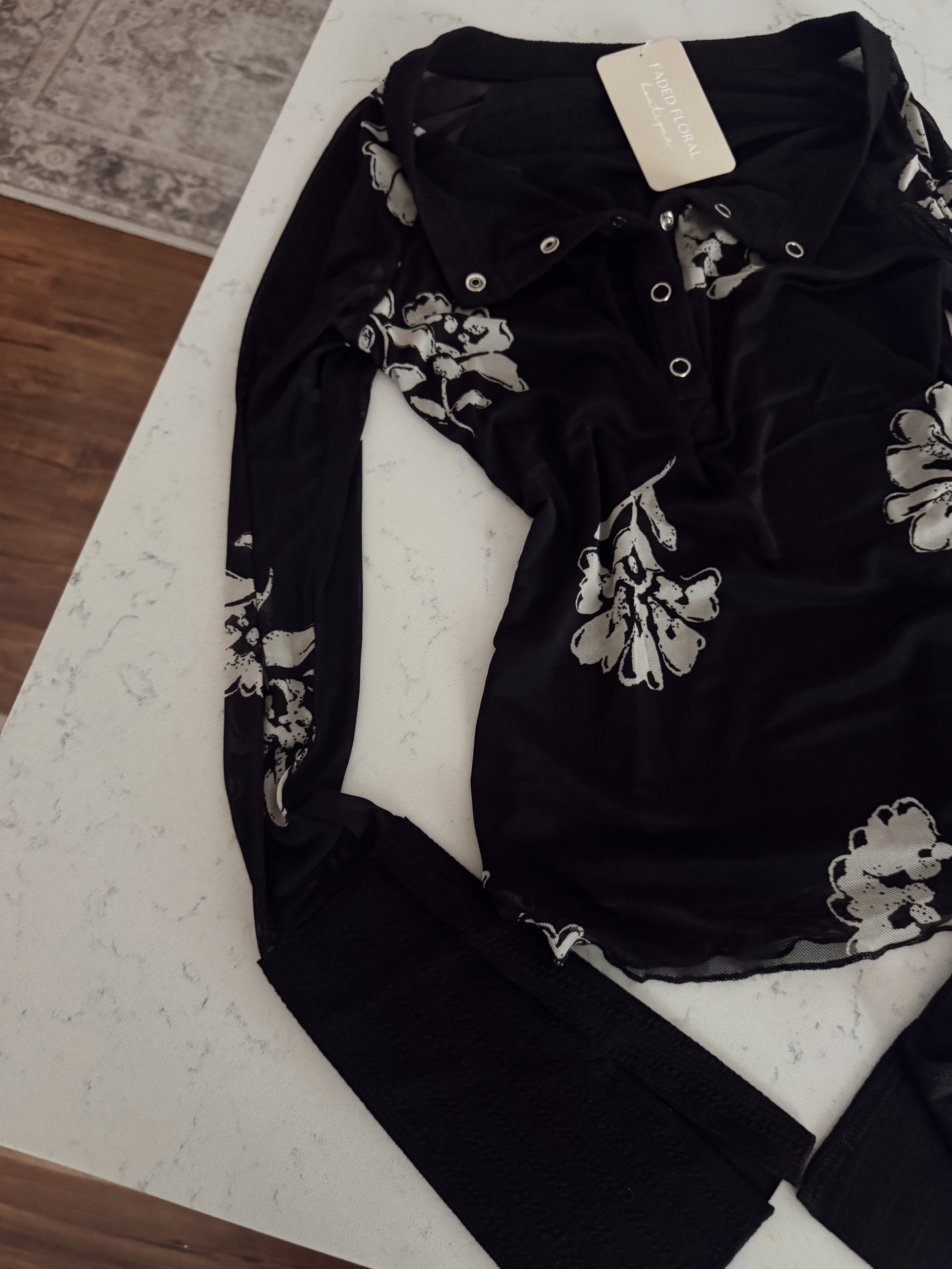 This one is a total showstopper. A sheer black mesh base with bold ivory florals, paired with a contrast solid cuff and henley neckline… she’s edgy, feminine, and ridiculously flattering. Lightweight, stretchy, and perfect for layering or wearing alone for a sleek, statement look.