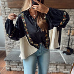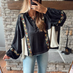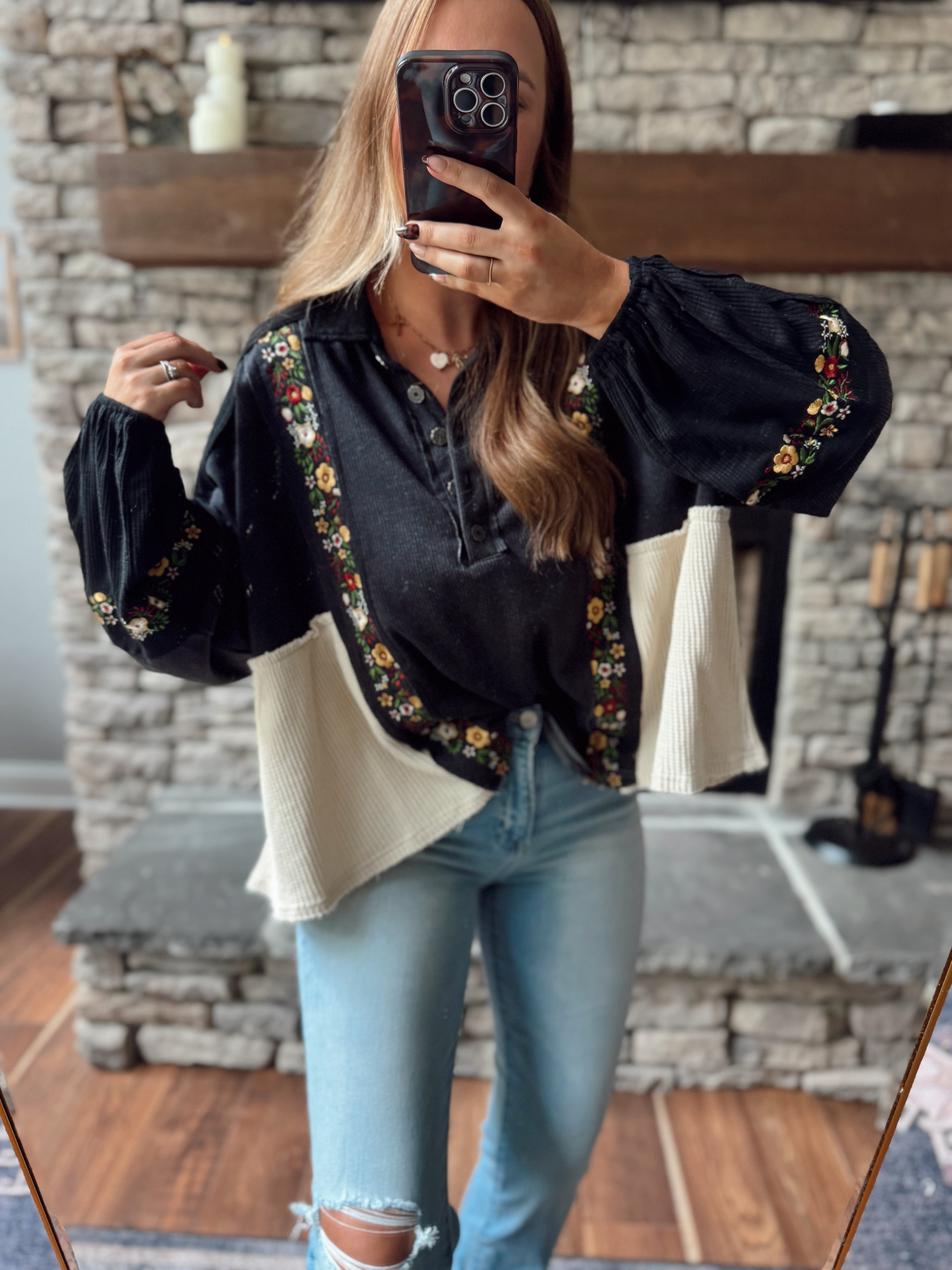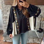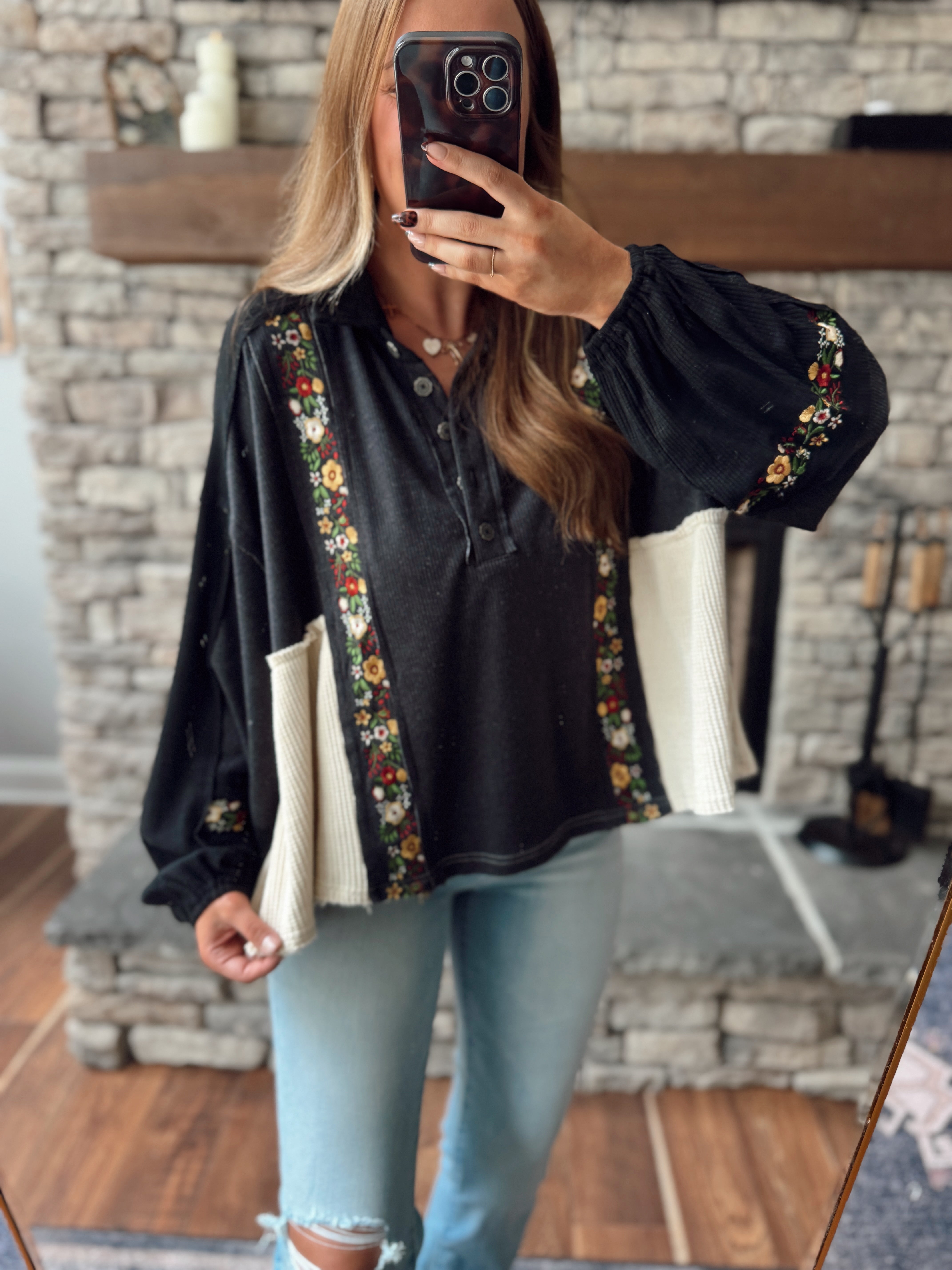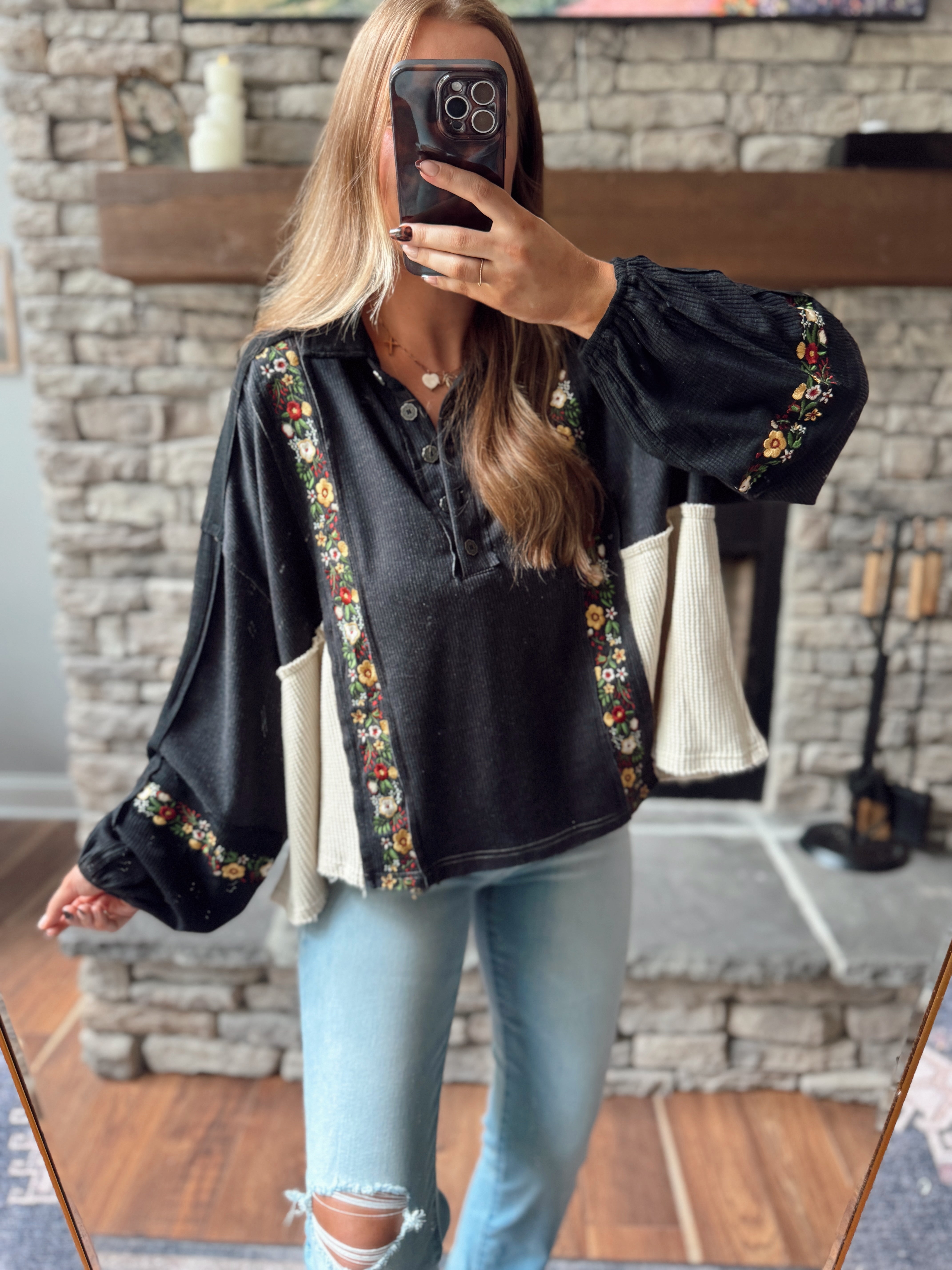 Boho charm meets cozy comfort. This pullover features a washed black base with eye-catching floral embroidery down the sleeves and bodice, balanced with contrasting cream knit side panels for that perfectly lived-in, free-spirited look. The relaxed fit and button-up neckline make it easy to throw on and go.