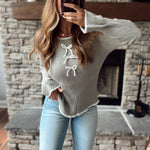 Soft, feminine, and effortlessly chic. This ribbed knit top is crafted from a luxe, buttery fabric that feels amazing on and offers just the right amount of stretch. The standout details? Adorable bow appliqués down the front and delicate contrast trim along the neckline, cuffs, and hem. Finished with a slightly flared sleeve and subtle lettuce edge for a pretty, elevated touch.
