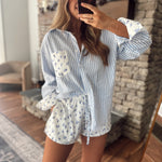 Sweet, soft, and a little bit coastal — the Henry Floral Contrast Button Down by Bucketlist is the statement staple your closet needs. Featuring classic blue-and-white stripes with delicate floral contrast on the pocket, cuffs, and inner lining, this top blends timeless style with a fresh, playful twist.