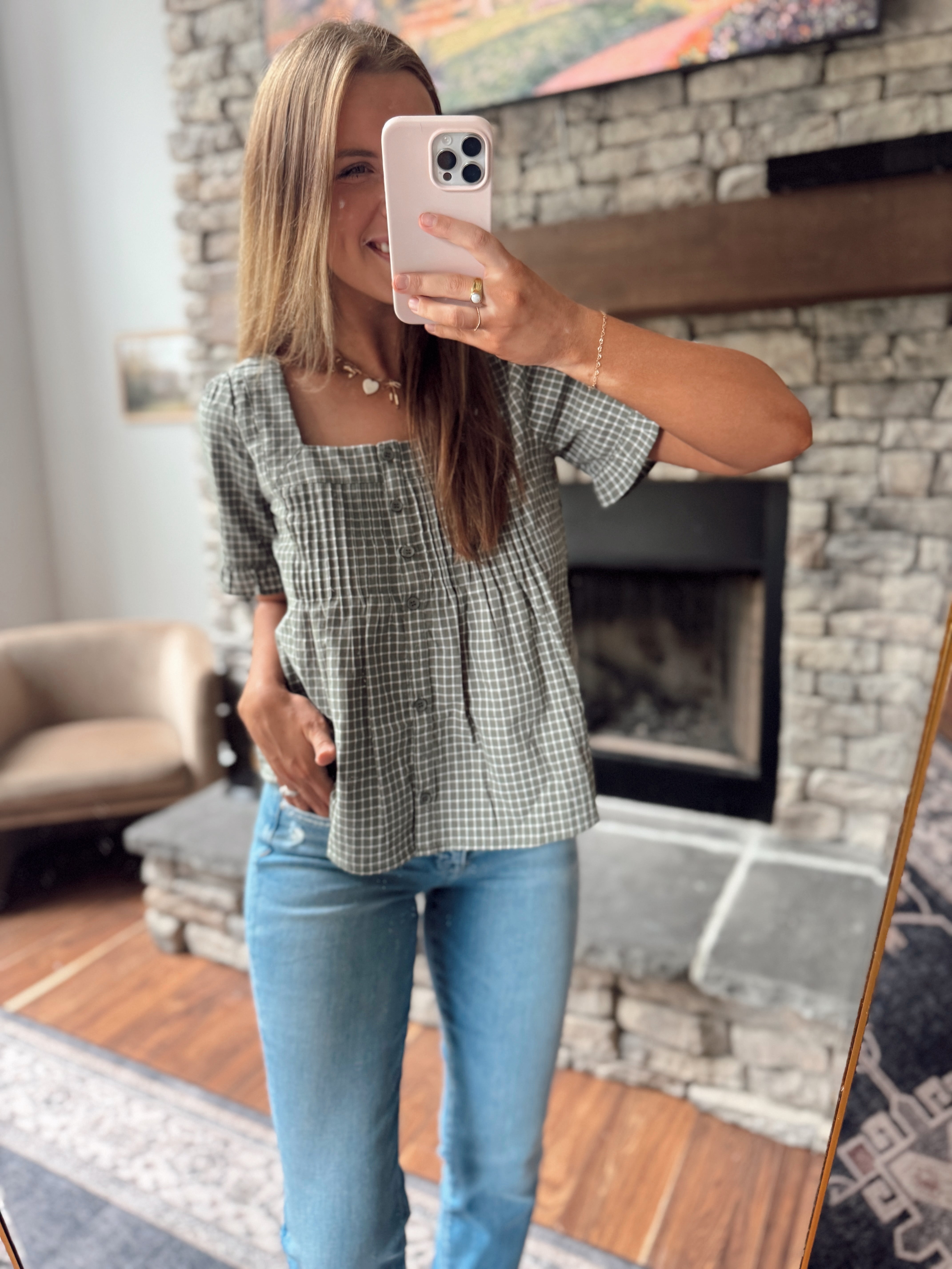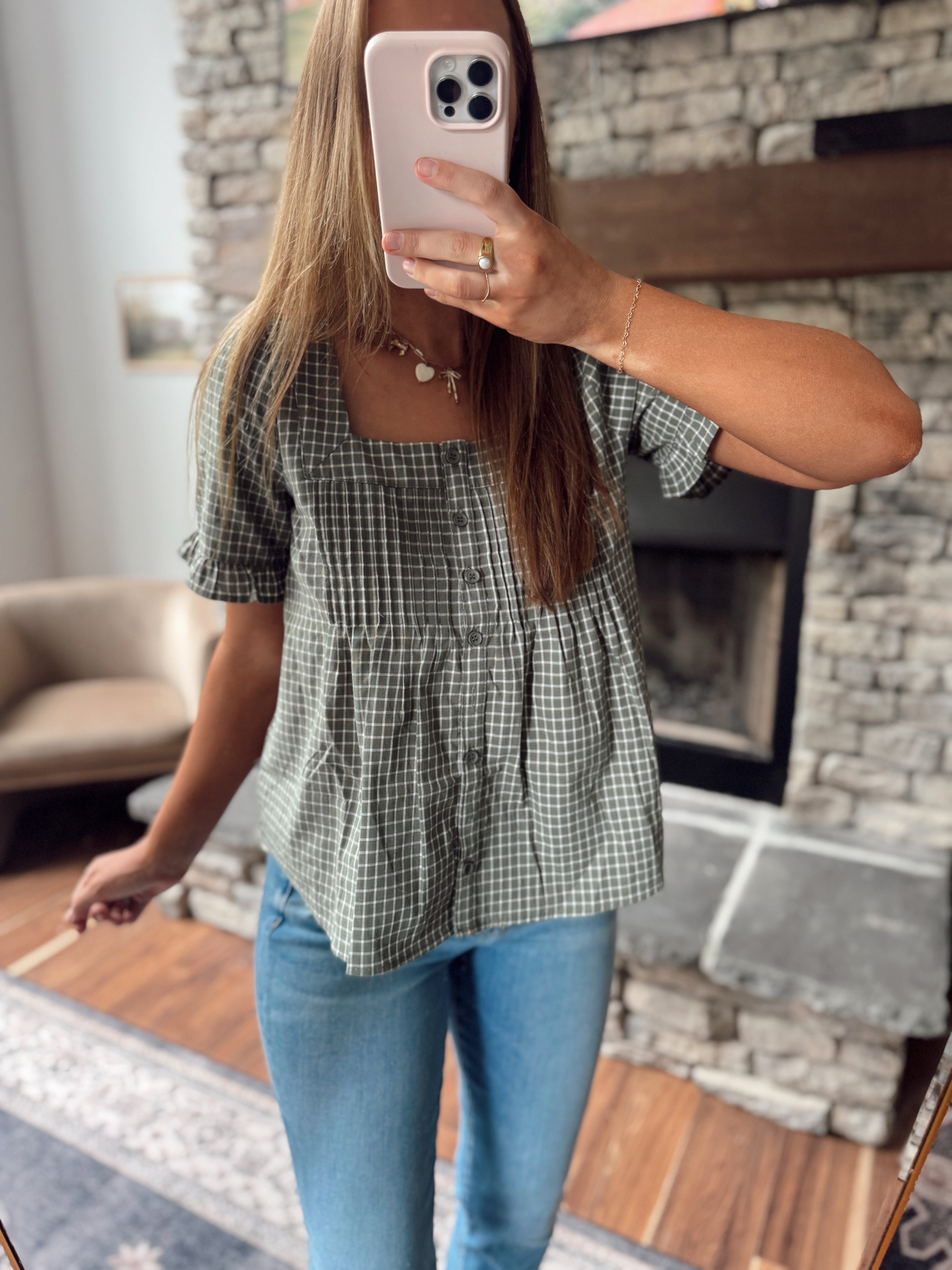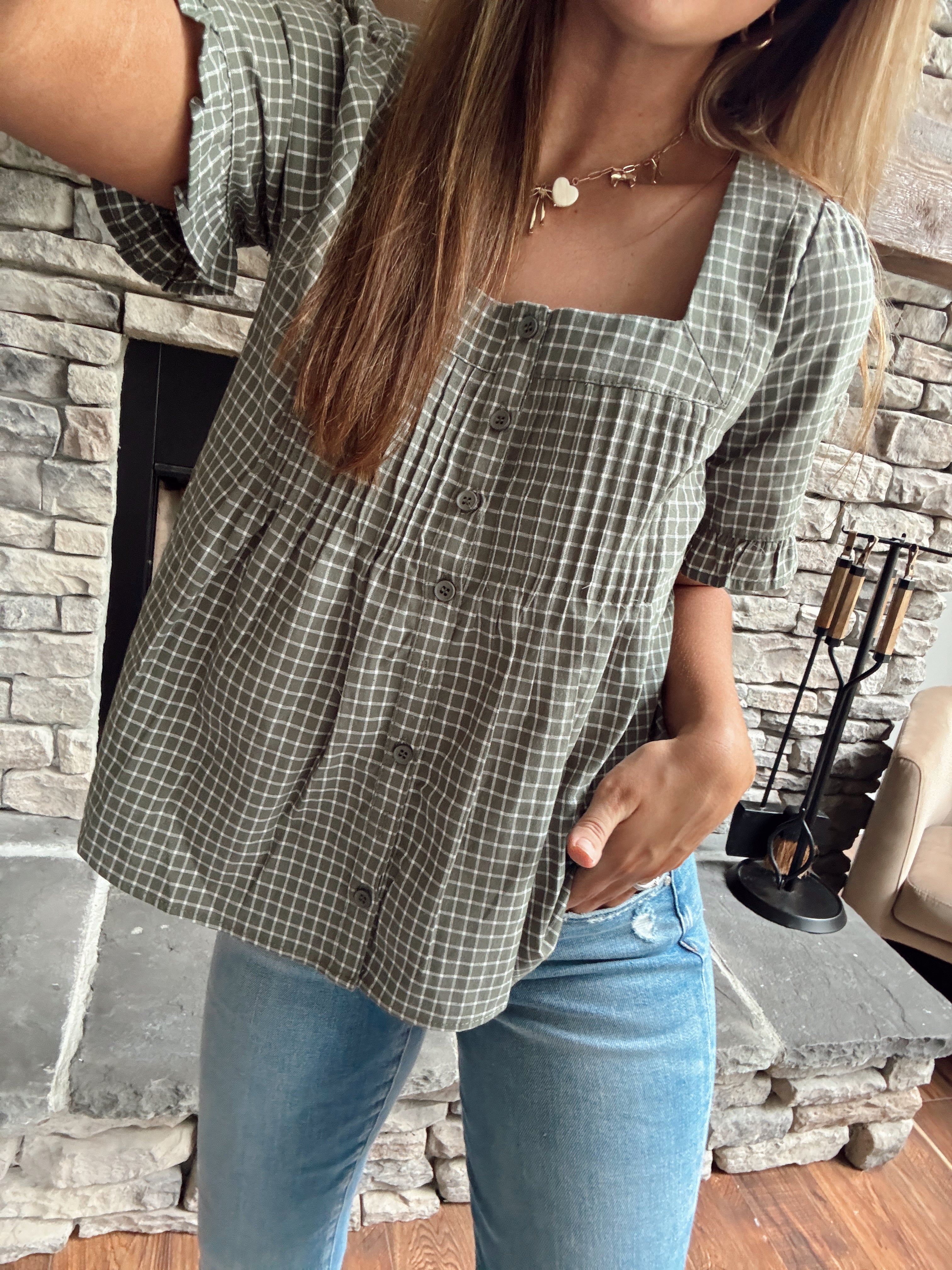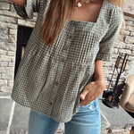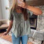 Olive/White Plaid Button Up Blouse