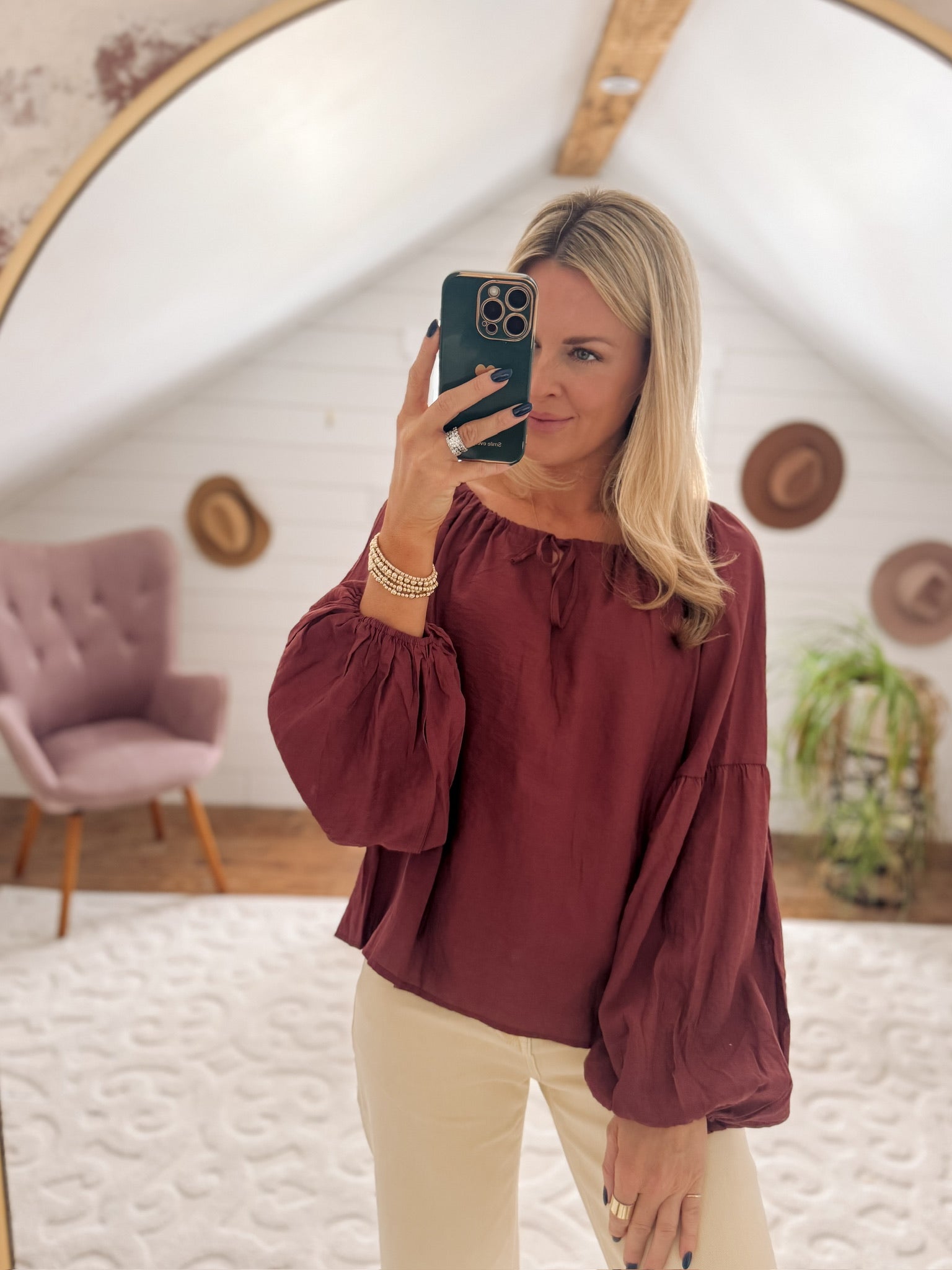 Slip into effortless elegance with this wine-hued drop shoulder blouse—the perfect piece for those days when you want to look put-together without trying too hard. The relaxed shoulder seam creates a flattering, modern silhouette that works beautifully layered or worn solo. Pair it with your favorite jeans for casual charm or dress it up for a night out. This versatile staple deserves a permanent spot in your wardrobe.