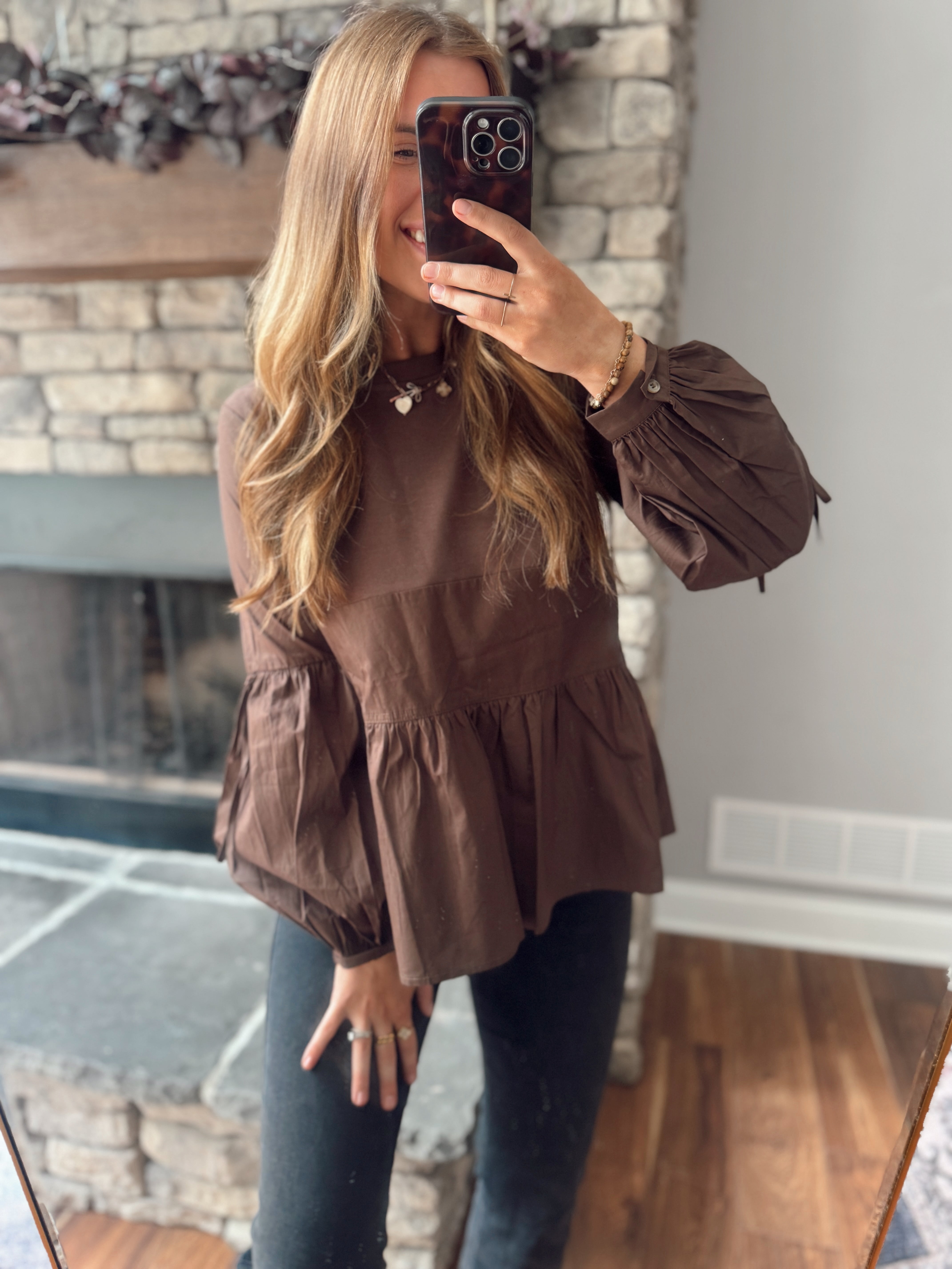 Dark Brown Peplum Puff Blouse