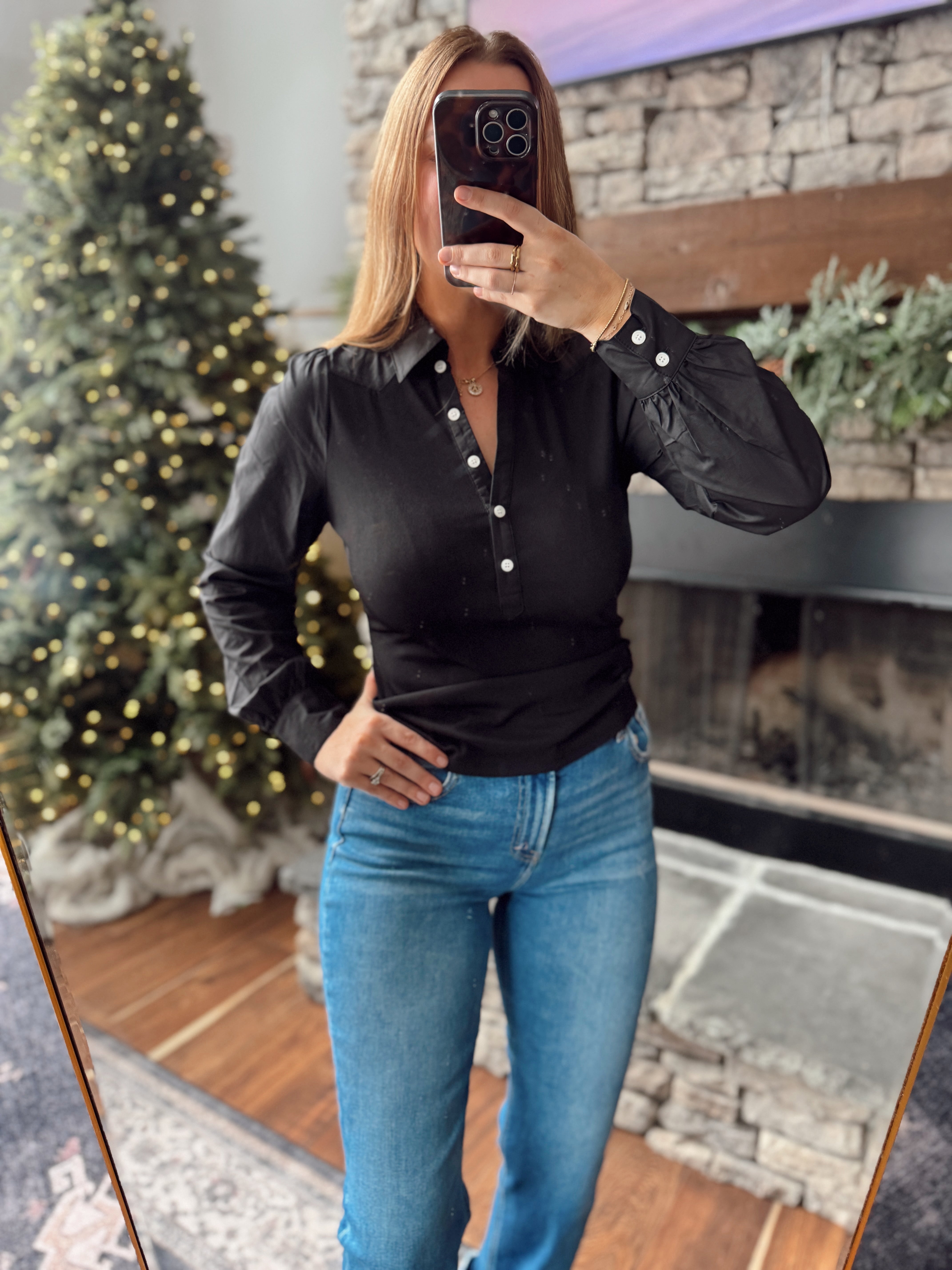 Indigo Washed Stretch Satin 3/4 Puff Sleeve Blouse