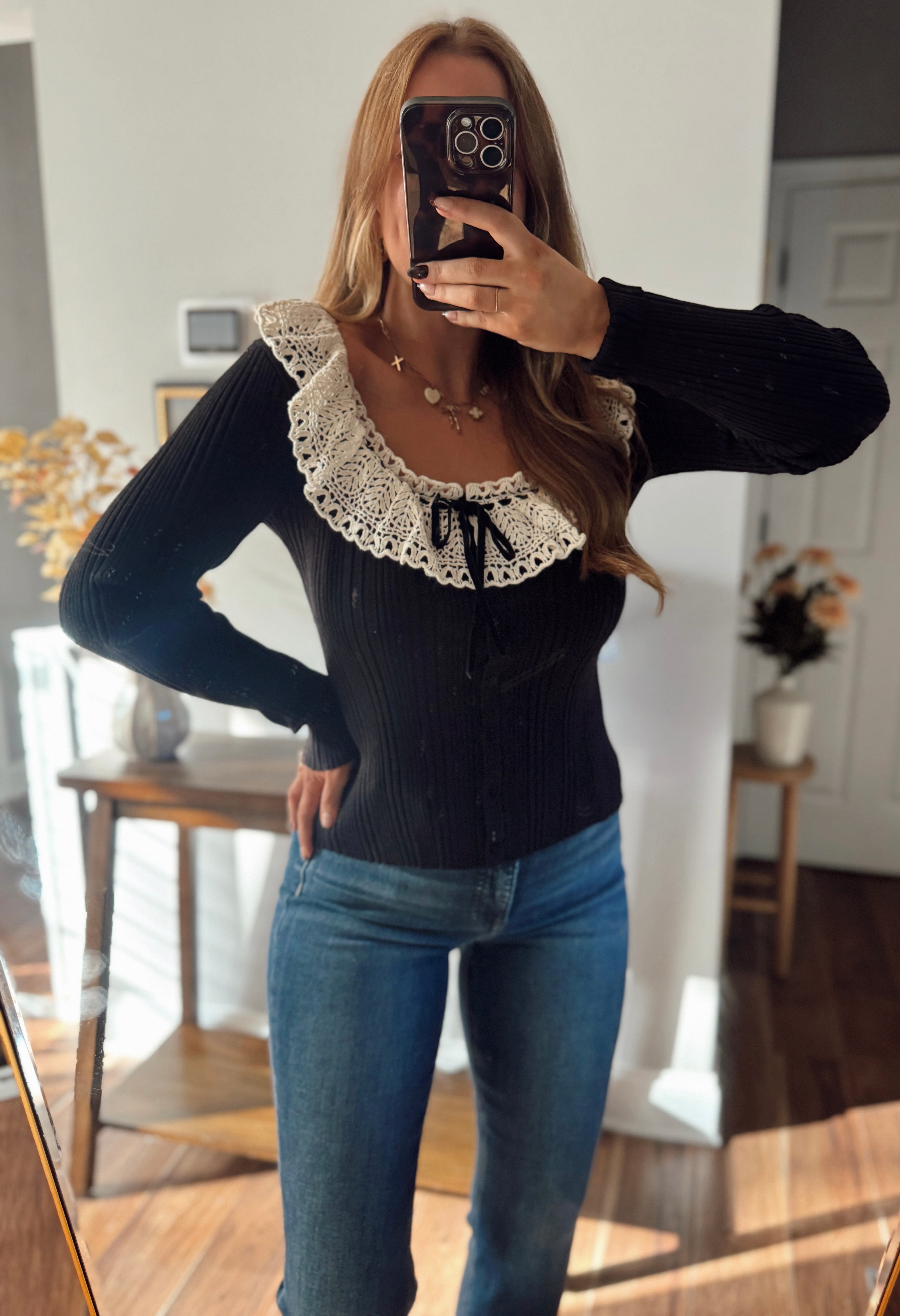 Black Lace Yoke Long Sleeve Top