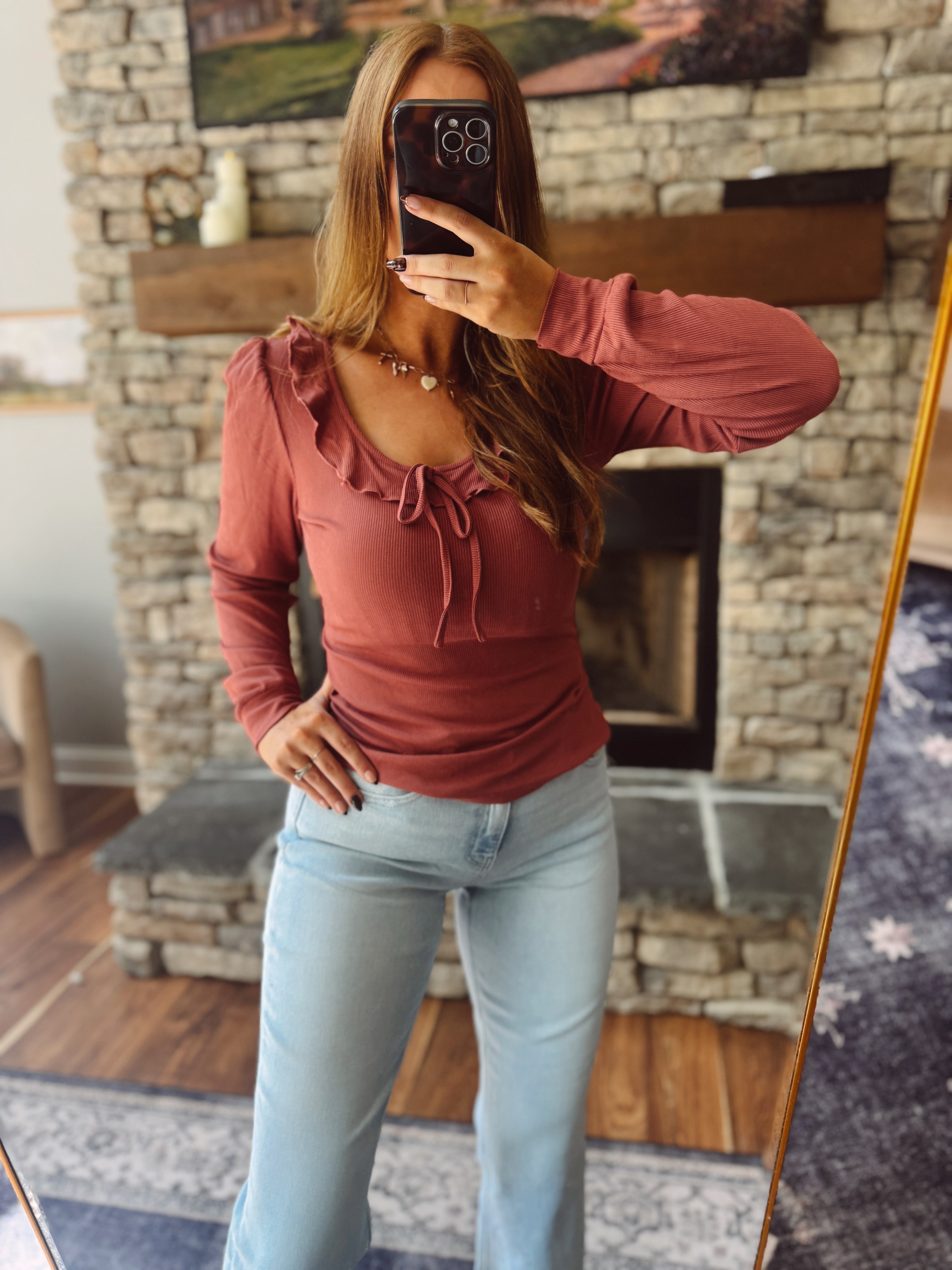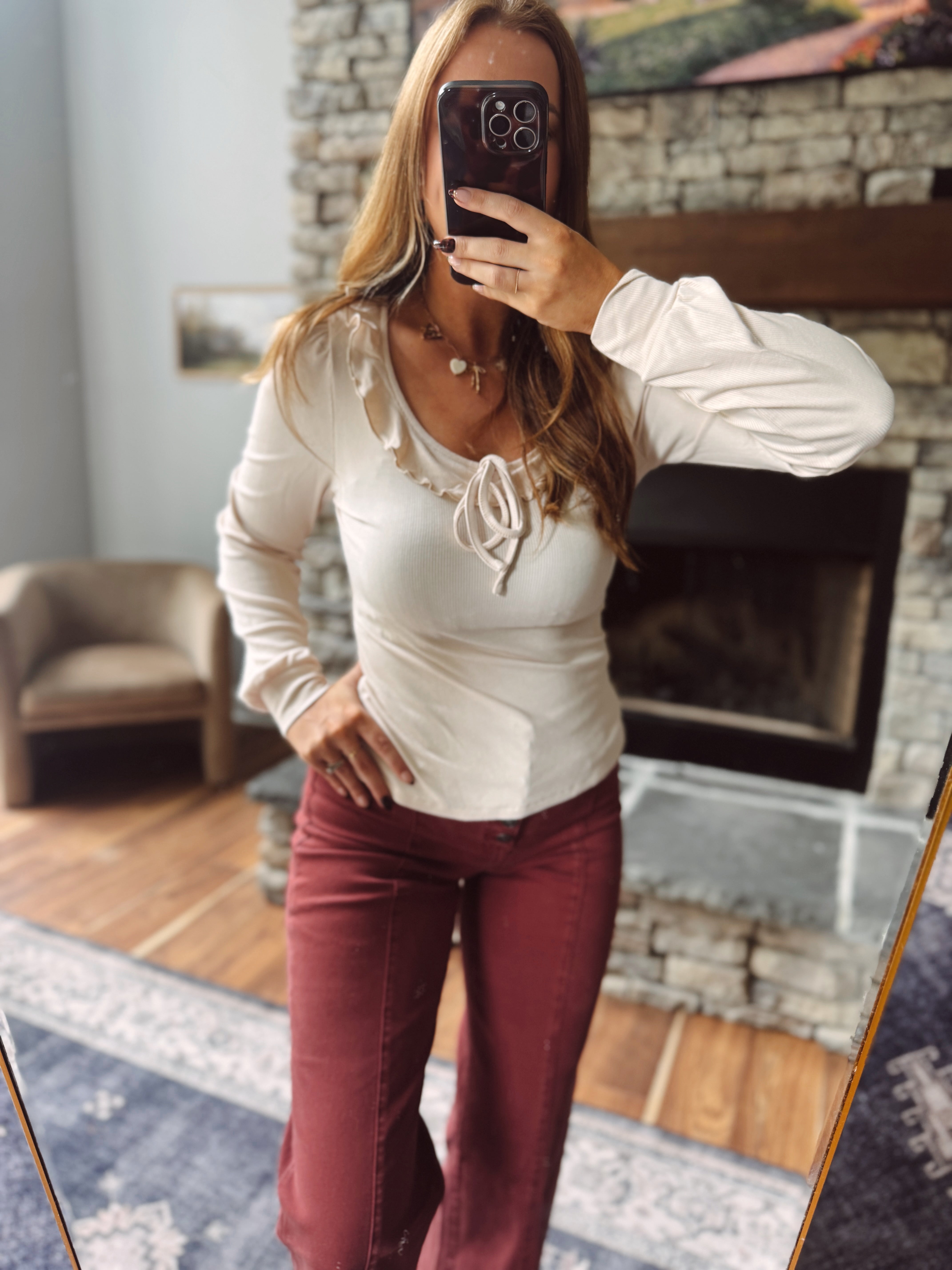 Marsala Scoop Neck Ruffle Detail Top