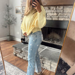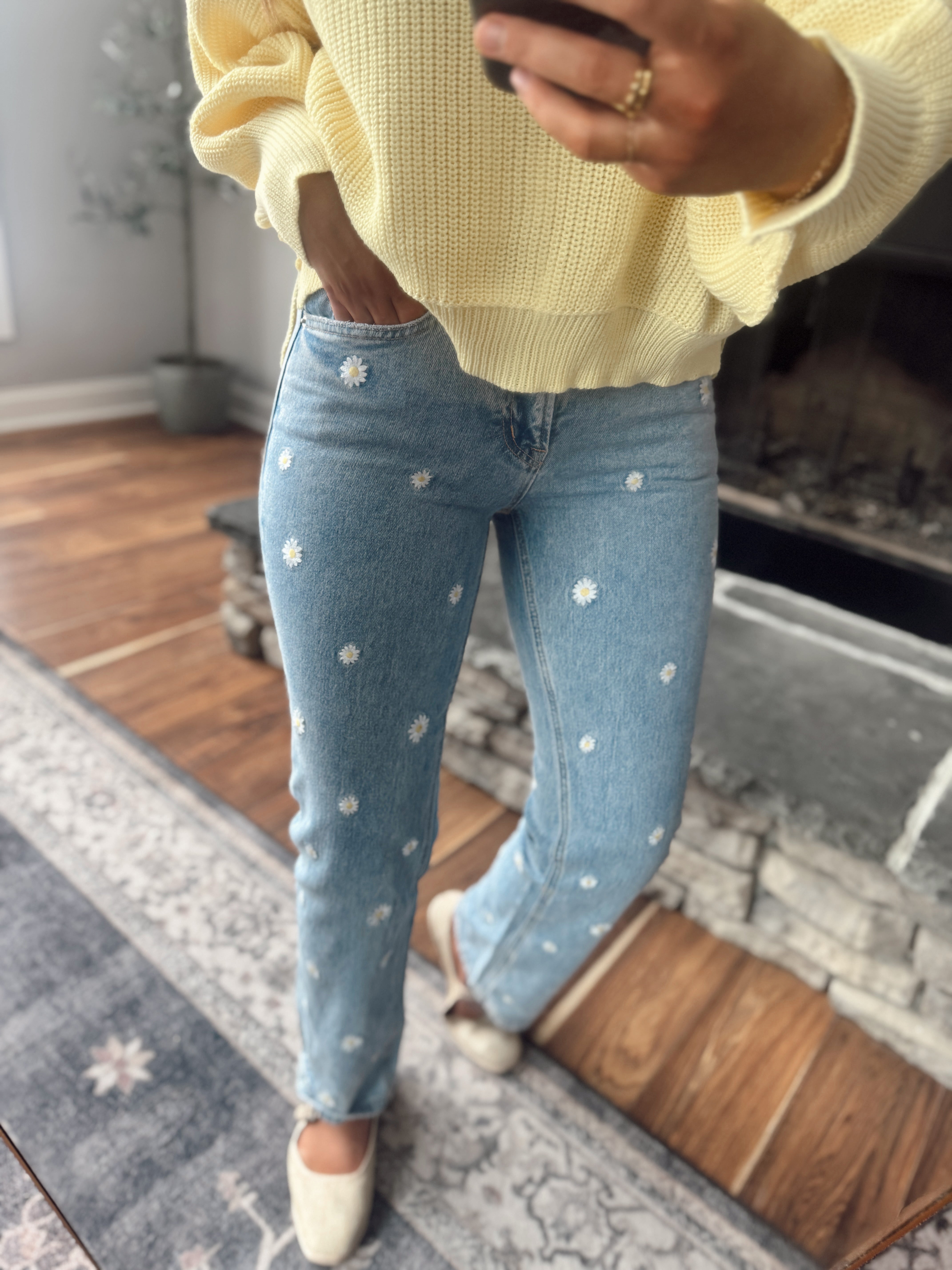High rise straight leg w/ embroidery jeans 70% cotton, 29% tencel, 1% span Front rise : 10 1/2" Inseam : 30" Leg opening : 16"