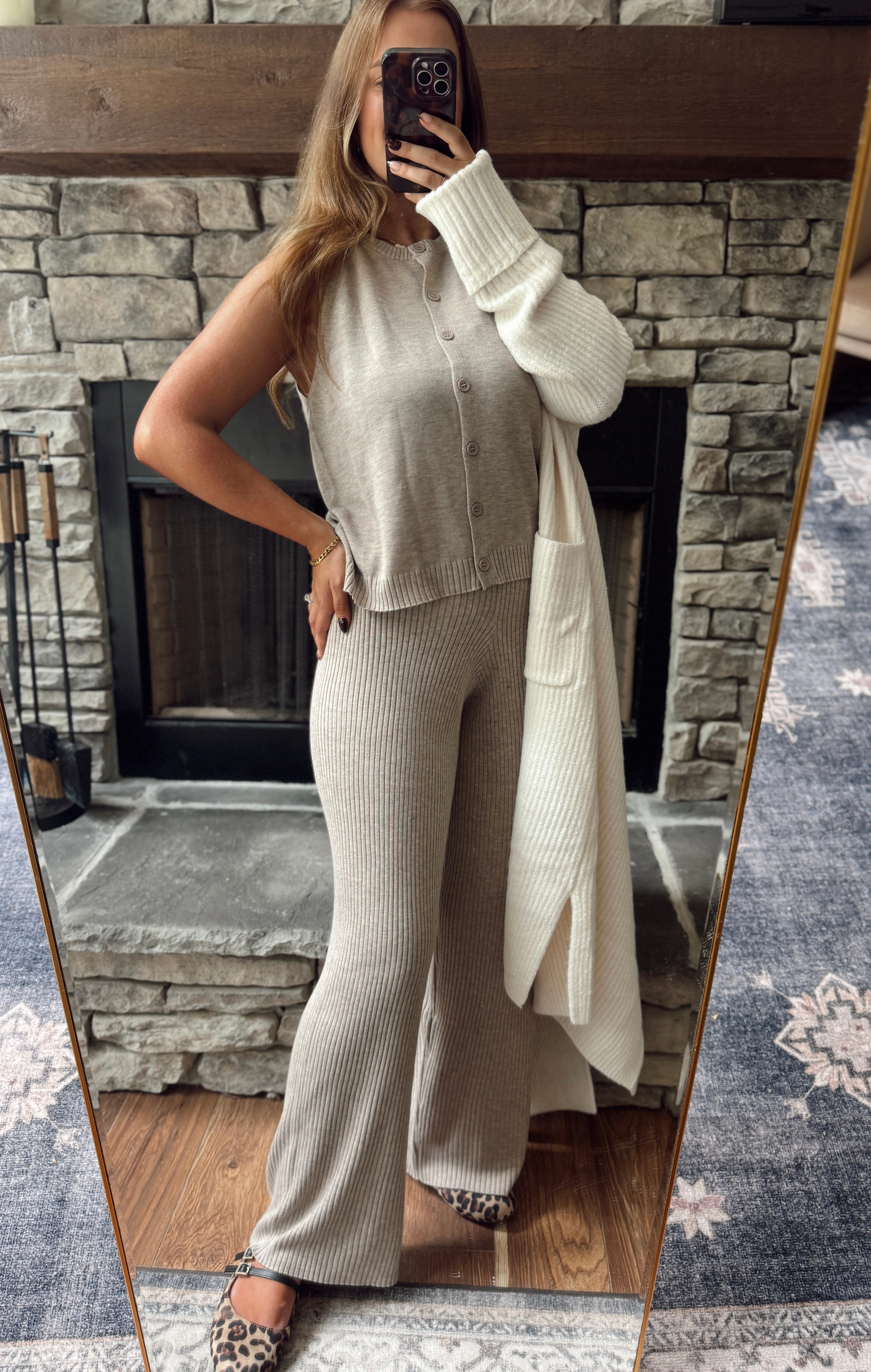 Luxe comfort, effortless style—this Wishlist knit set is everything. Featuring a sleeveless button-front top and wide-leg ribbed knit pants, it’s made for those days when you want to look put-together but feel like you’re in loungewear. The soft knit fabric drapes beautifully while still keeping its shape, and the relaxed fit makes it so easy to wear.