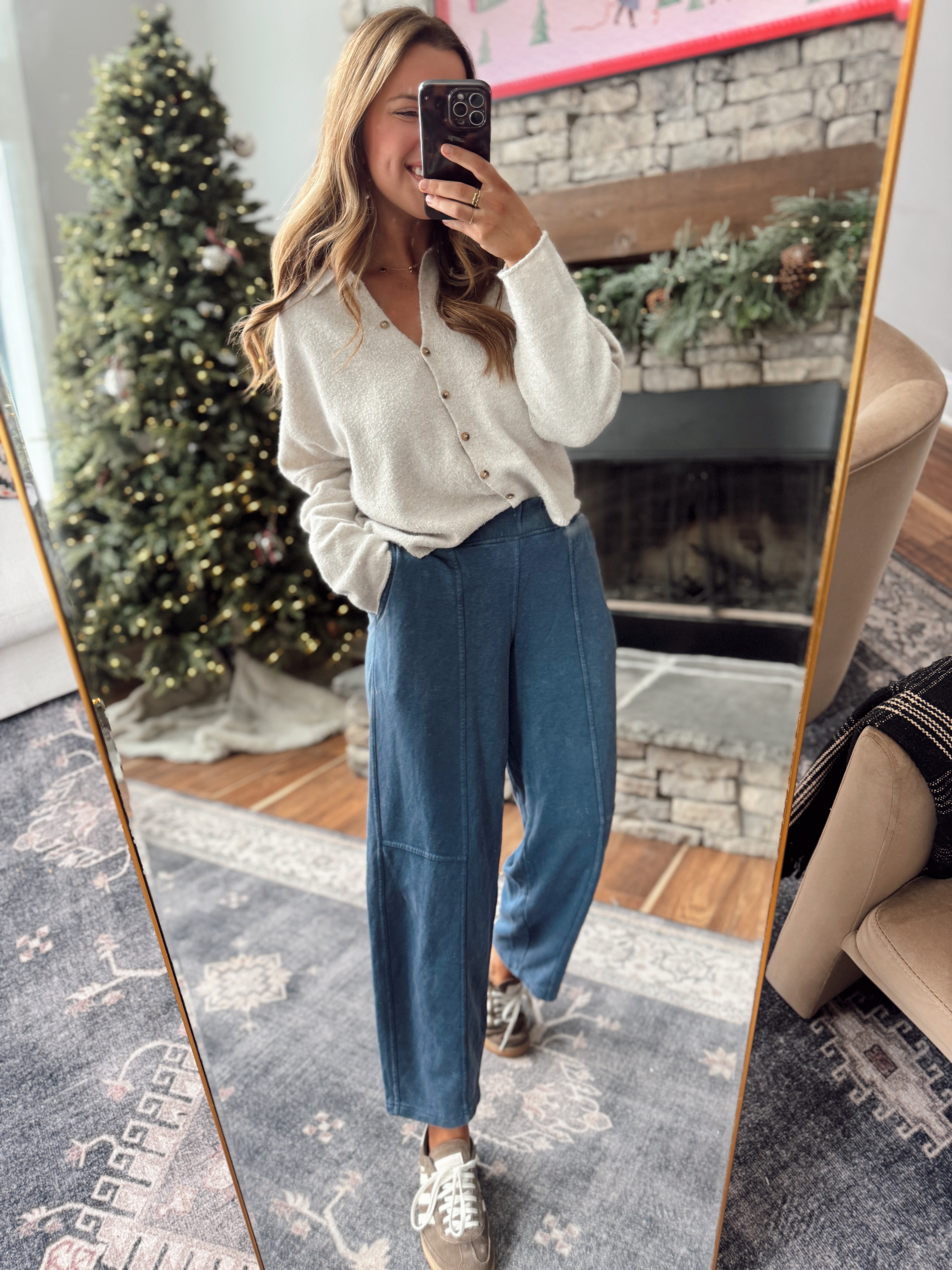 Step into effortless comfort with these relaxed barrel-leg lounge pants. Featuring a soft washed fabric that drapes beautifully, they bring that perfectly broken-in feel from the first wear. Designed with a roomy fit through the leg, subtle seam detailing, and an easy elastic waistband, they’re made for slow mornings, errands, or cozy nights in.