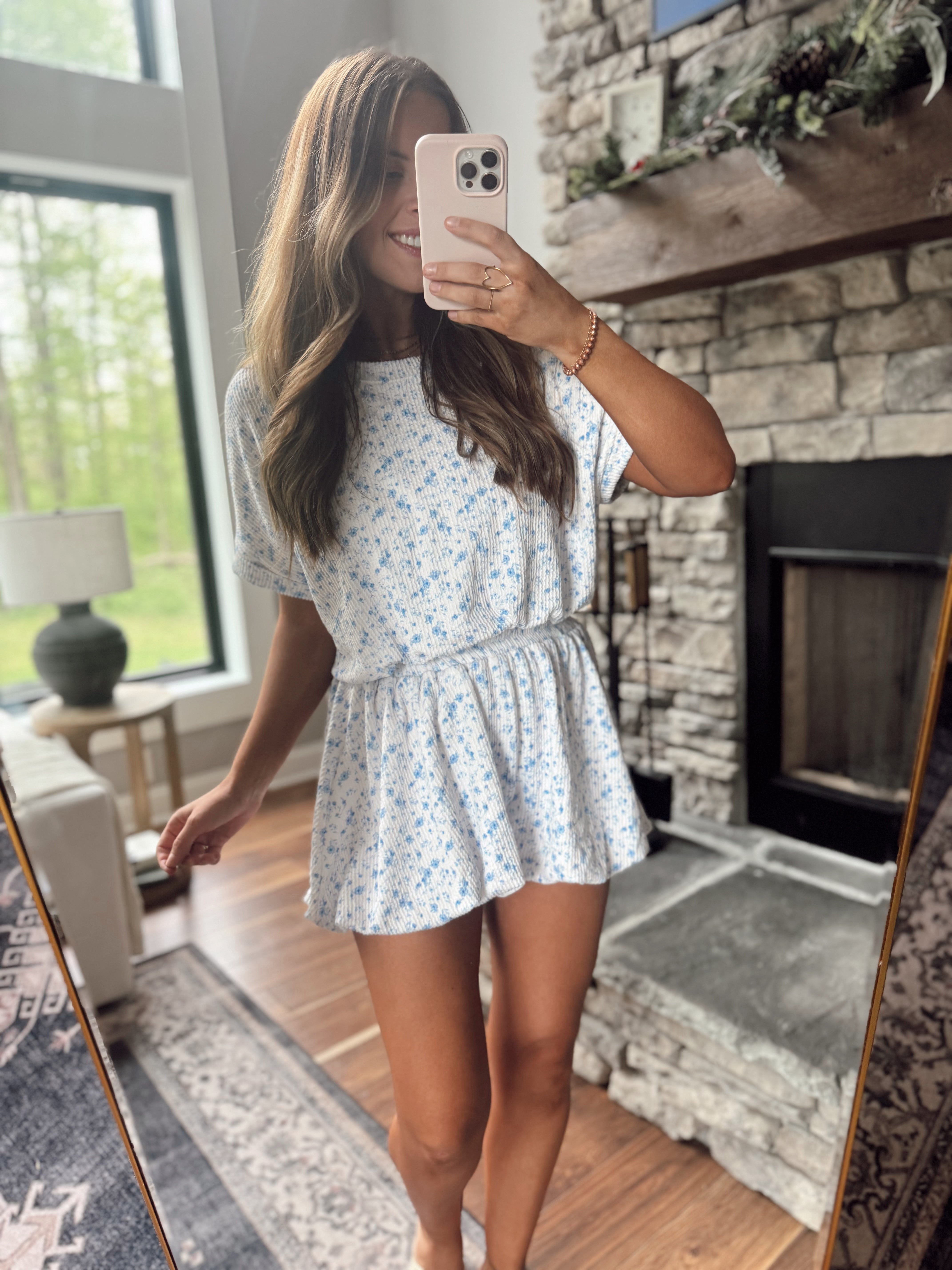 Brielle Blue/White Ribbed Floral Bubble Hem Short Sleeve Top
