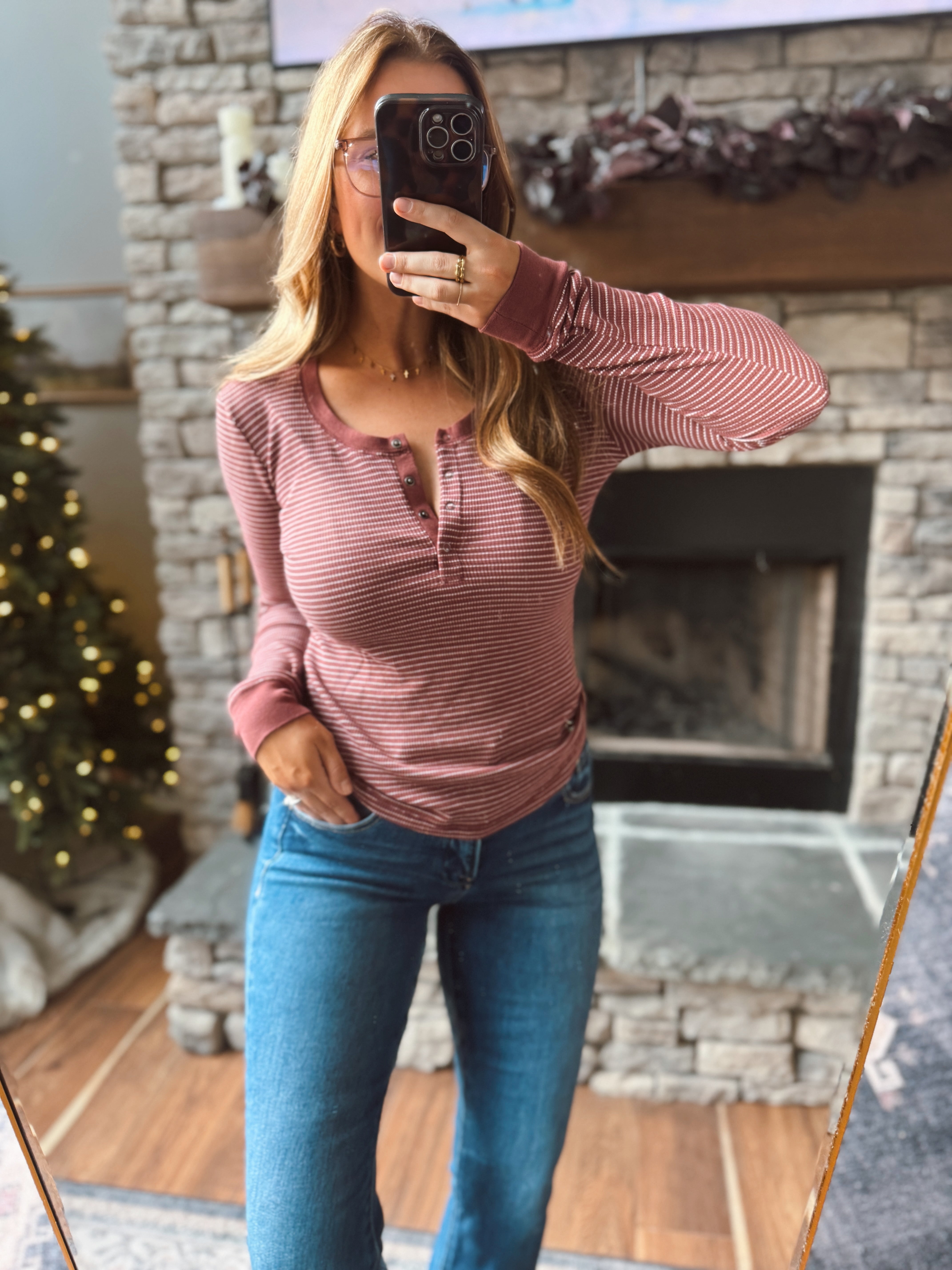 Our burgundy striped Henley adds the perfect pop of warm color to your fall and winter wardrobe. The soft, stretchy knit and functional snap buttons make it both flattering and functional. Style it solo or layer it under your favorite cardigan for a relaxed, put-together look.