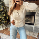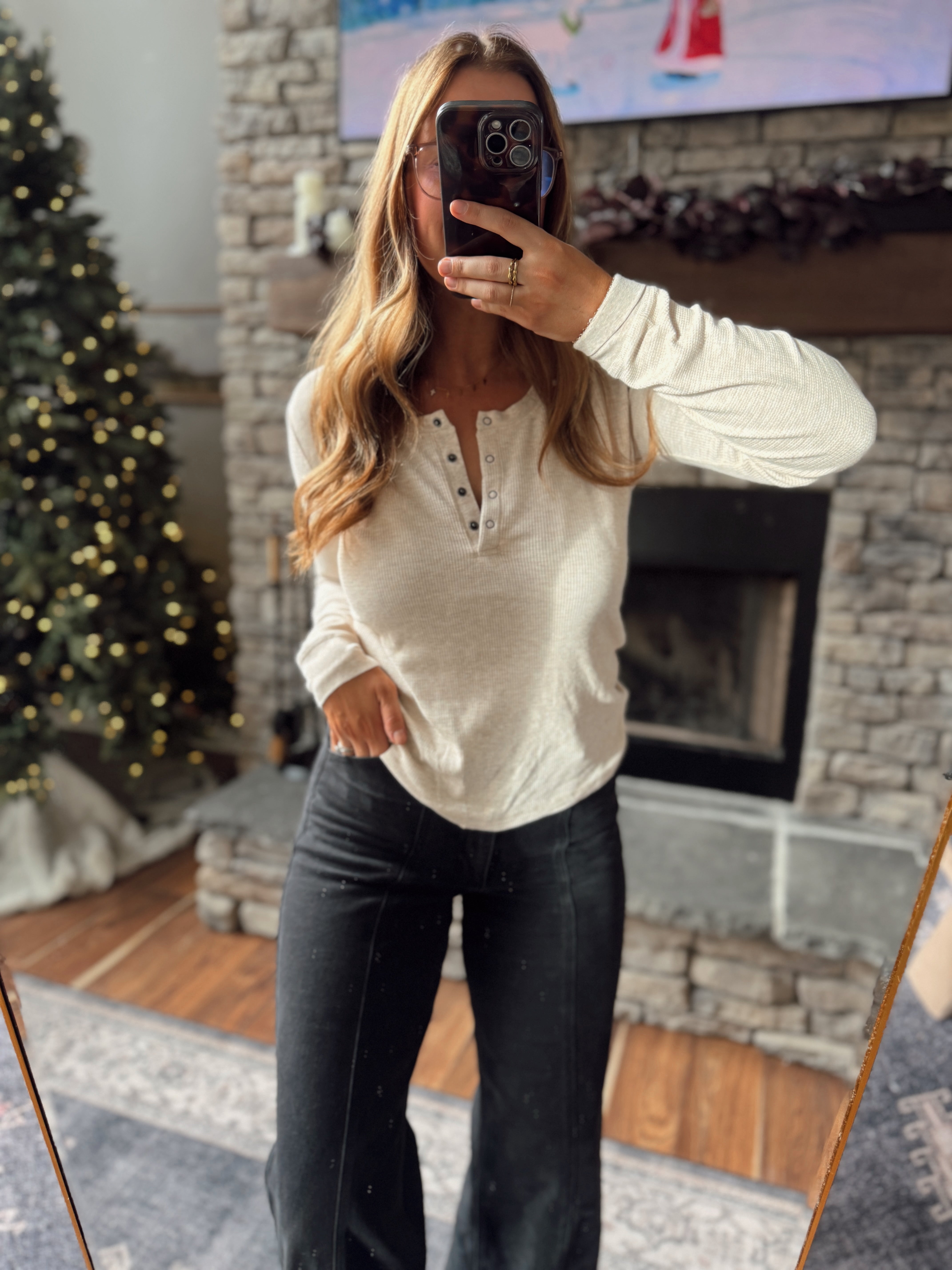 This cozy waffle-knit Henley features a soft blend of cotton and modal with just the right amount of stretch. Designed with working snap buttons, a scoop neckline, and a true-to-size fit that flatters every shape. The oatmeal tone makes it easy to pair with denim, joggers, or your favorite shacket for that effortless, lived-in look.