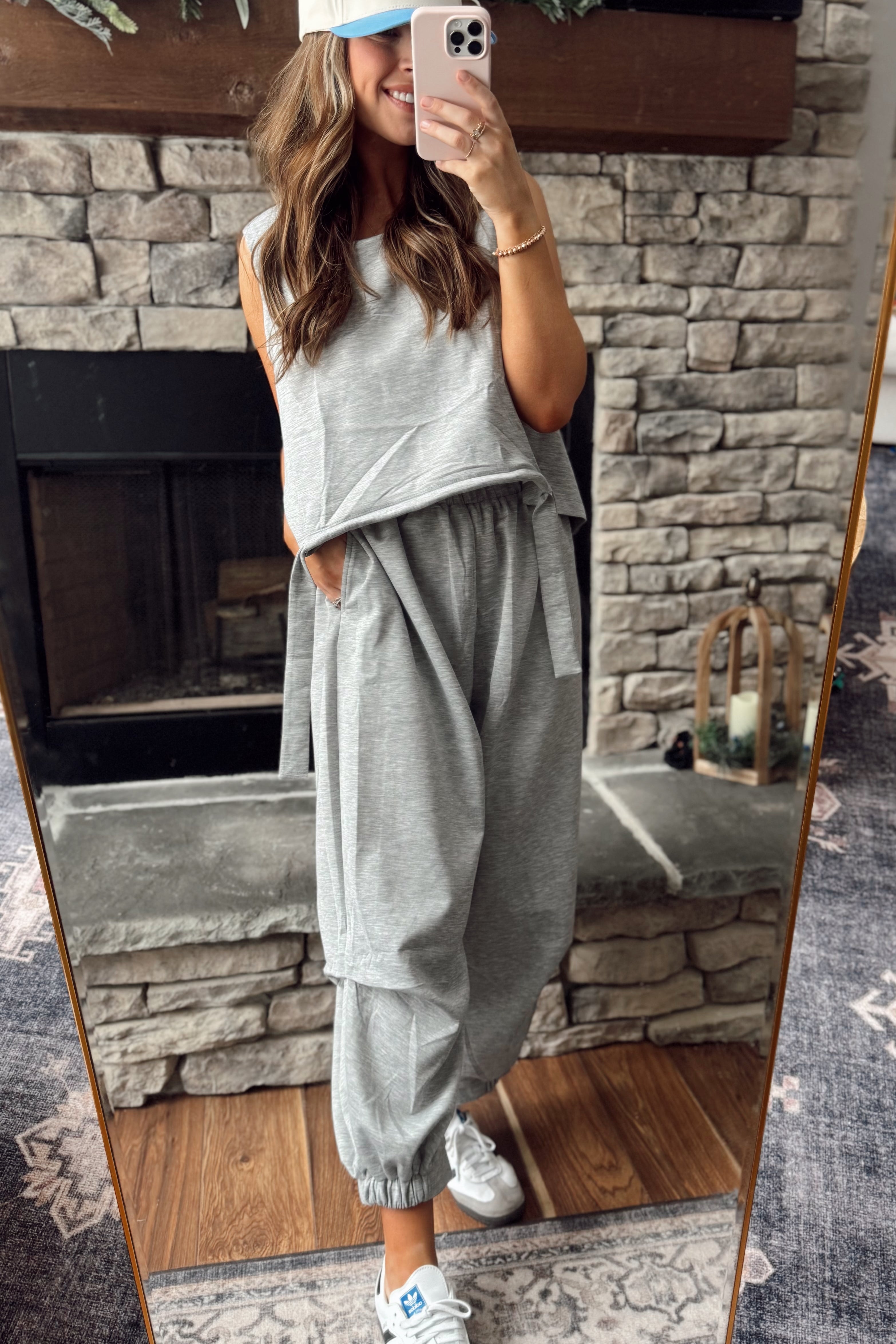 Bust a Move Grey Cap Sleeve Cinch Tie Top with Baggy Pant Set