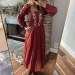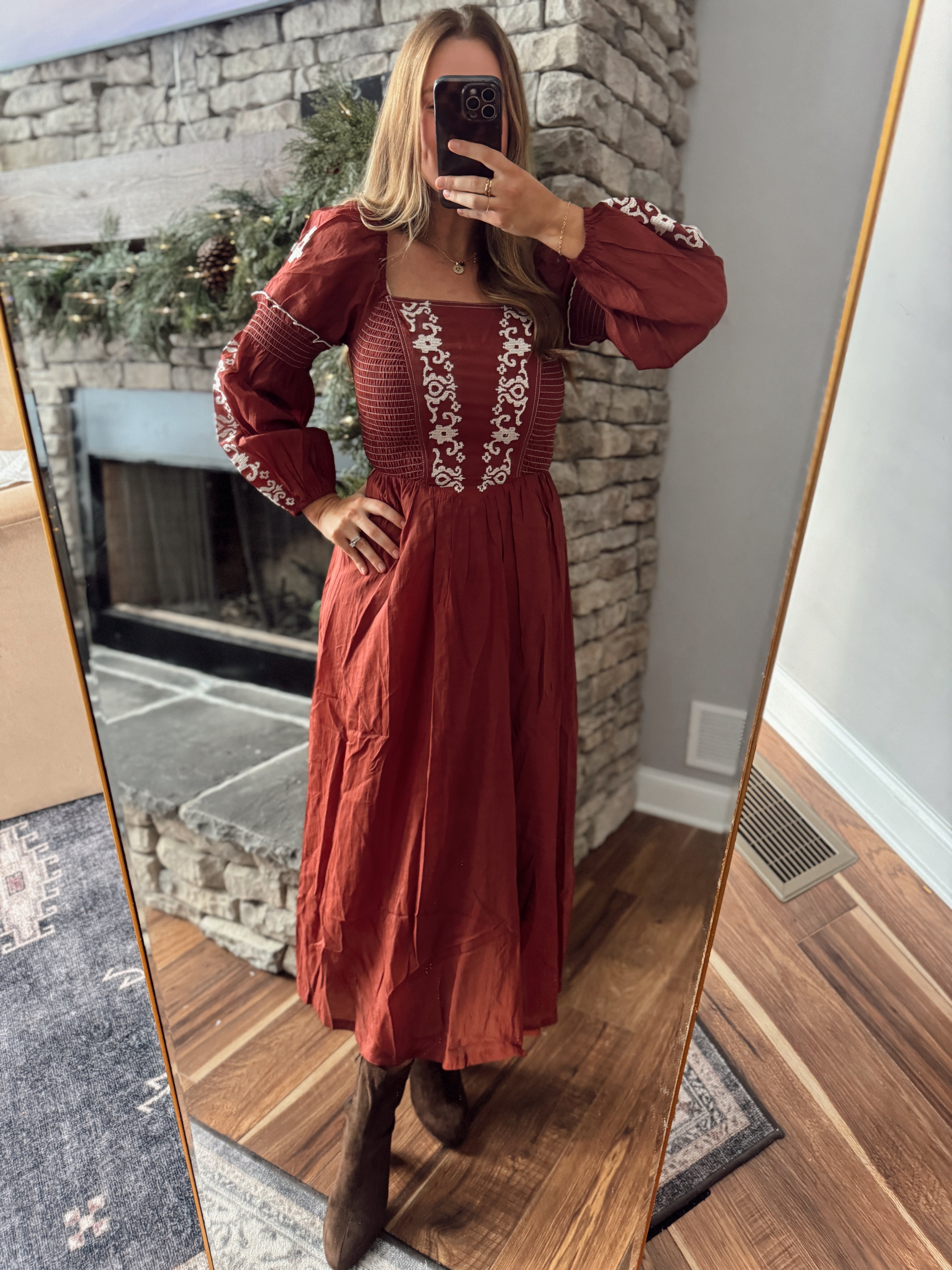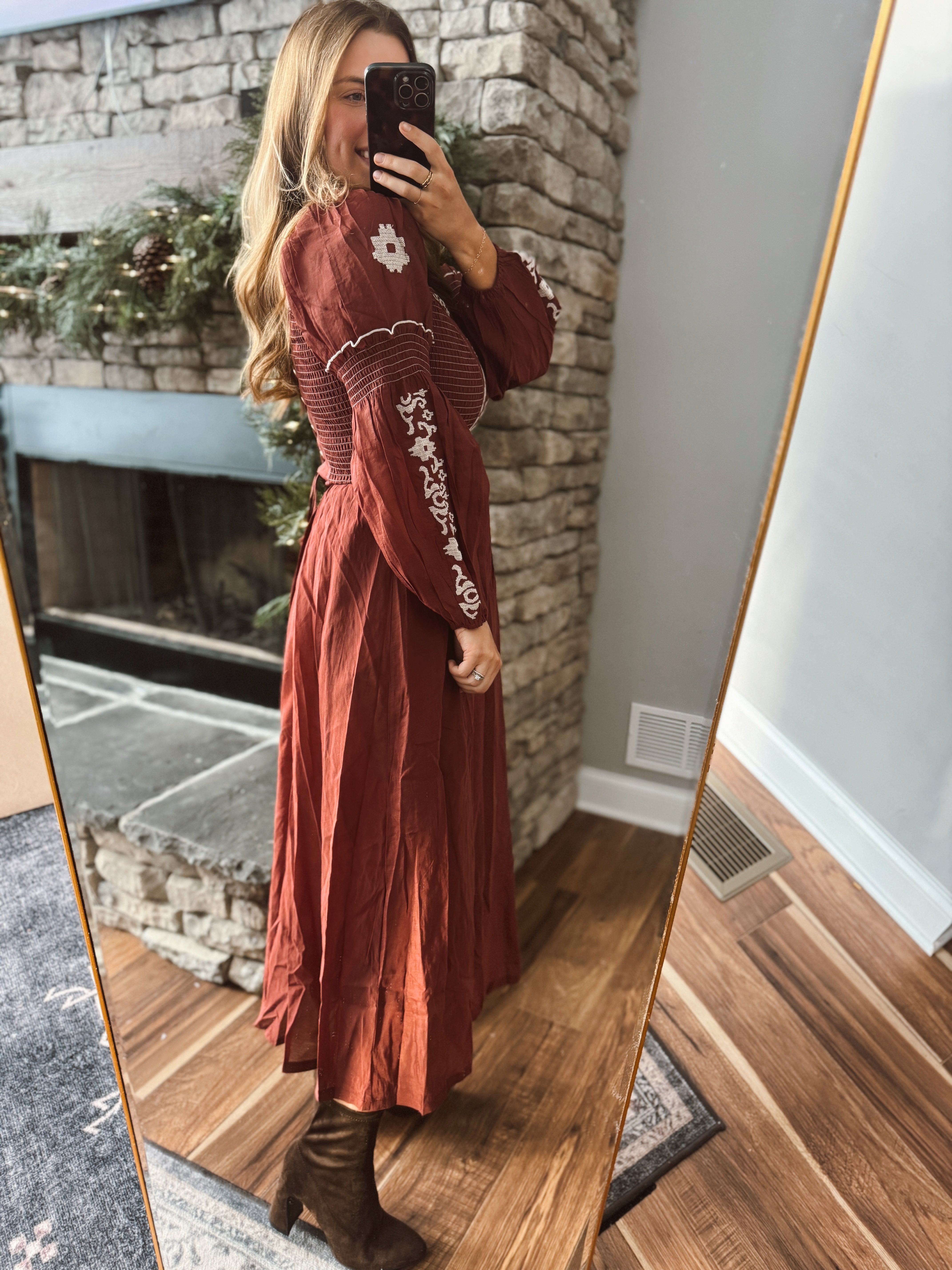 Romantic, timeless, and absolutely breathtaking — this cream embroidered maxi is a full boutique moment. Featuring a smocked bust for a flattering, comfortable fit and beautifully detailed embroidery along the sleeves and bodice, it’s the perfect dress for holiday photos, weddings, church, or any “I want to feel pretty” day.