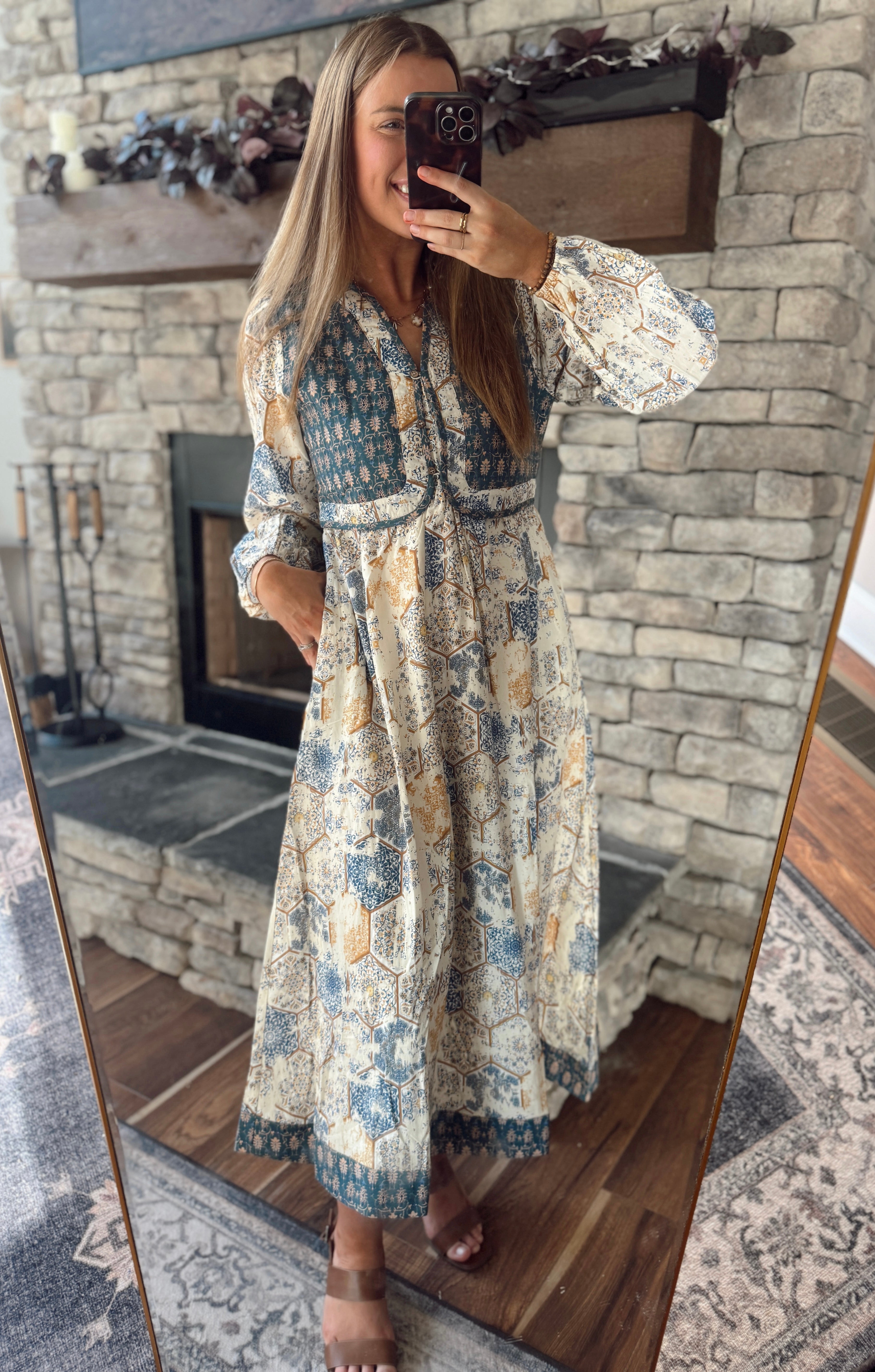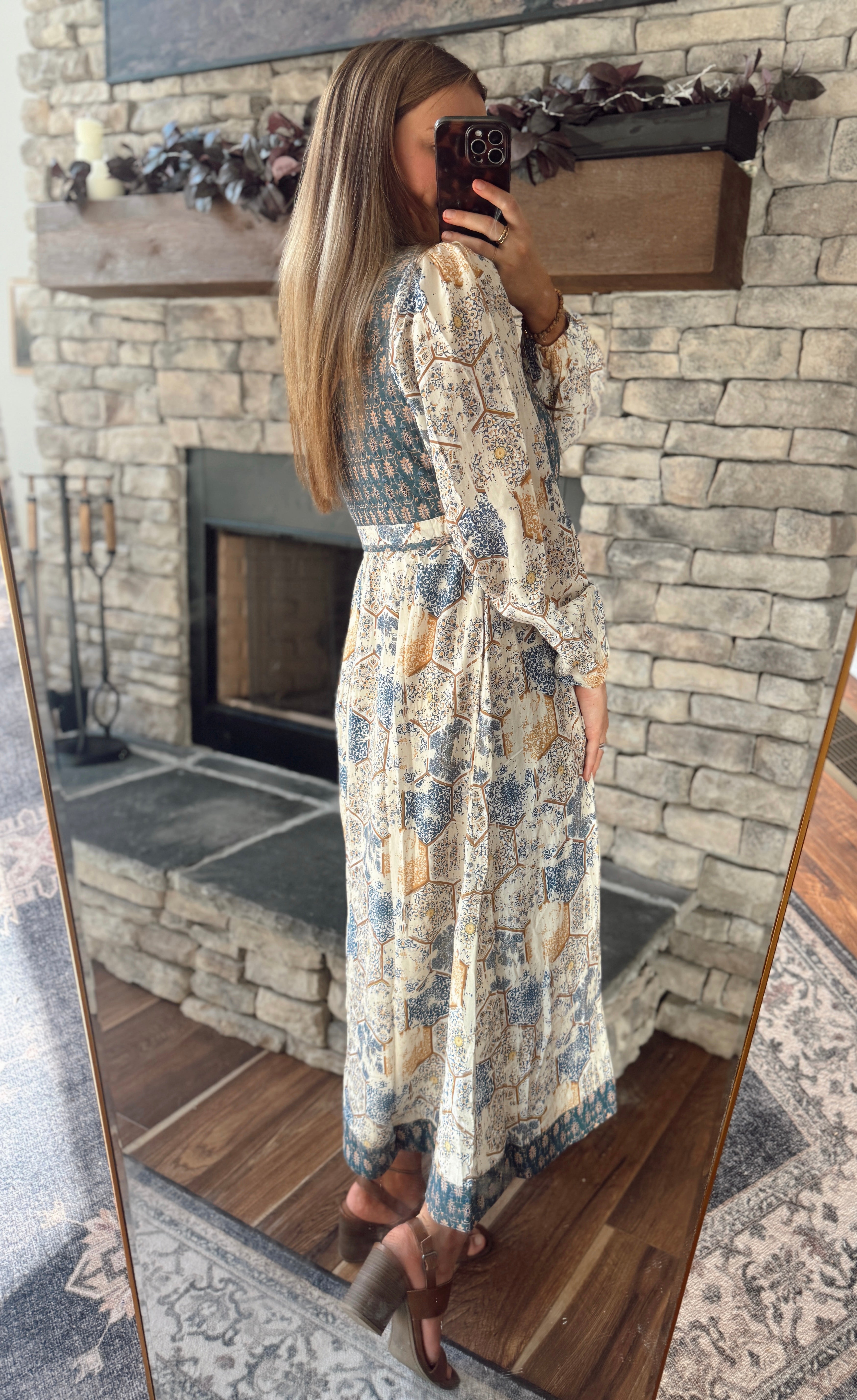 This dress is a whole vibe — romantic, flowy, and effortlessly elevated. With its mixed patchwork print, flattering empire waist, and soft flowy fabric, it’s the perfect piece for brunch, fall weddings, or your next weekend getaway.