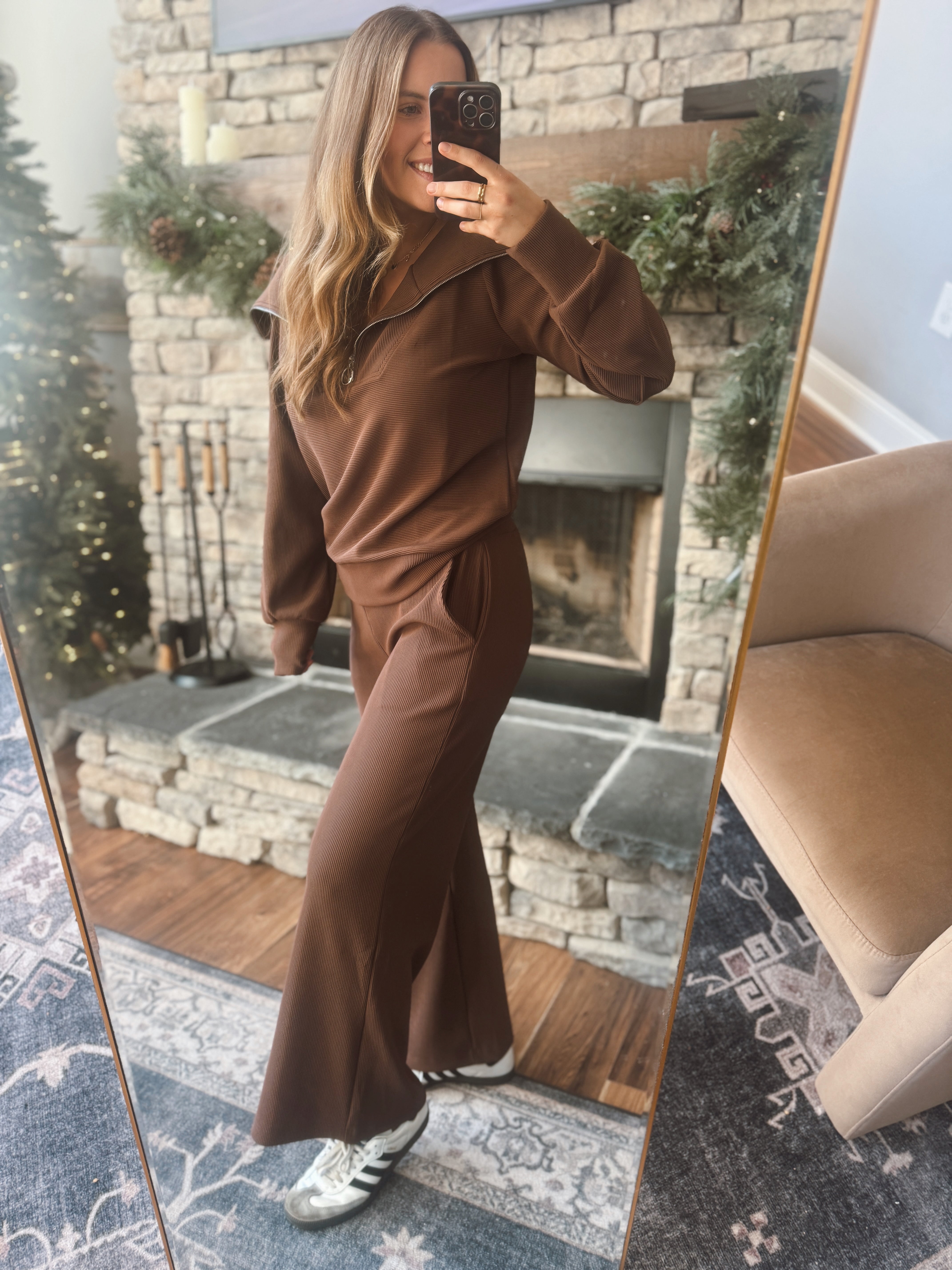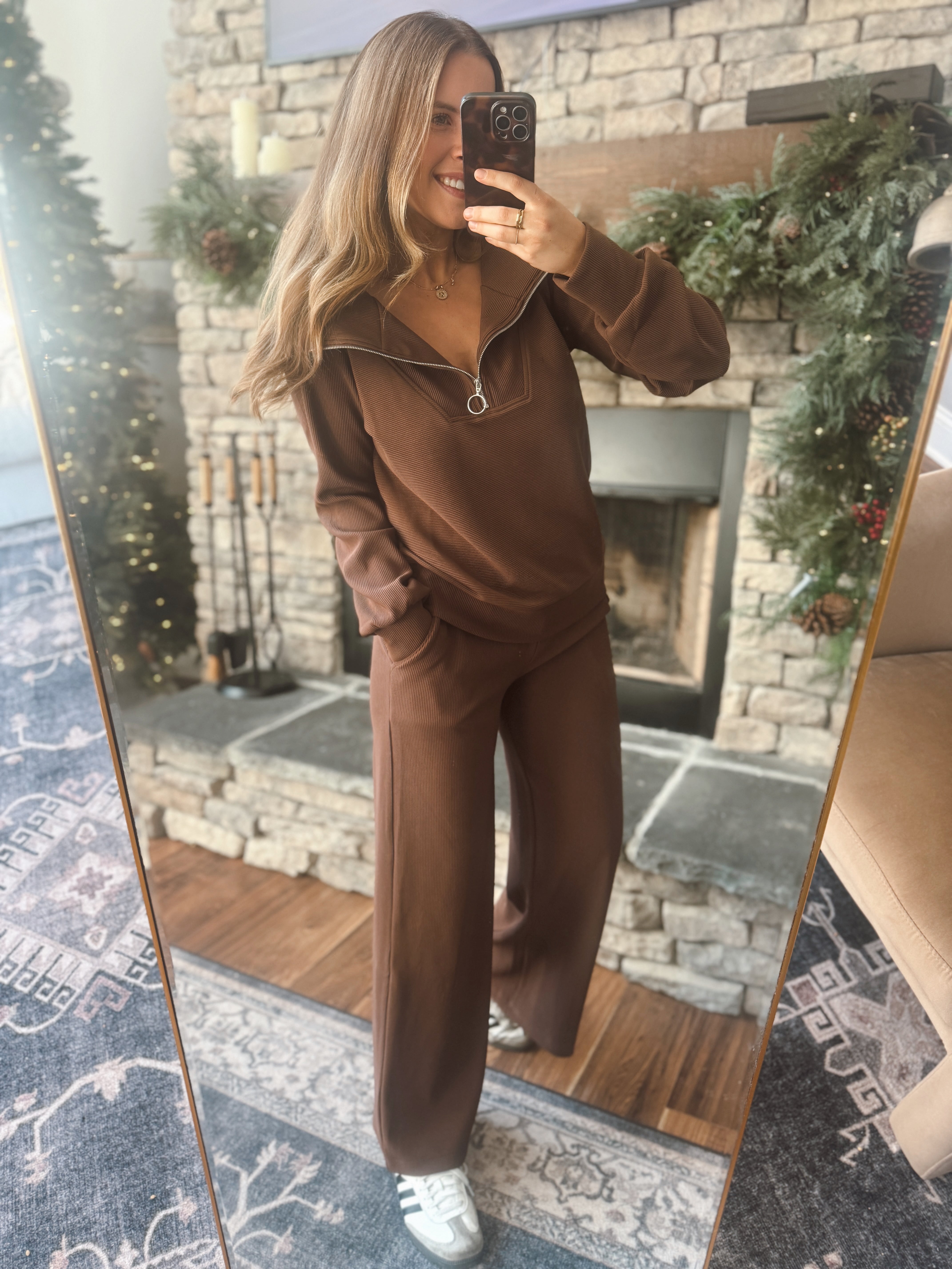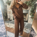 This set is THAT GIRL. Smooth ribbed texture, a chic half-zip neckline, and wide-leg bottoms that make you look effortless with zero effort. The rich mocha shade is cozy, classy, and perfect for winter lounging, travel days, or holiday errands.