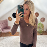 Reach for this washed chocolate long sleeve tee when you want effortless style that actually feels good. The classic scoop neckline and relaxed fit make it perfect for layering or wearing solo—it's the kind of piece that becomes an instant favorite in your rotation. Soft, versatile, and ready for whatever your day brings.