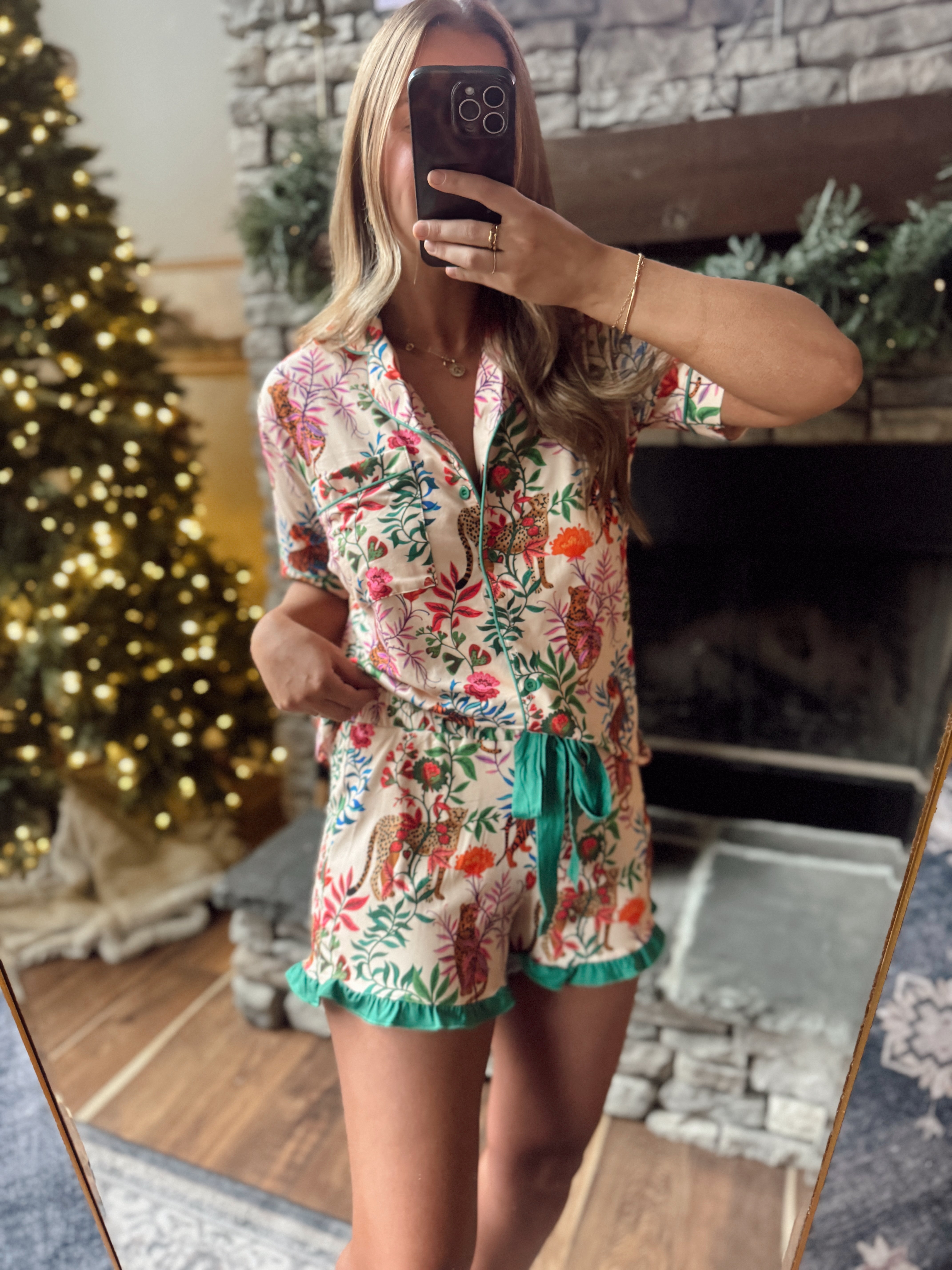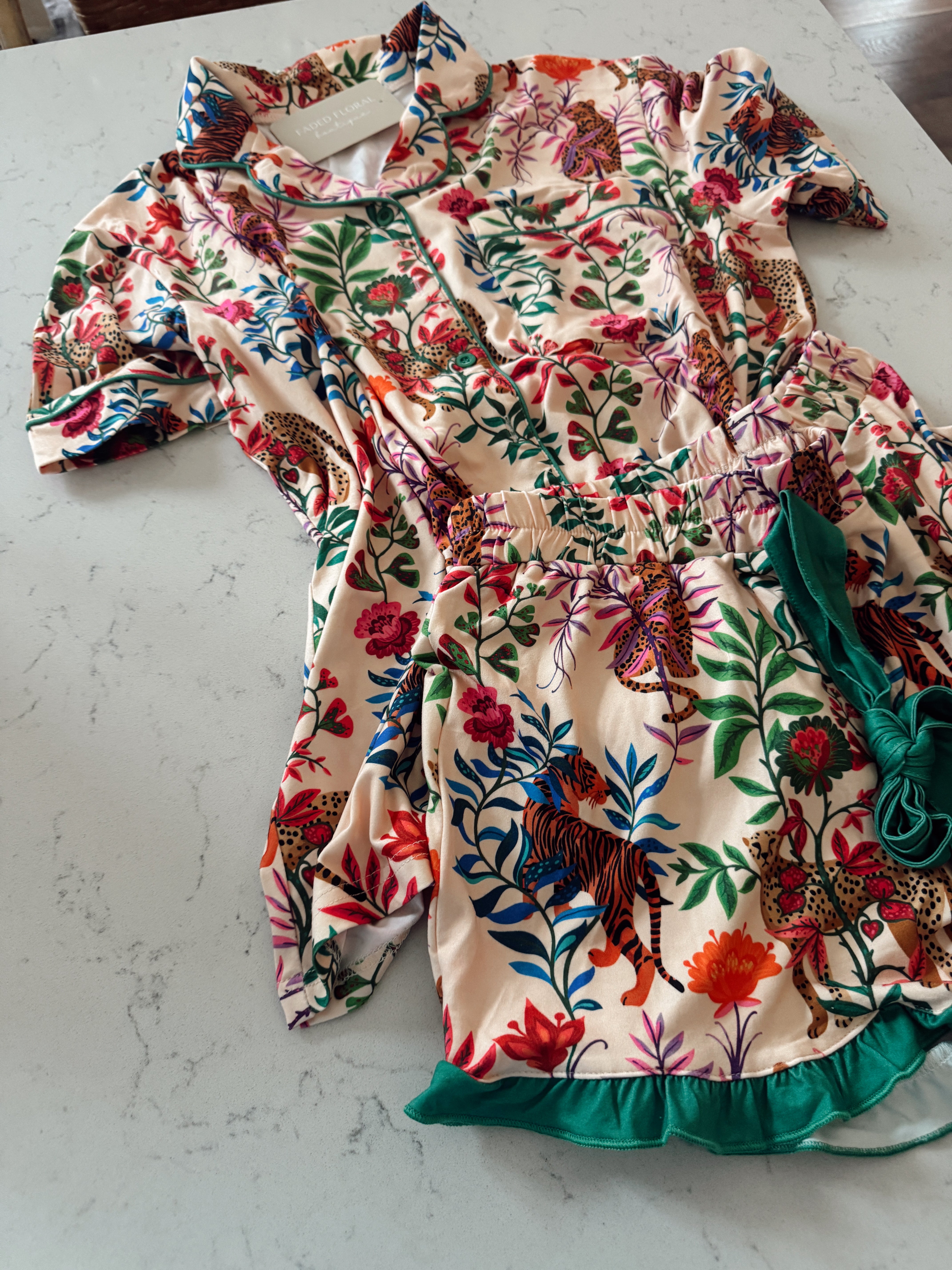 Bring the vacay vibes home with this stunning Jess Lea two-piece pajama set! Featuring a tropical jungle print with leopards, tigers, and lush florals, this silky-soft set is equal parts comfy and chic. Designed with a relaxed fit, contrast green trim, and the prettiest ruffle hem.