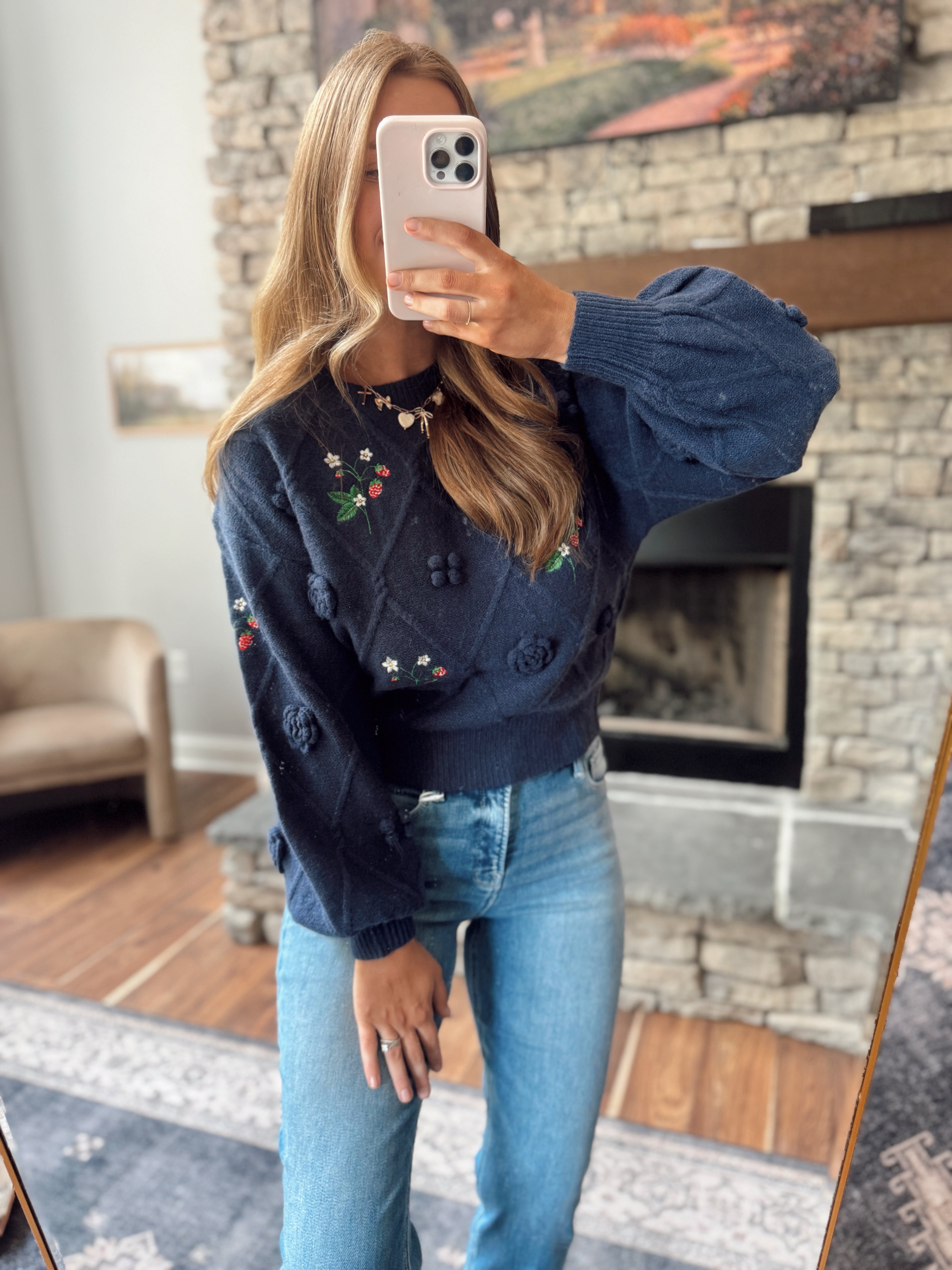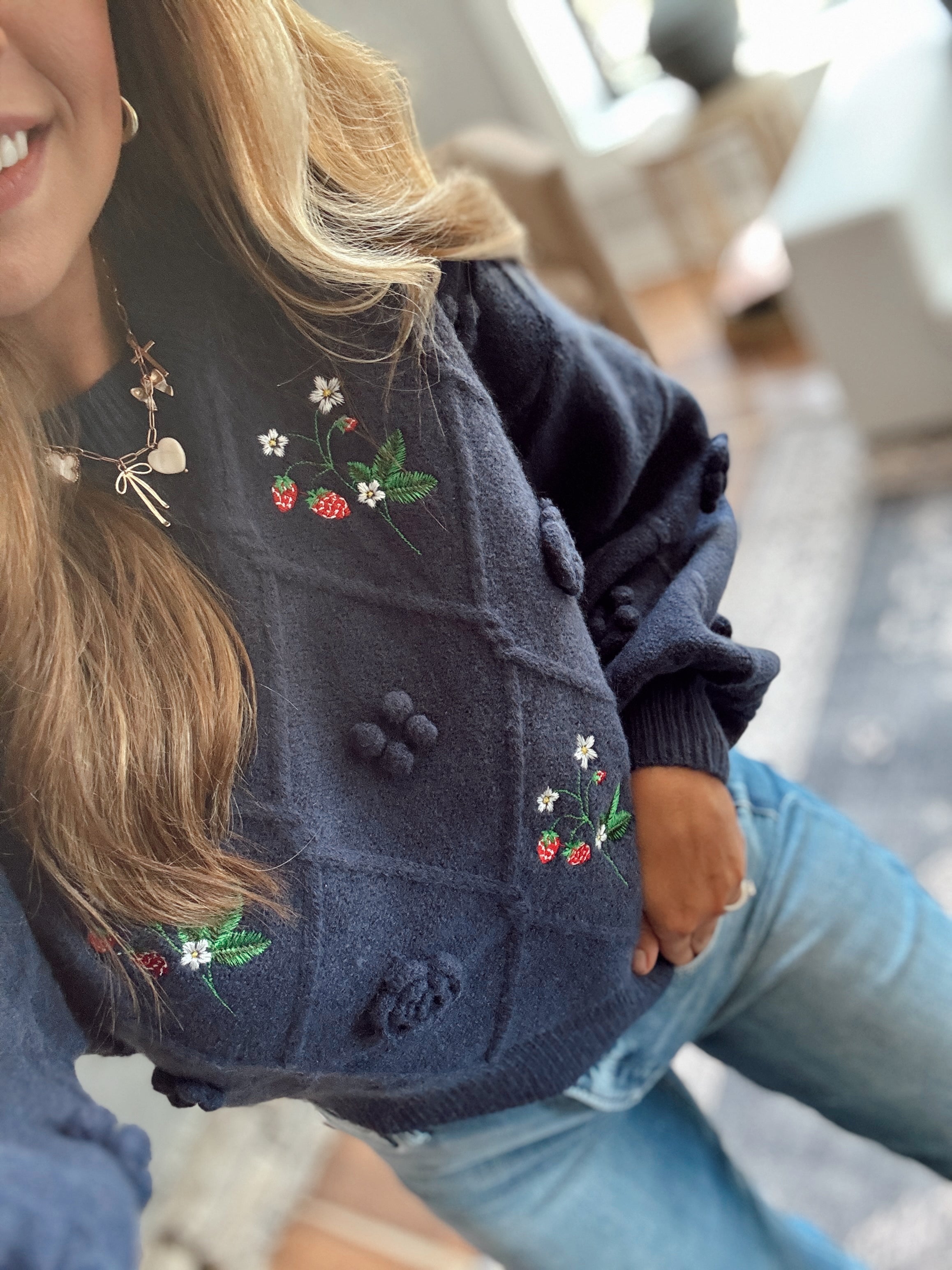 This sweater is like a cozy stroll through a quiet forest — warm, charming, and just a little bit whimsical. With delicate floral embroidery and soft 3D knit details, it brings a playful yet polished touch to your everyday style. The color pairs effortlessly with your favorite denim or a flowy skirt, making it an easy go-to for chilly mornings or casual coffee dates.
