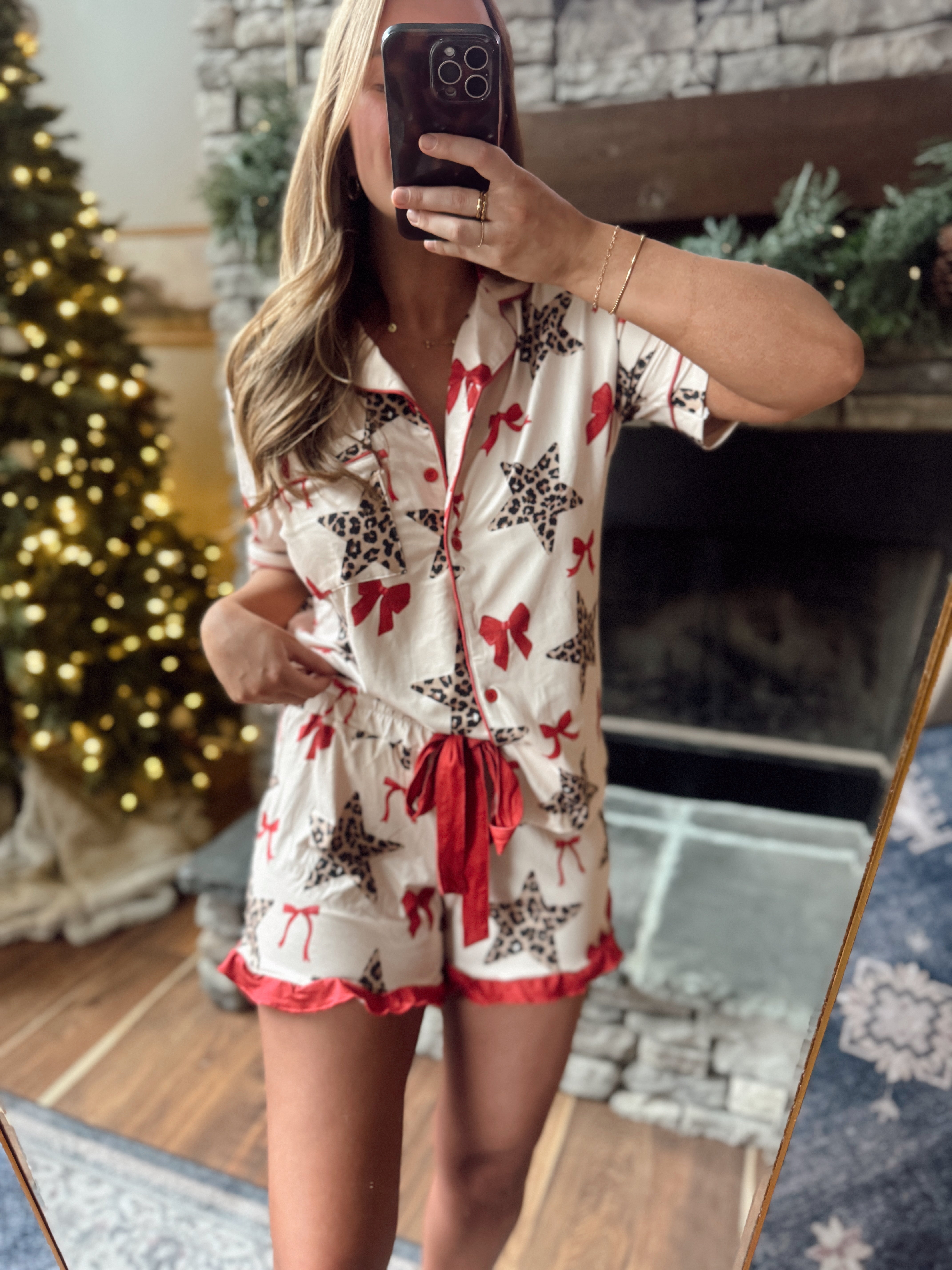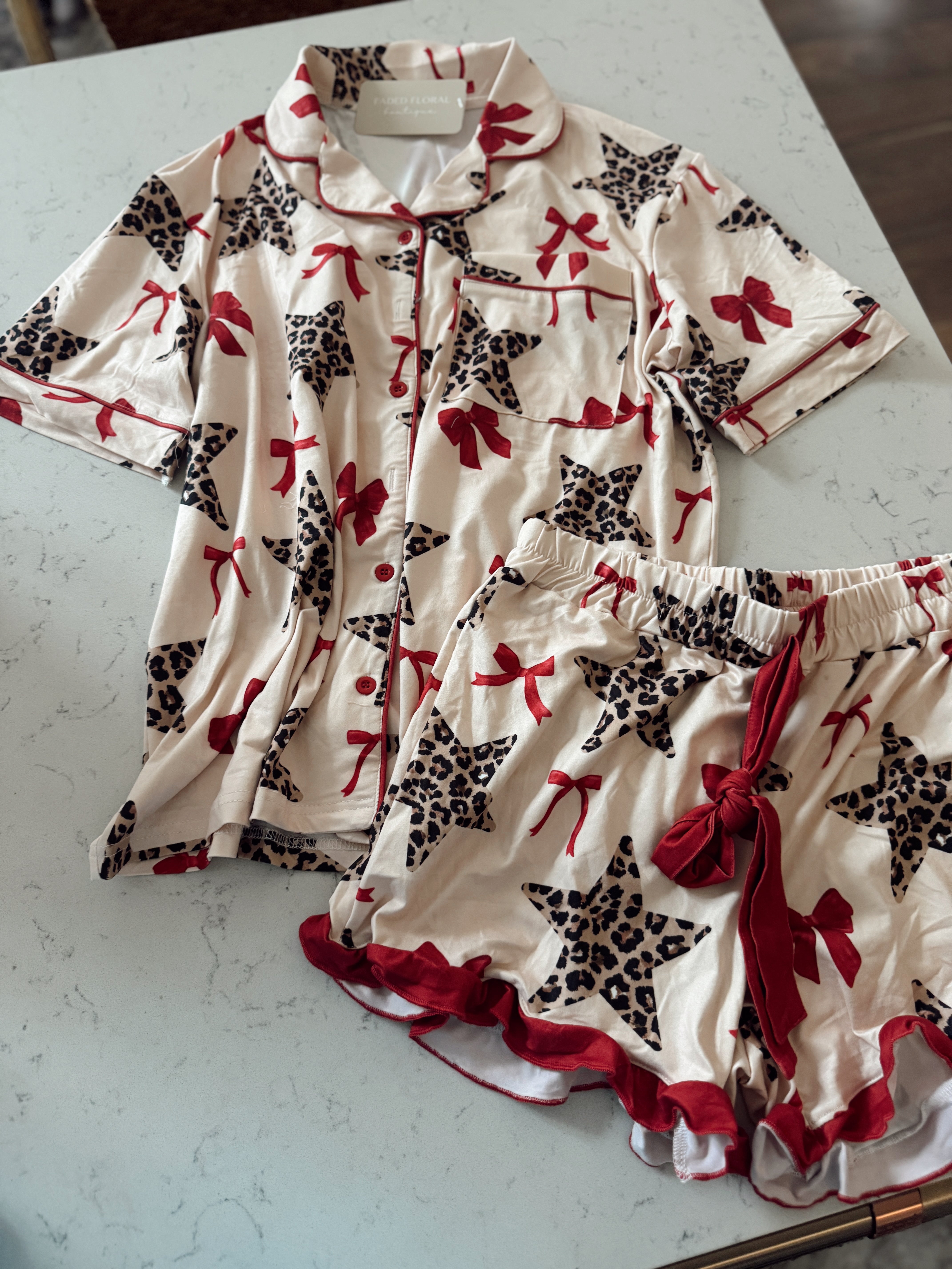 Finished with contrast red trim and the cutest leopard-star and bow print — equal parts comfy and fun!