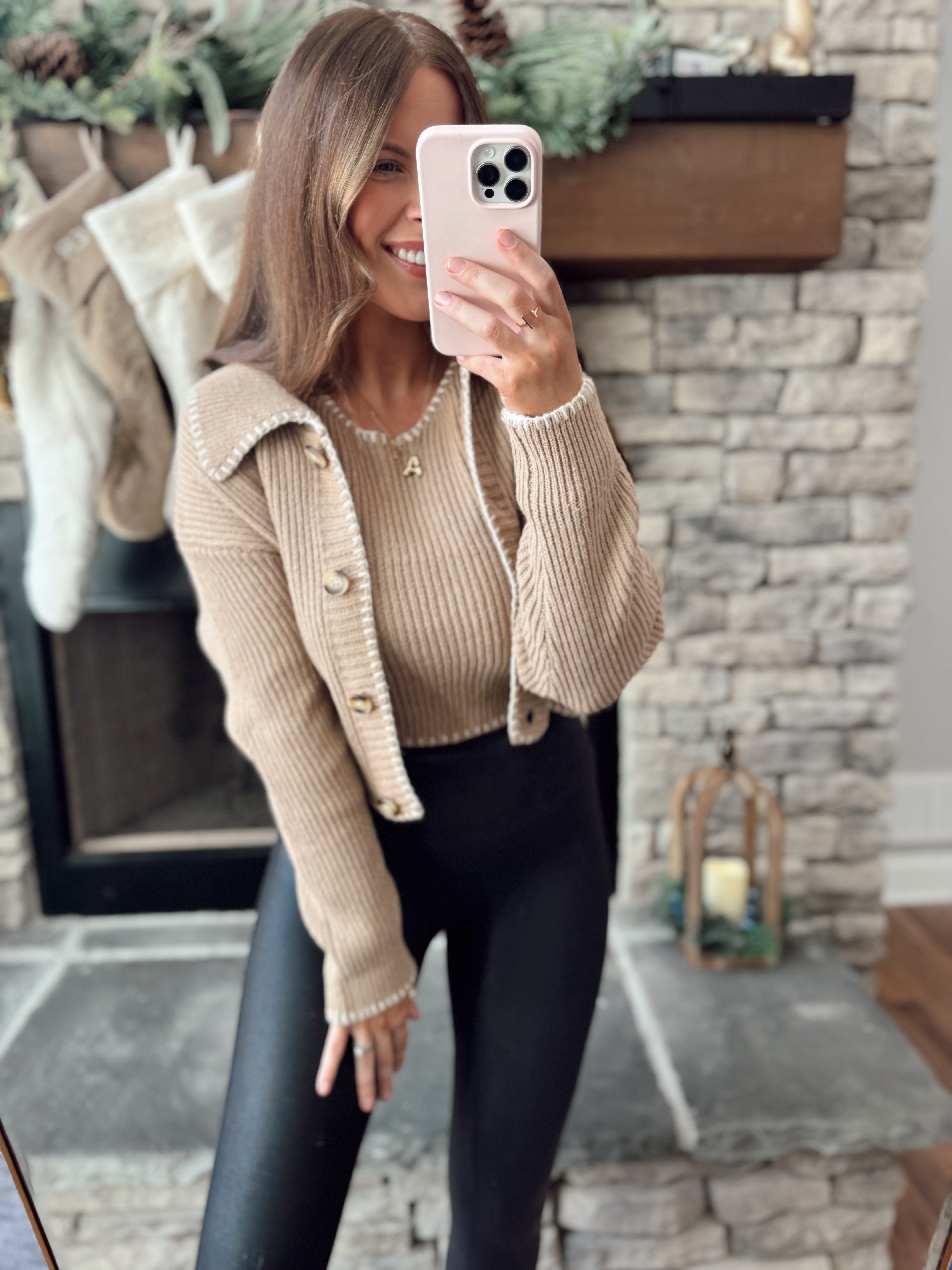 Amelia Tan/White Knit Tank and Cardi Set with Stitch Detailing