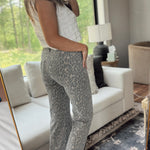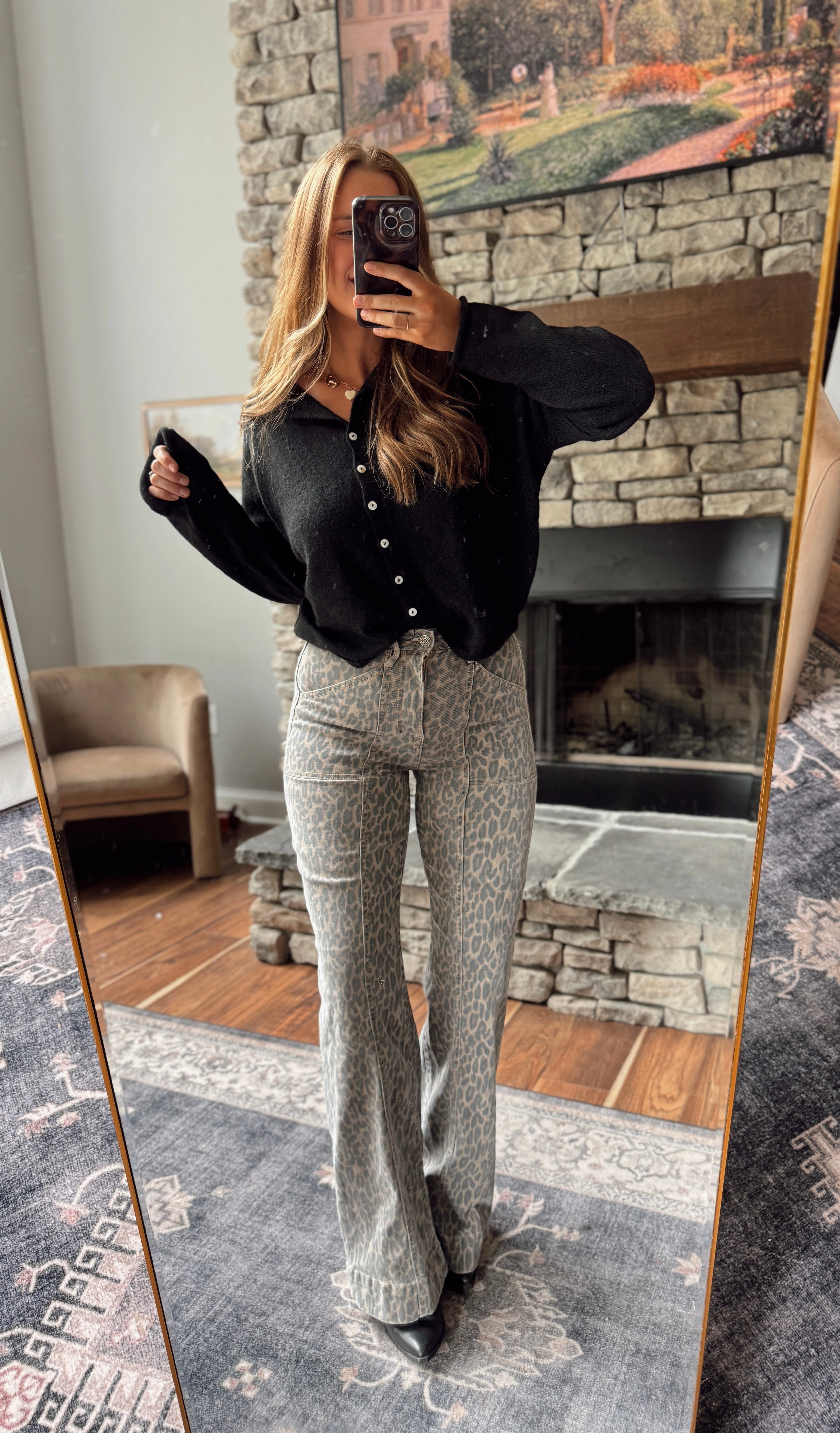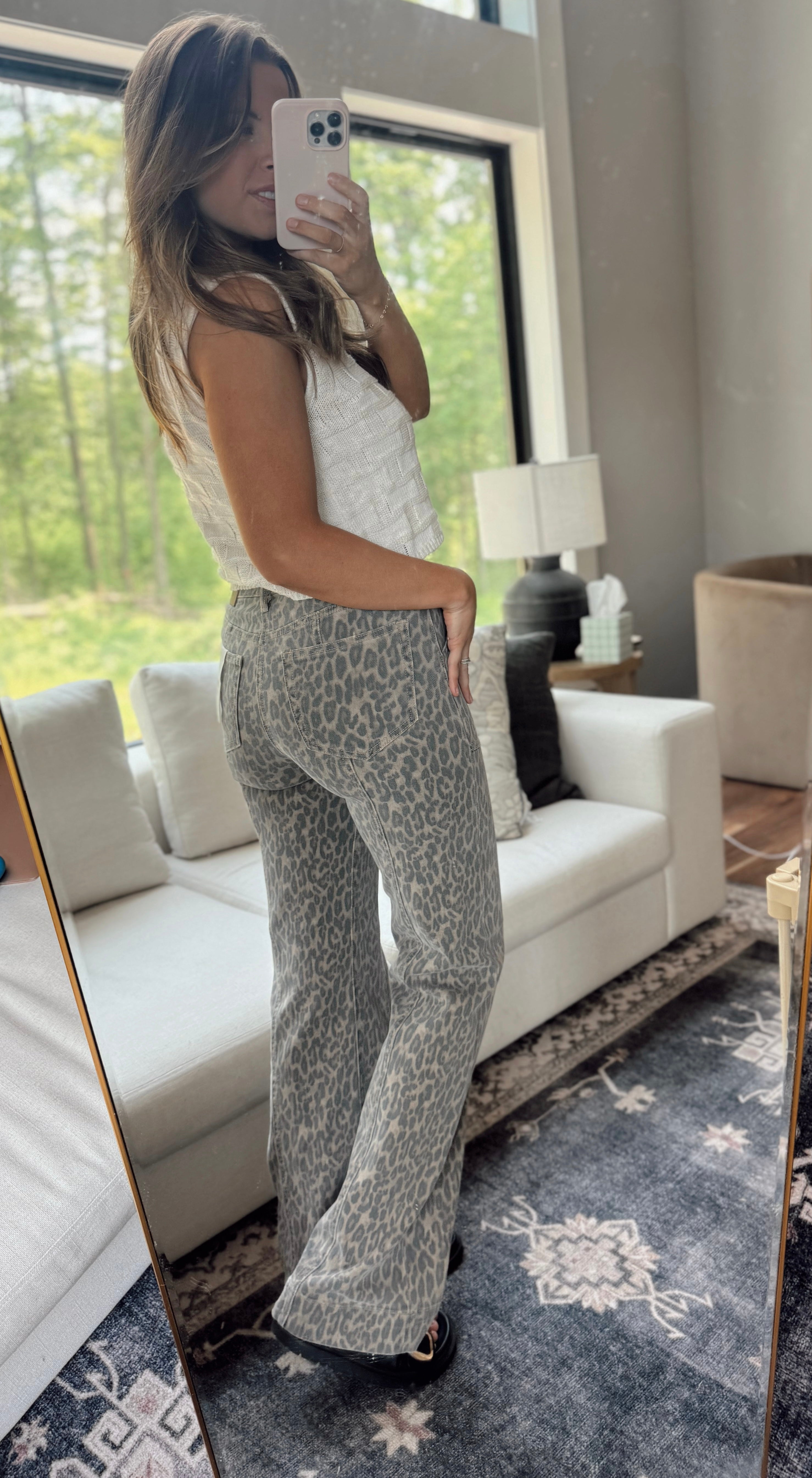 Get in touch with your wild side in these flare leg leopard print jeans by Hidden. Super comfy yet very chic. They have a fun seam that runs down the front and back of the leg. They do run true to size.