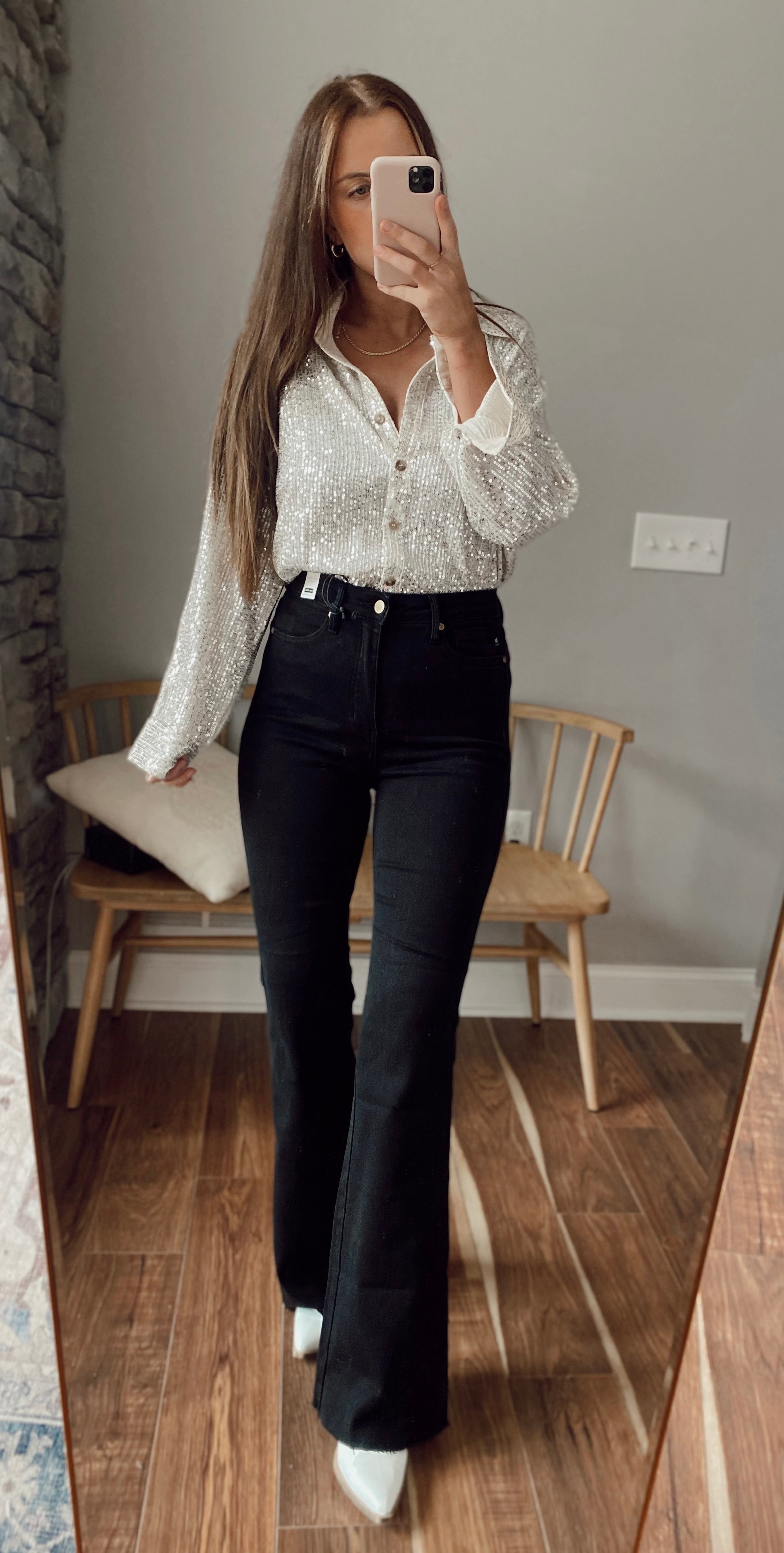 These high-rise black flare jeans with a raw hem offer both style and practicality. The raw hem adds a trendy touch, while the high rise provides tummy control and a flattering fit. These jeans combine fashion and comfort seamlessly, making them a versatile choice for various occasions.