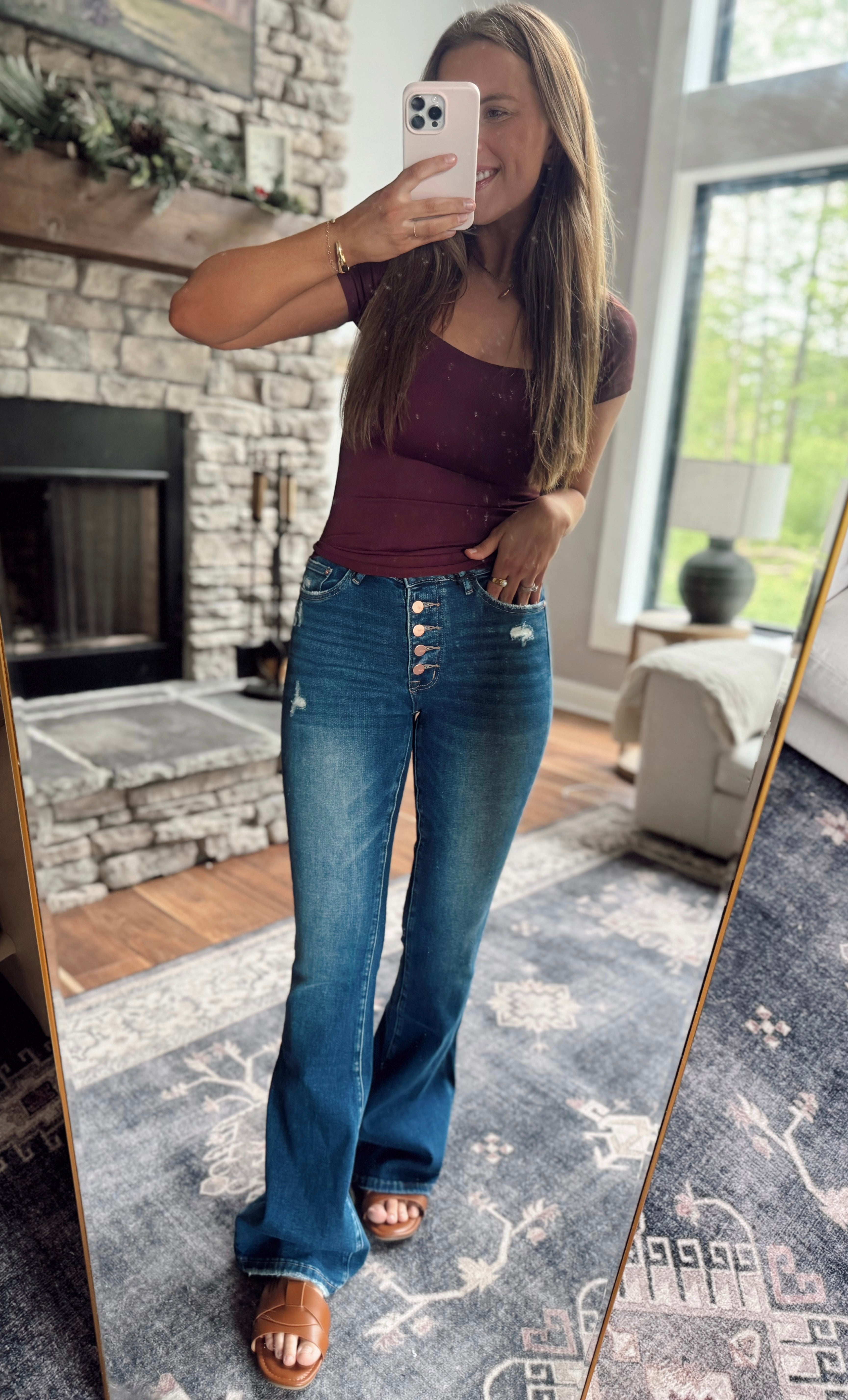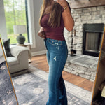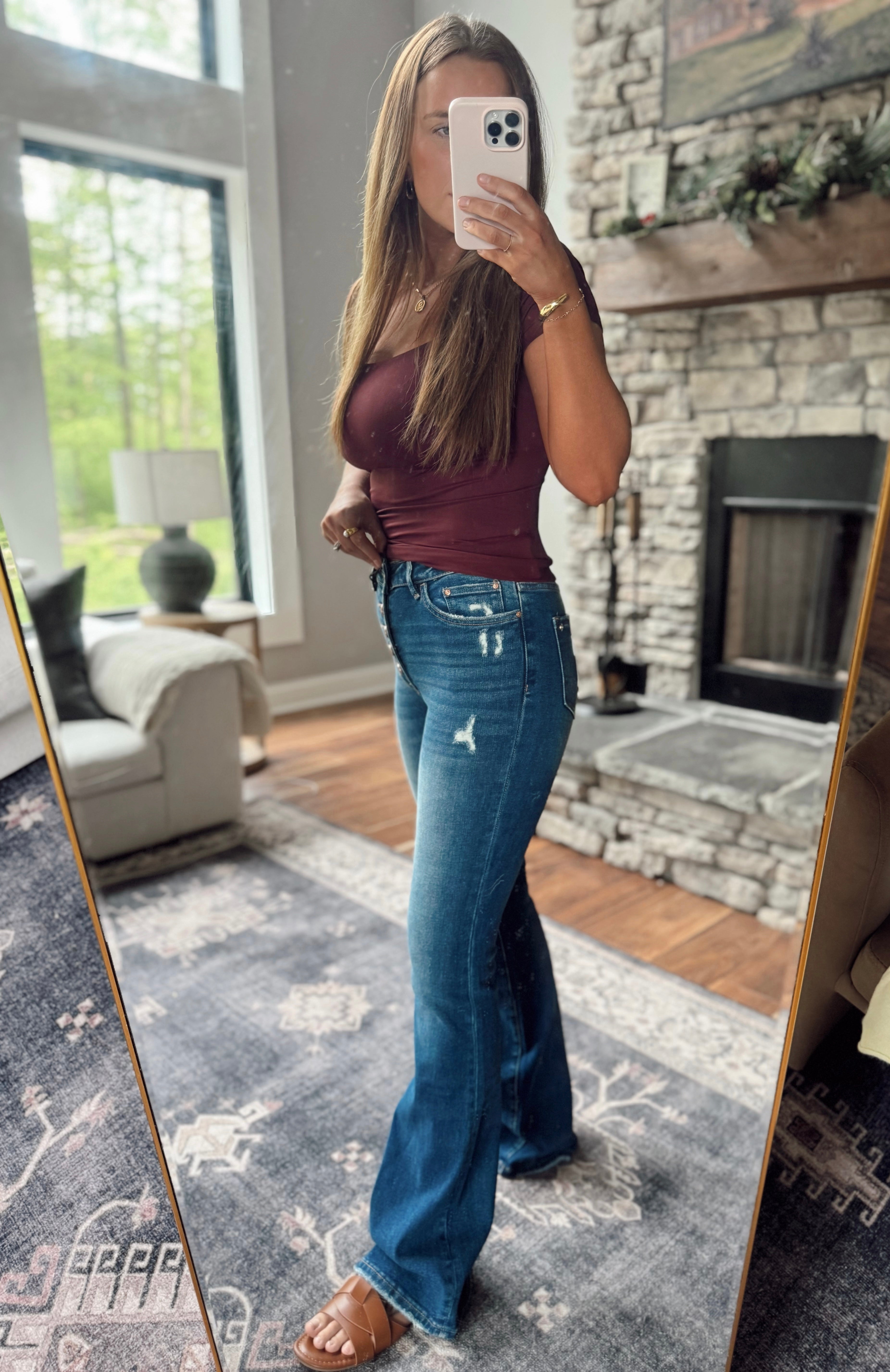 Mica Denim high rise flare with rose gold button-up fly. Comfortable and stretchy fabric. Dark Wash. Minimal distressing on front and back pockets.