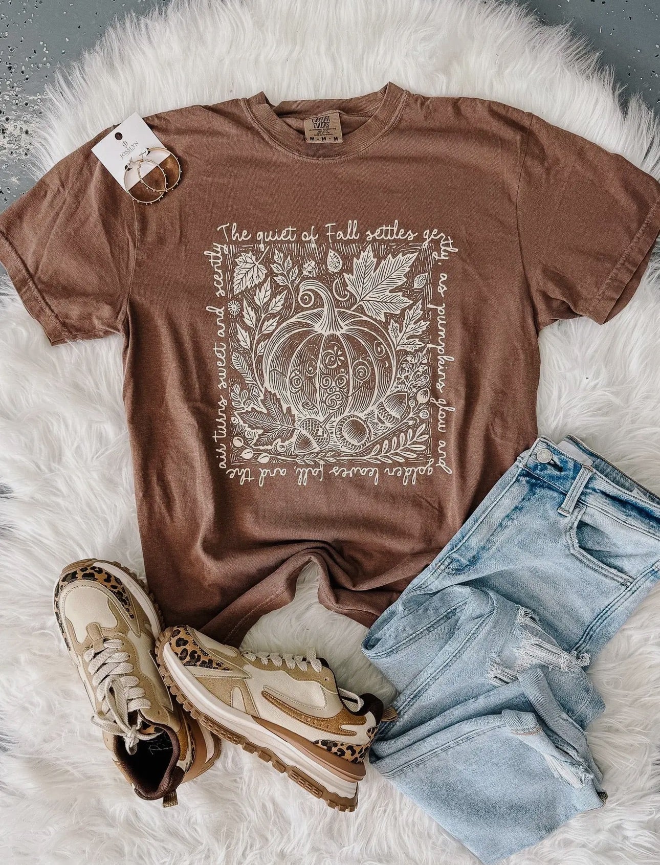 Celebrate the season in style with this soft, tee featuring a whimsical white pumpkin and foliage illustration. The hand-drawn design is framed with a sweet fall-inspired phrase, making it the perfect piece for pumpkin patch days, coffee runs, or layering under your favorite cardigan. Crafted from breathable cotton, this relaxed-fit tee is both comfy and cute—your go-to staple for crisp autumn mornings.