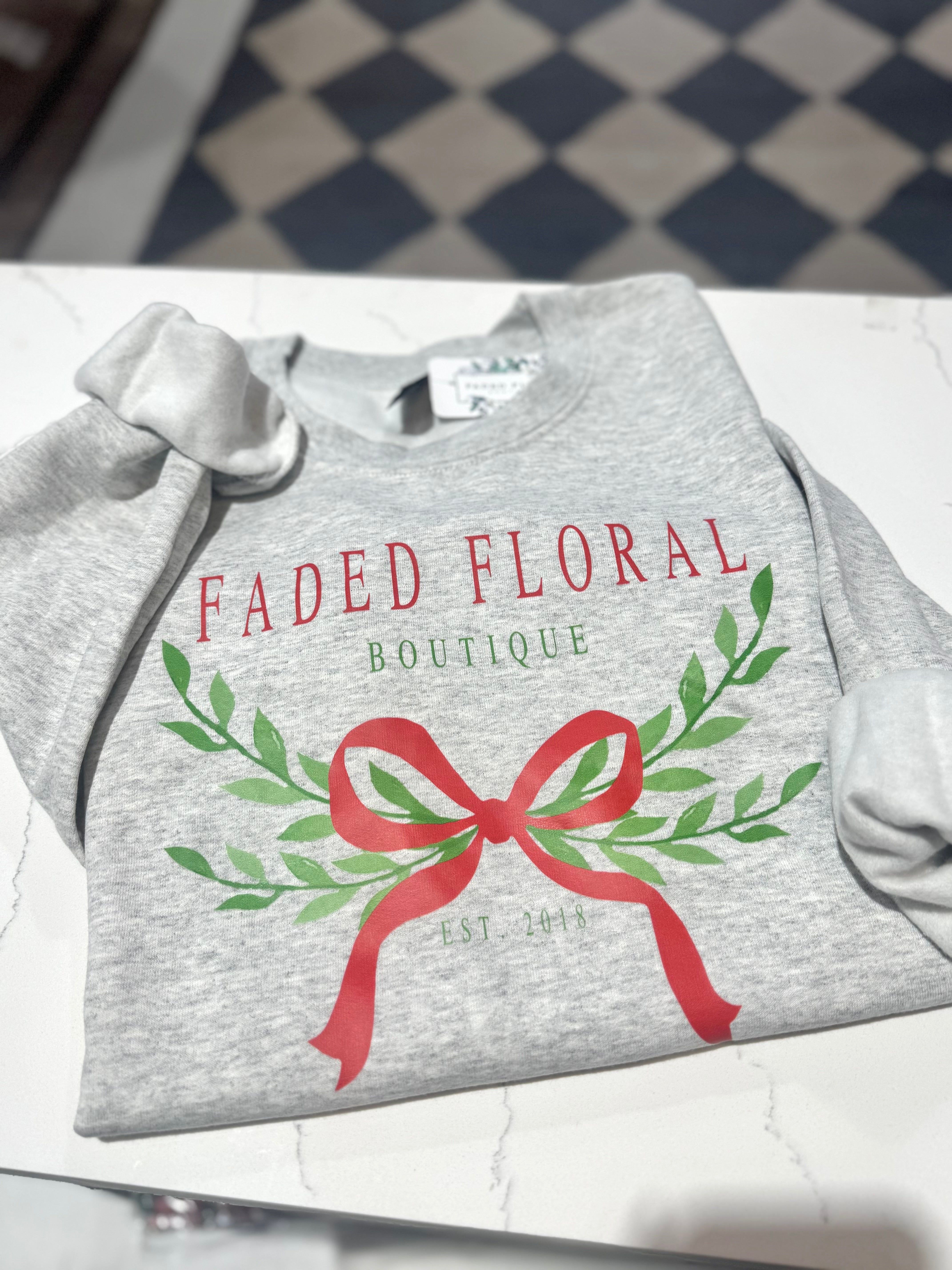 Heather Grey Faded Floral Boutique Holiday Bow Crew