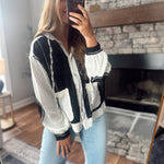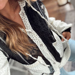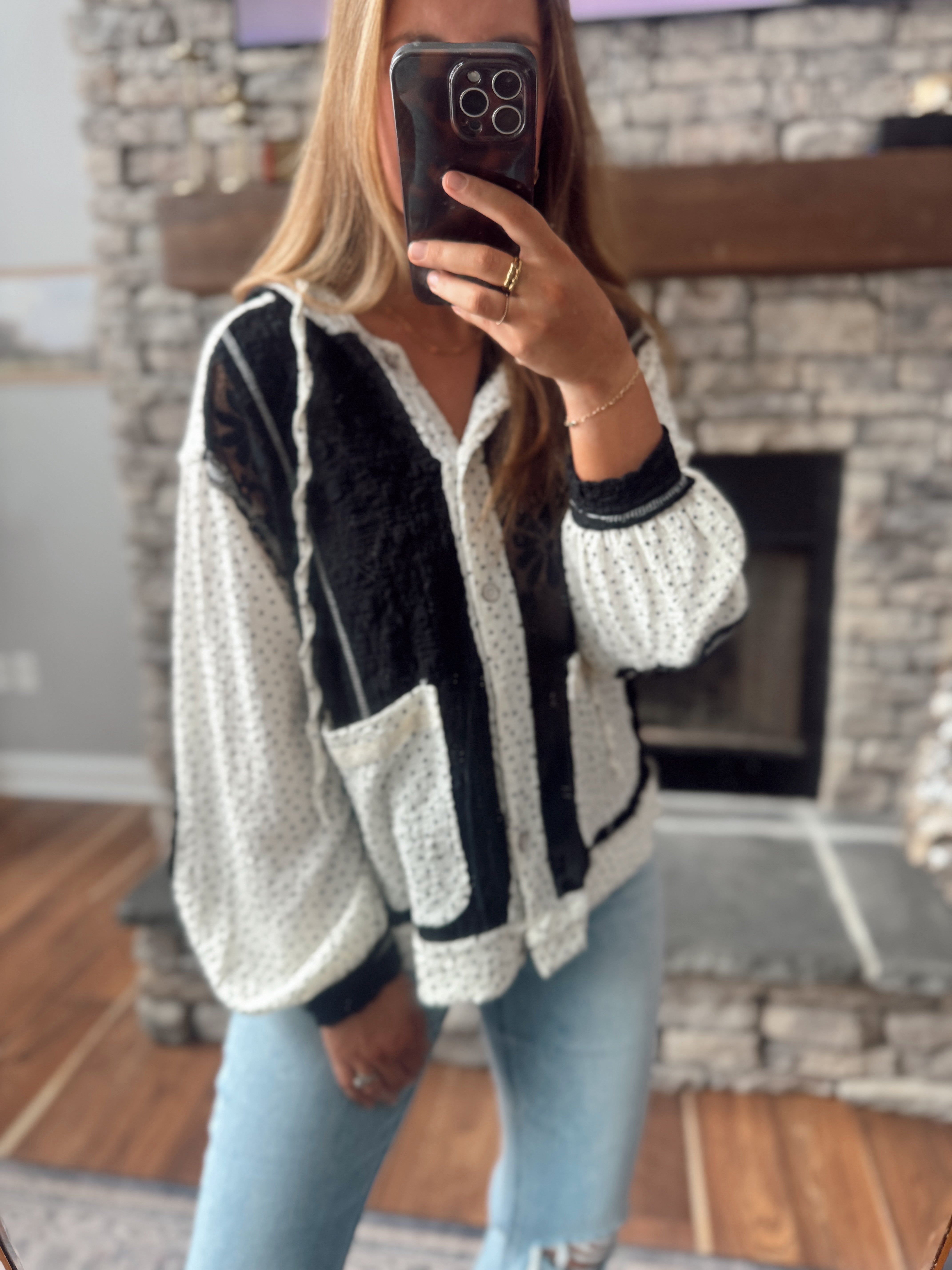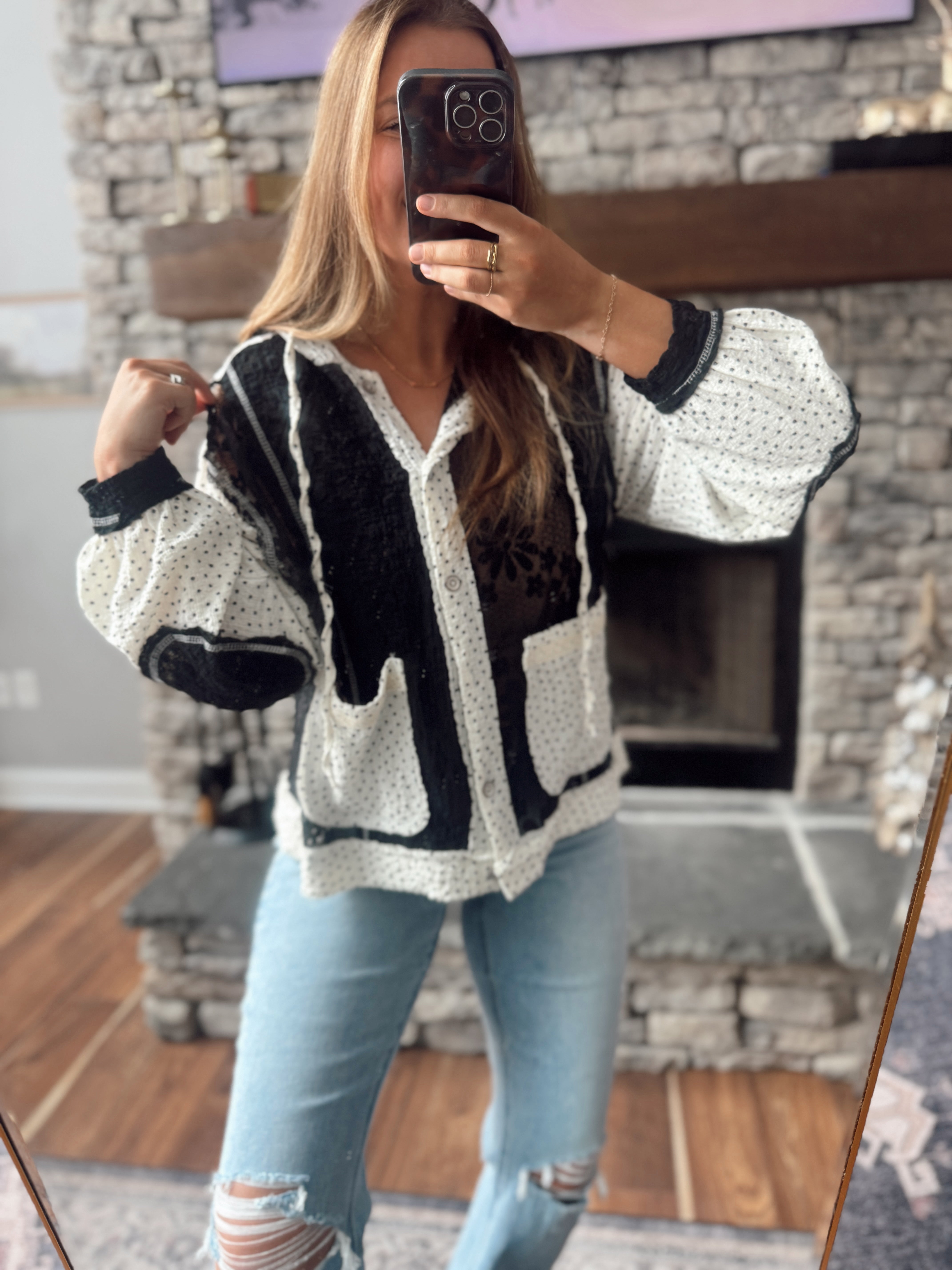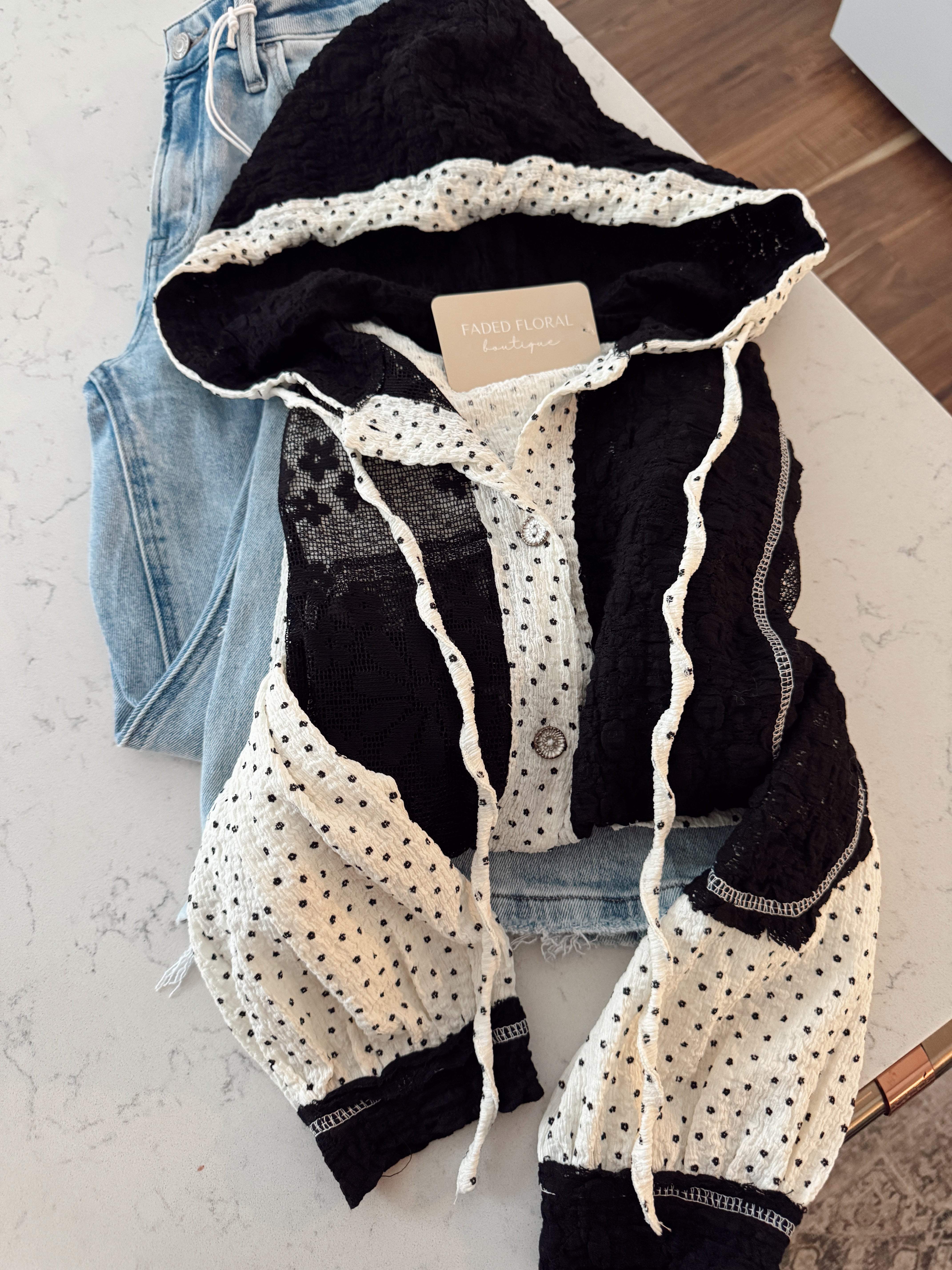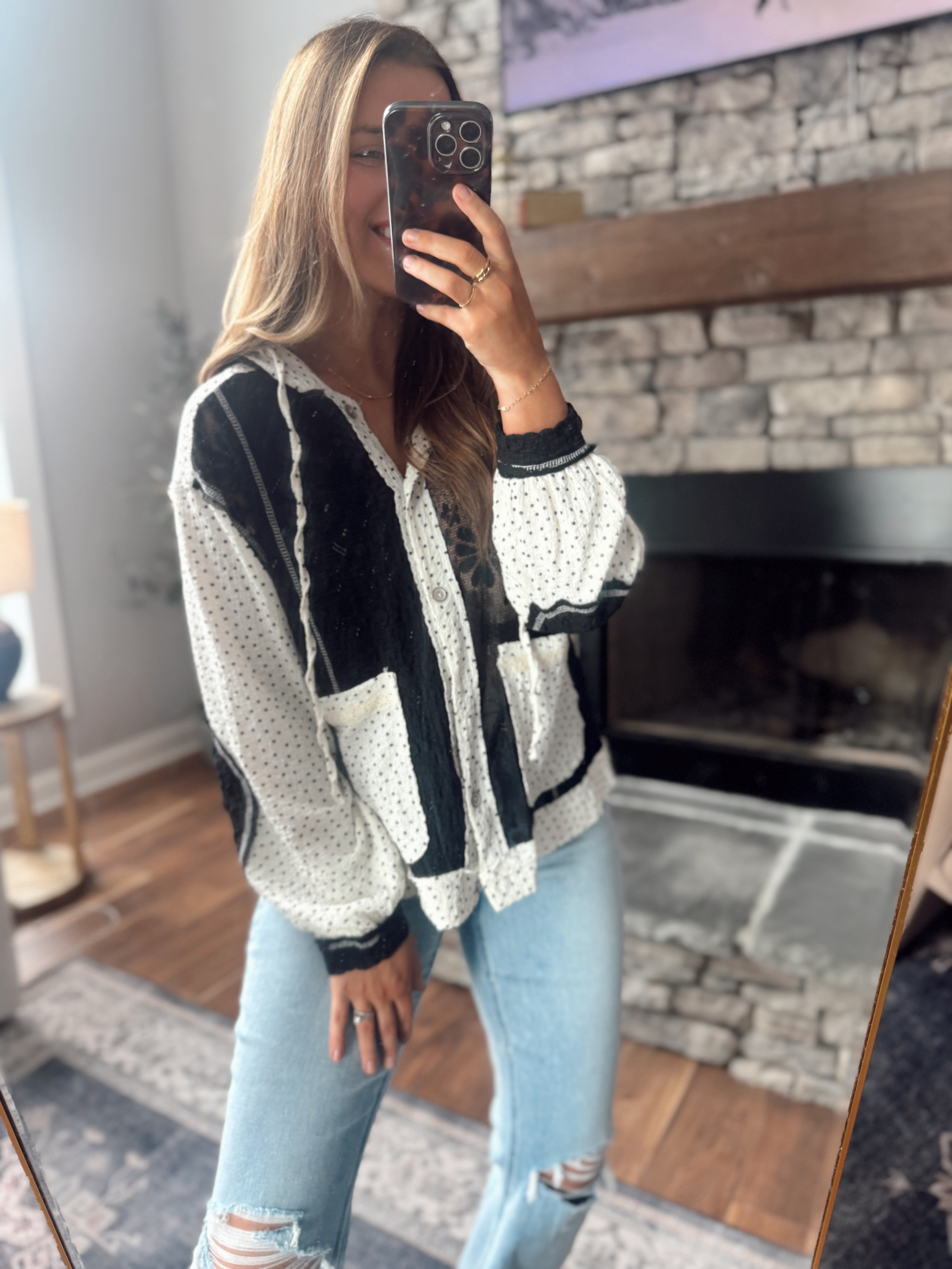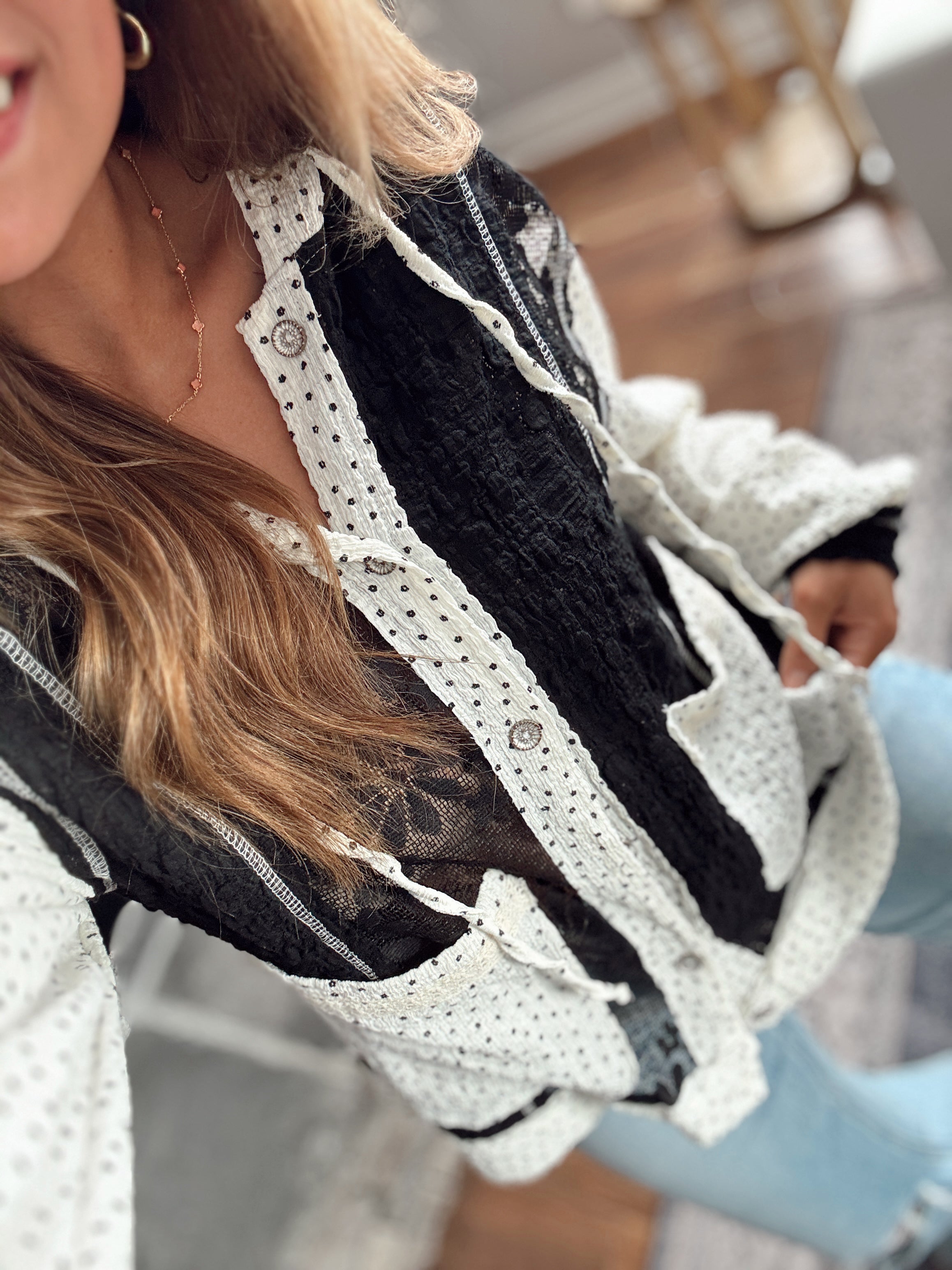 A super lightweight patchwork jacket made with mixed lace, dotted fabric, and soft crinkled panels that give it that perfectly undone, vintage feel.