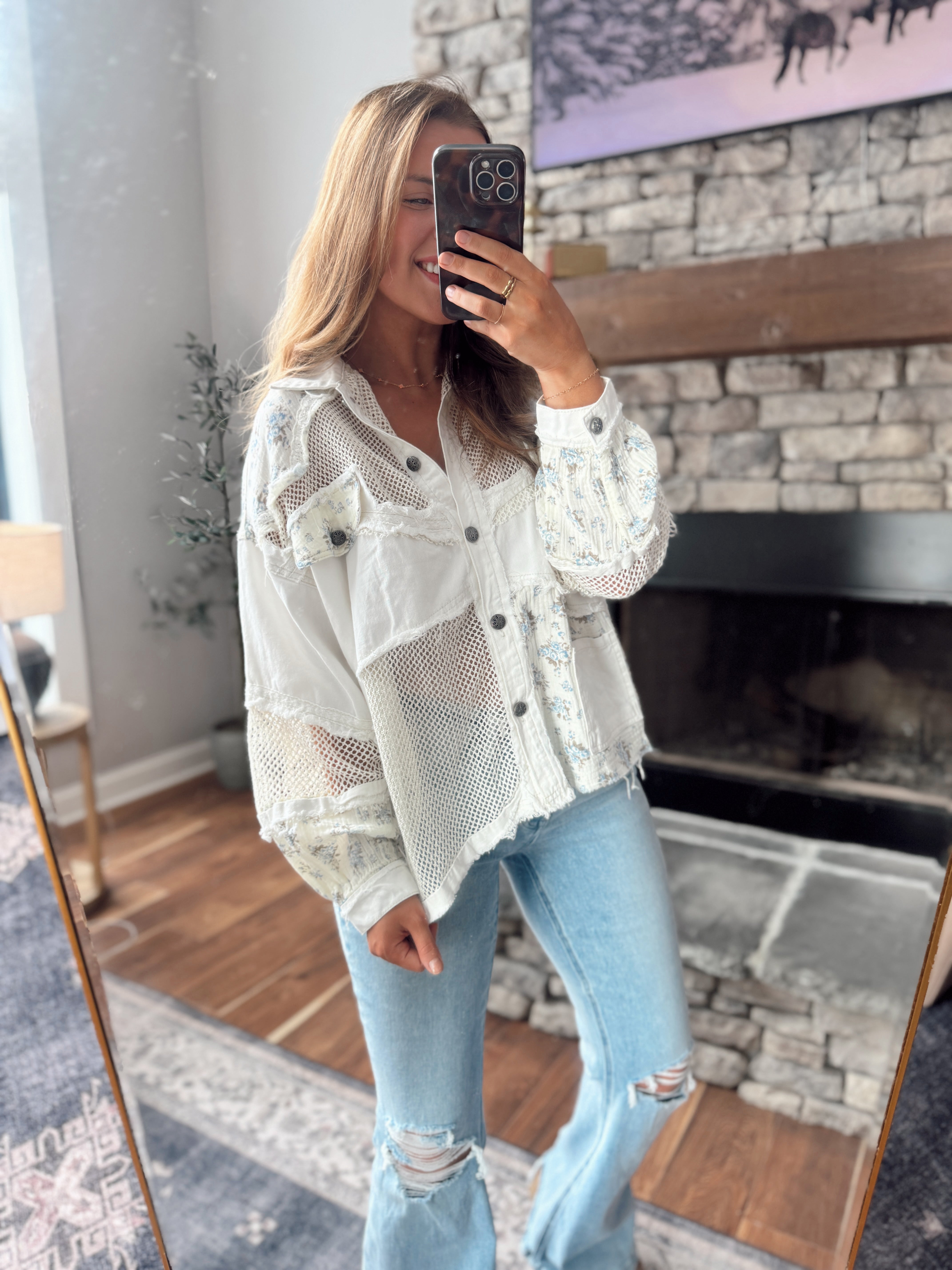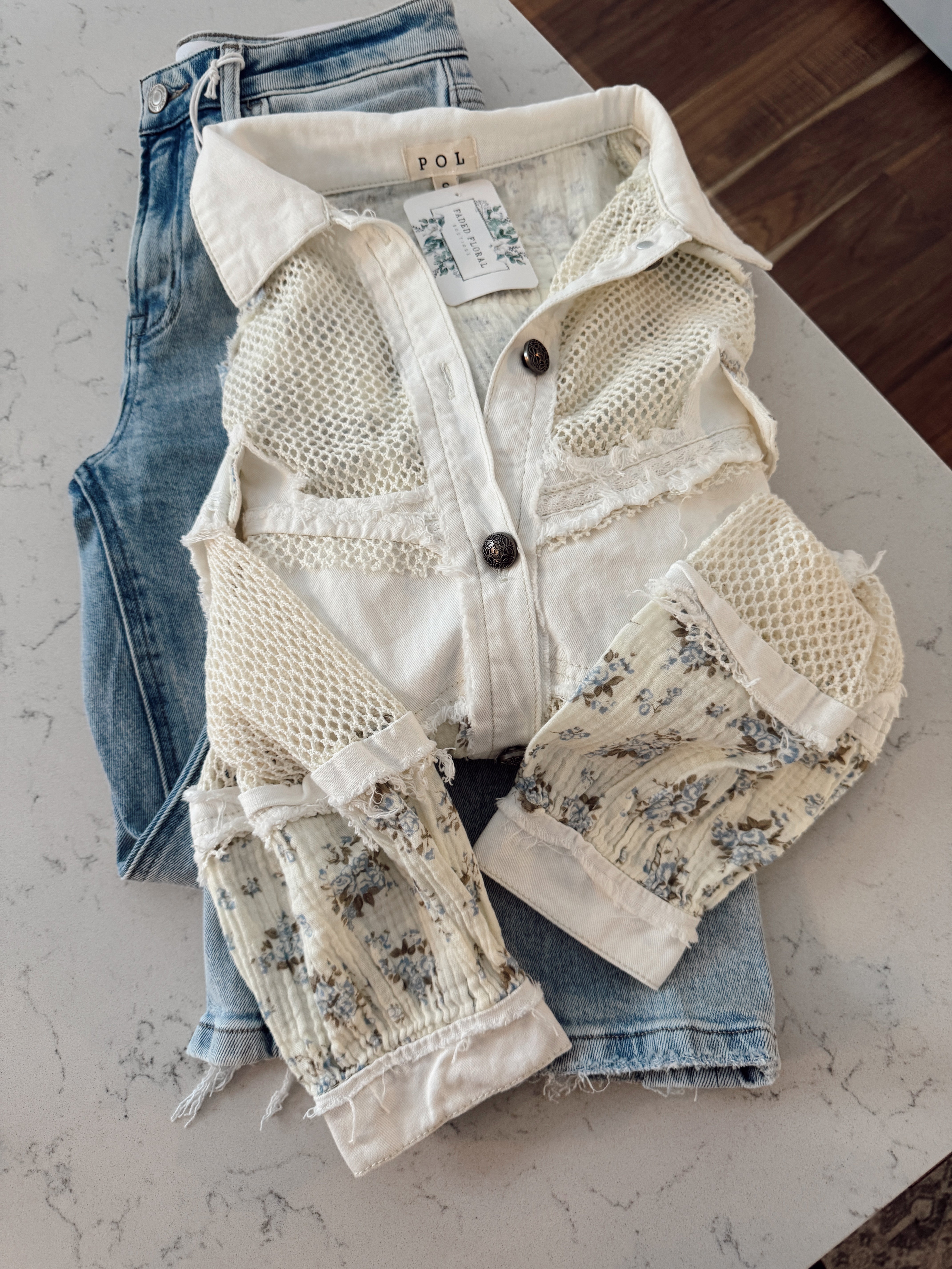 Classic POL craftsmanship meets soft vintage vibes with a mix of textured mesh panels, delicate floral accents, and subtle raw-edge details throughout.