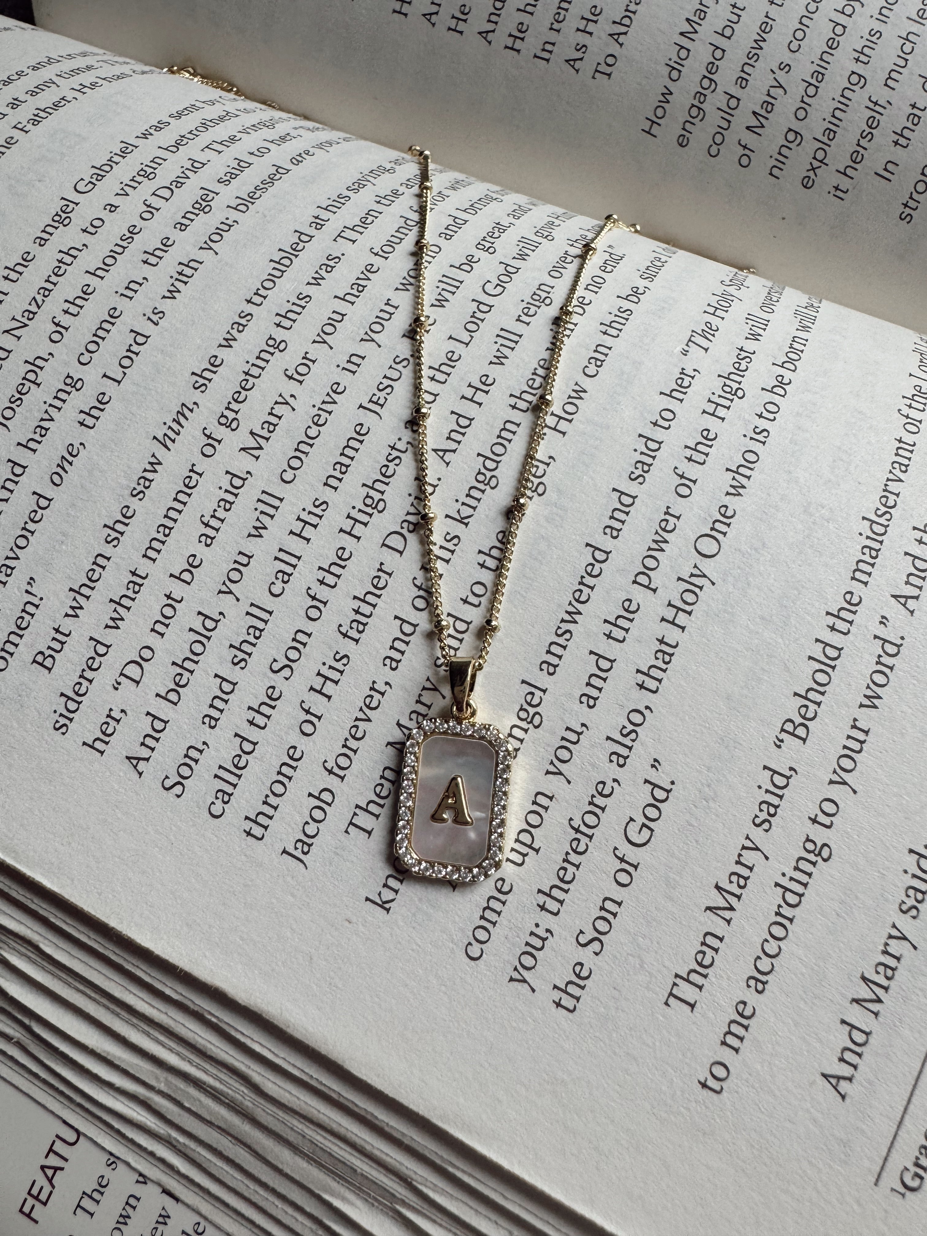 Gold Pearl Rectangle Initial Necklace