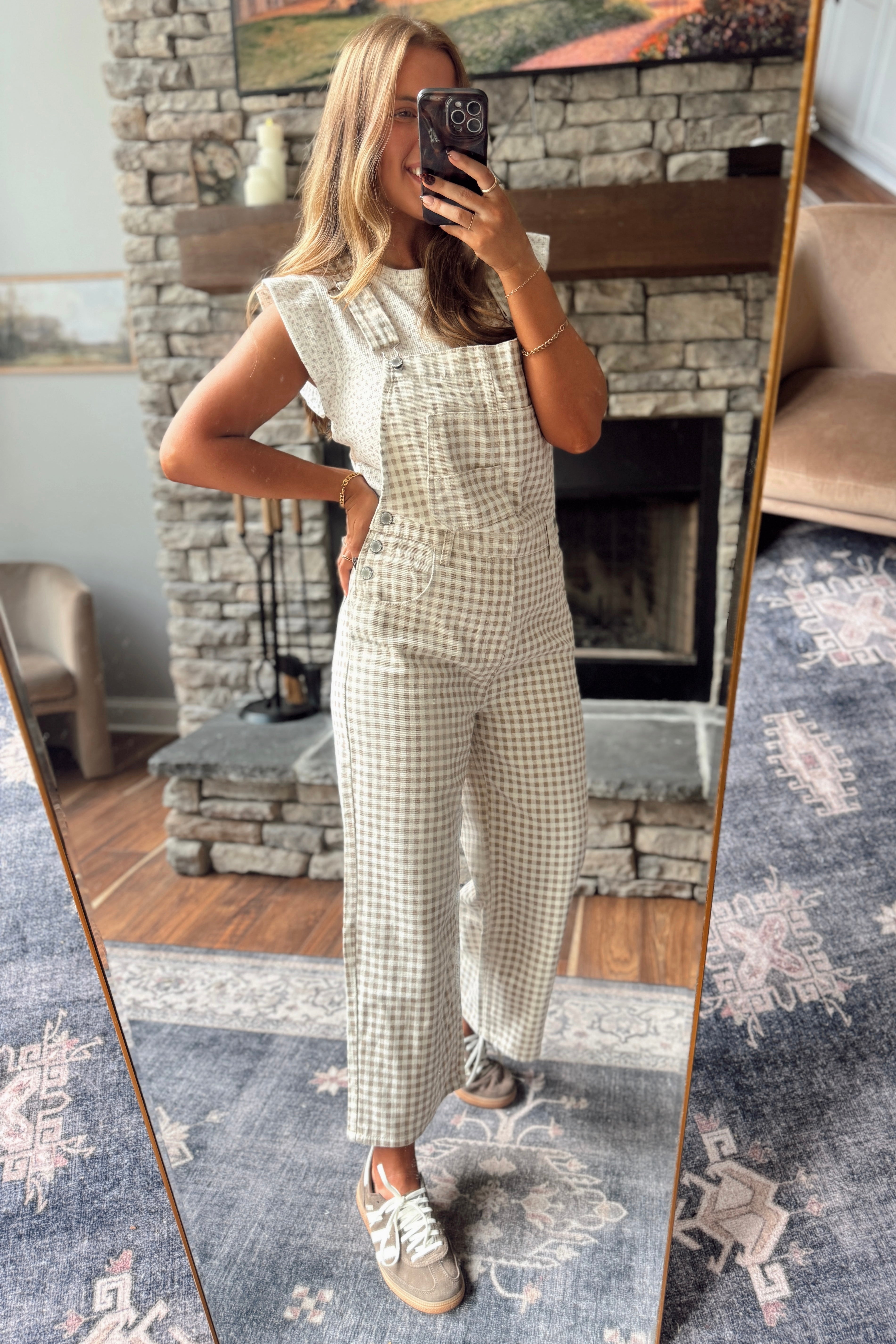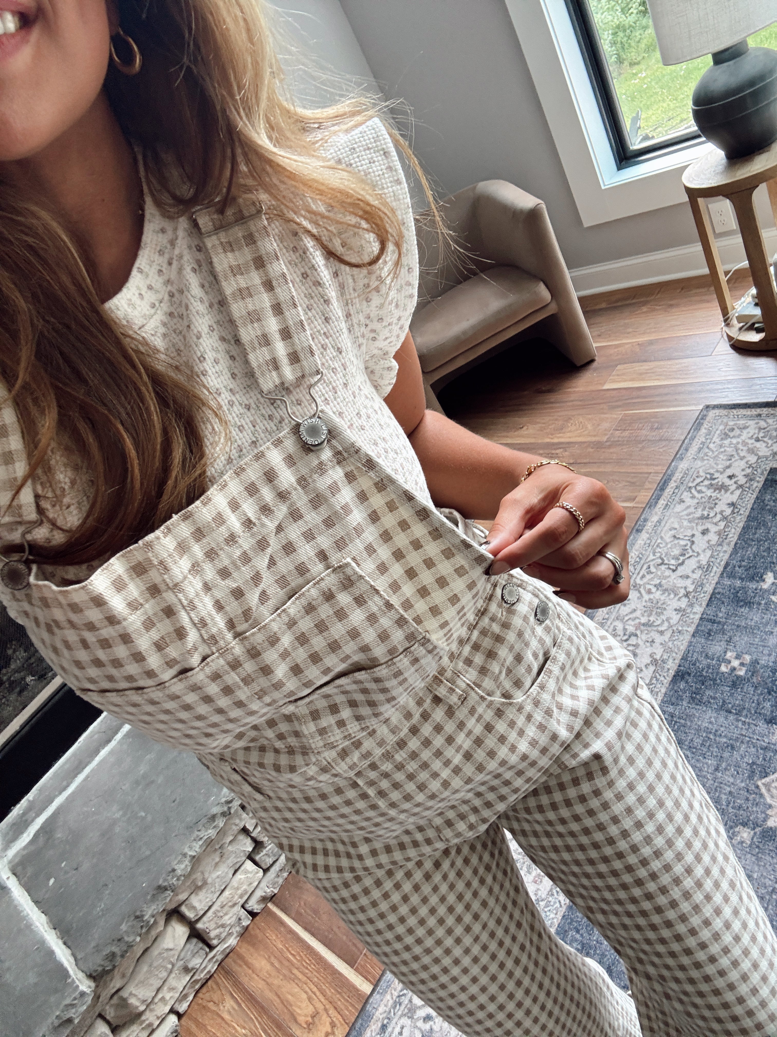 Cream/Taupe Gingham Denim Overalls