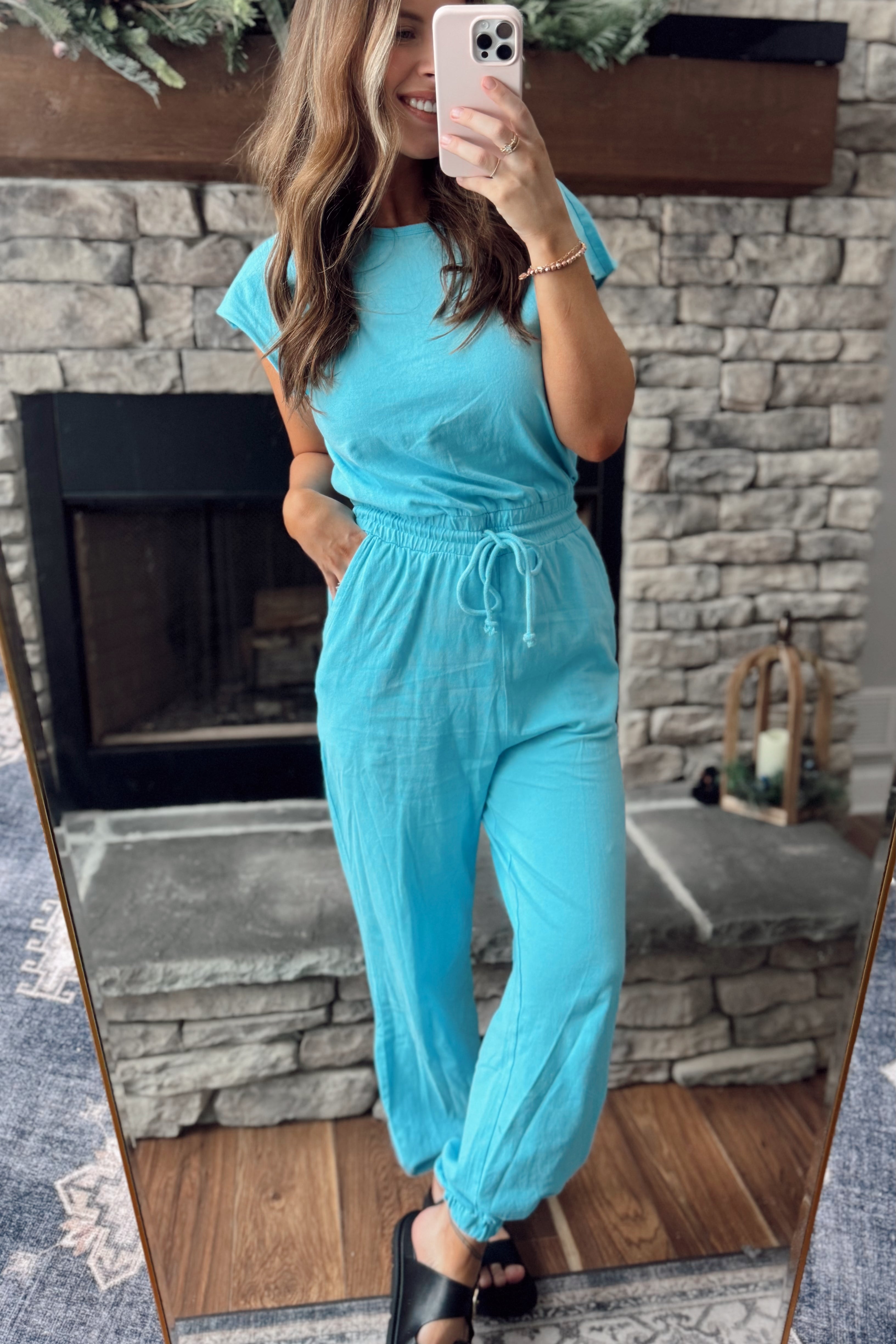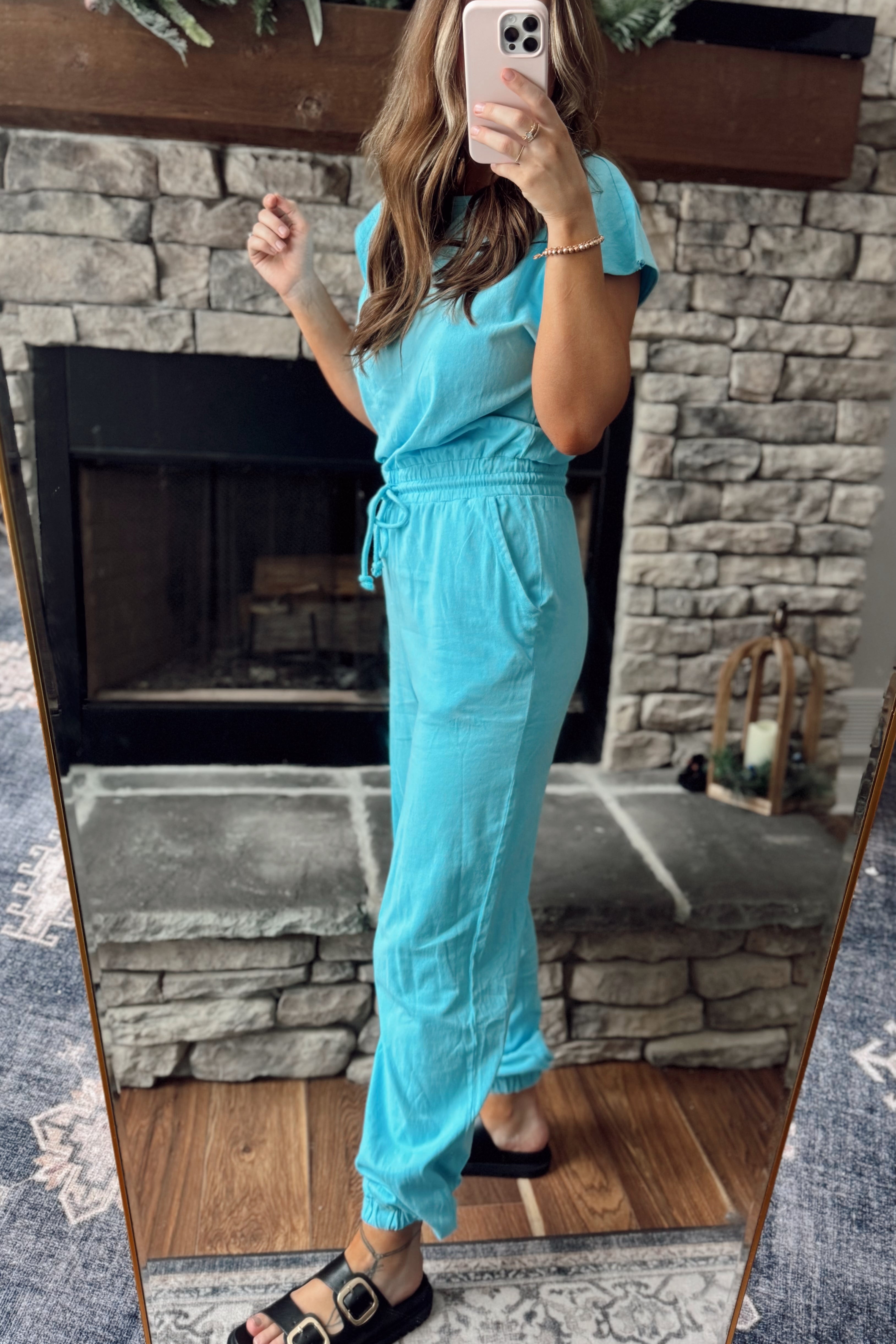 Aqua Blue Short Sleeve Jogger Jumpsuit