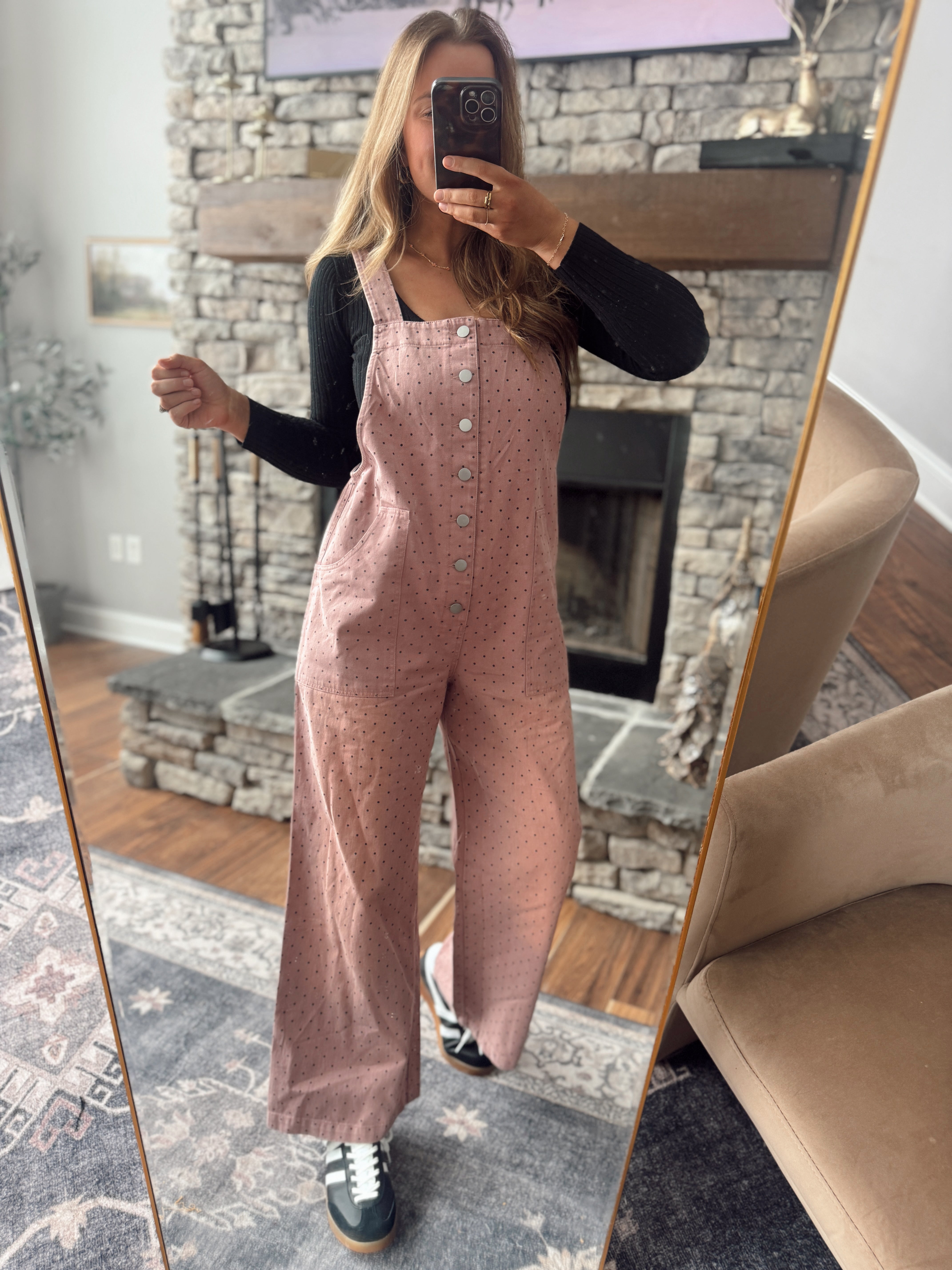 Rose Washed Polka Dot Denim Overalls