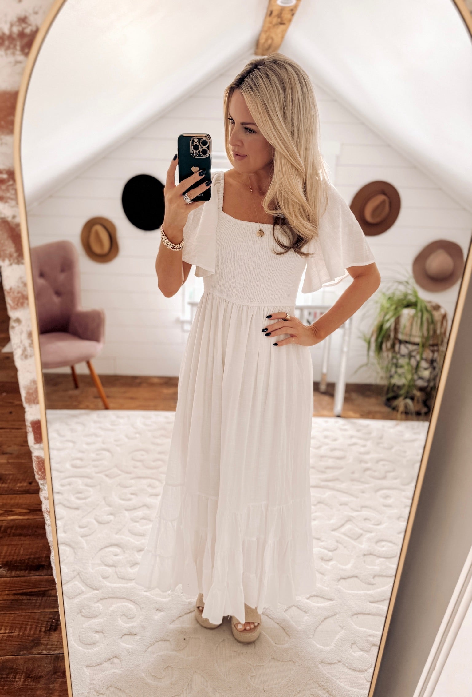 To The Tropics White Smocked Flutter Sleeve Maxi