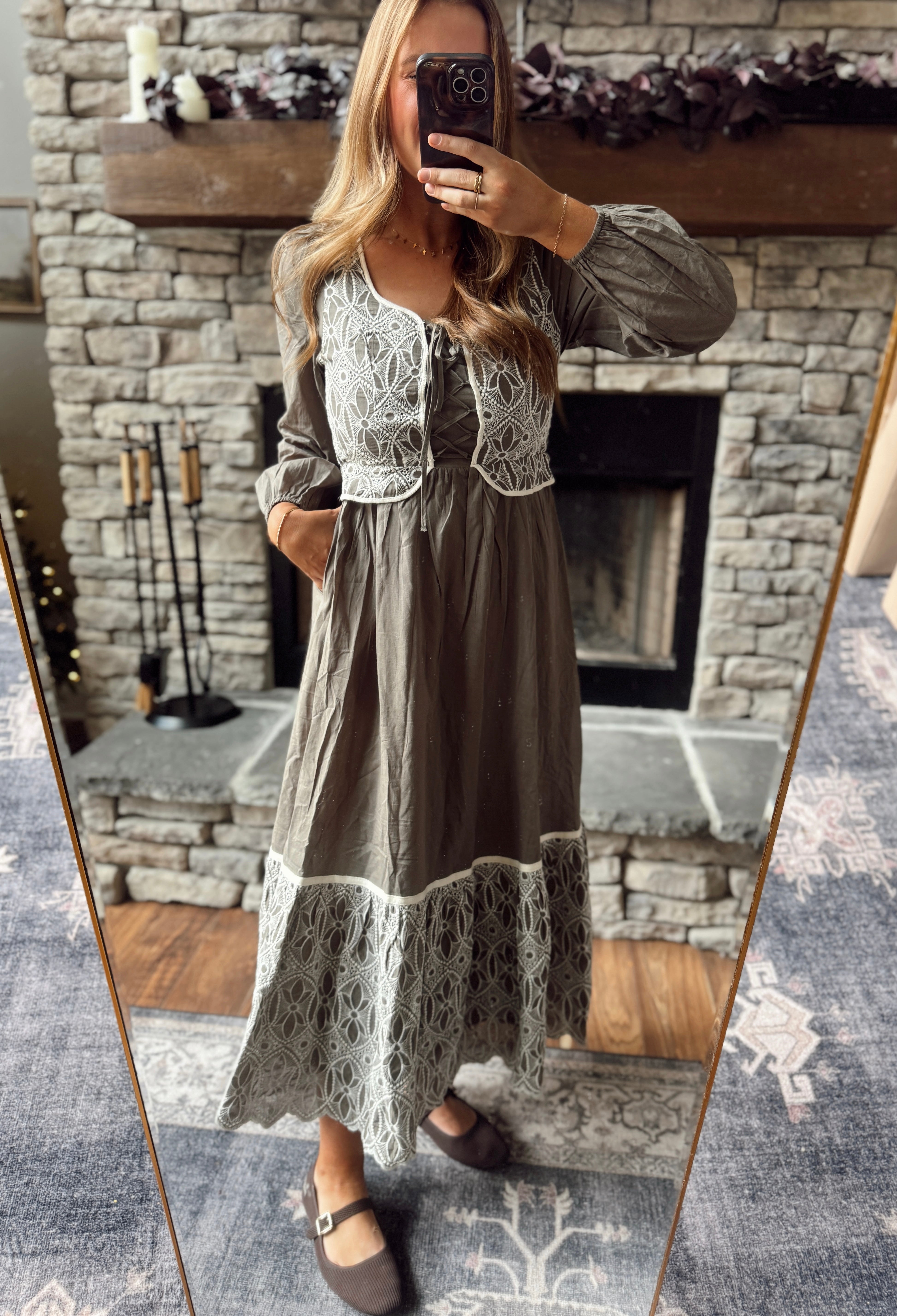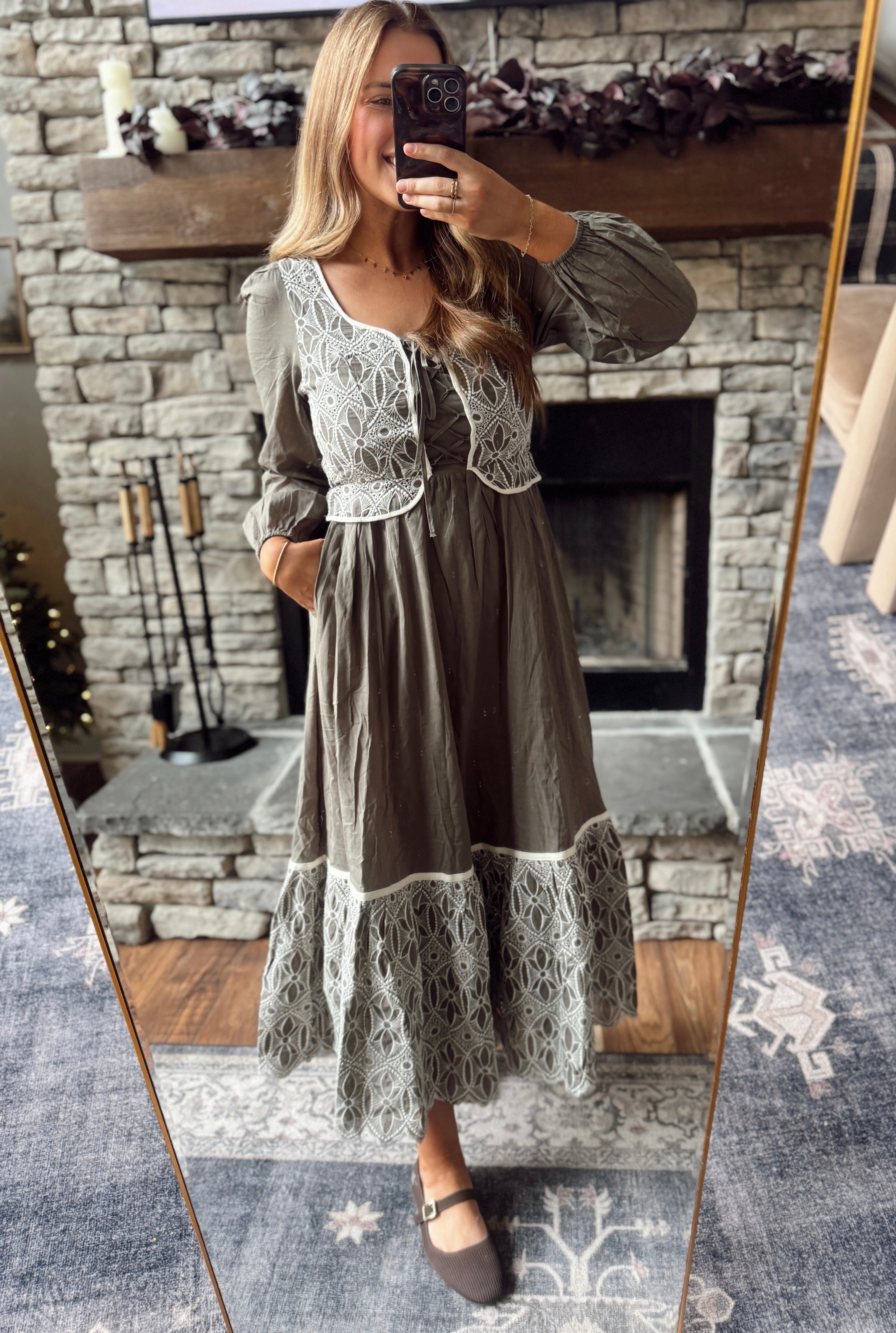 Romantic, earthy, and effortlessly feminine — this olive maxi dress is a dreamy mix of flow and texture. Featuring intricate crochet detailing along the bodice and hem, a tie-front neckline, and lightweight fabric that moves beautifully with you. It’s the perfect blend of boho charm and cozy cottagecore.