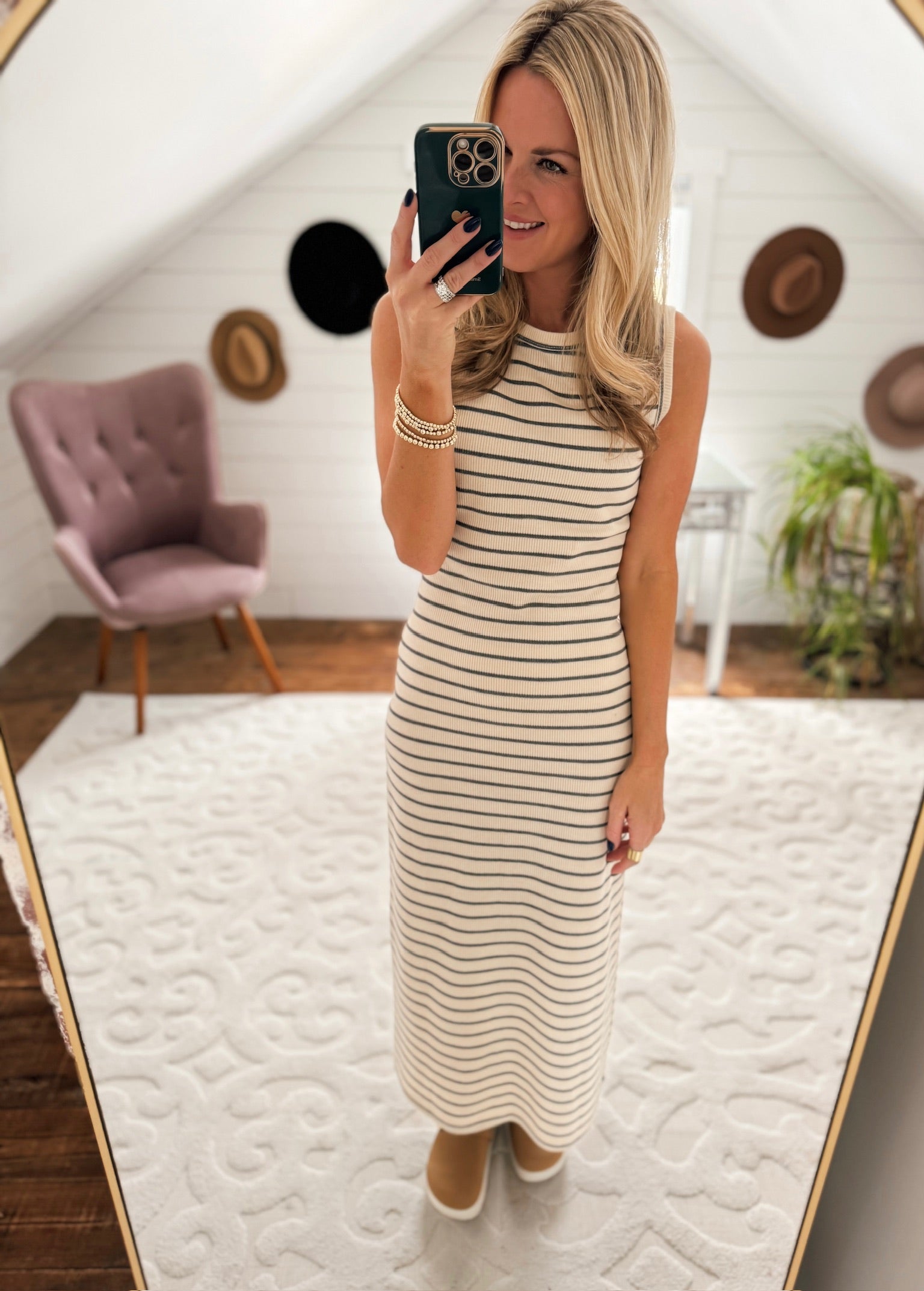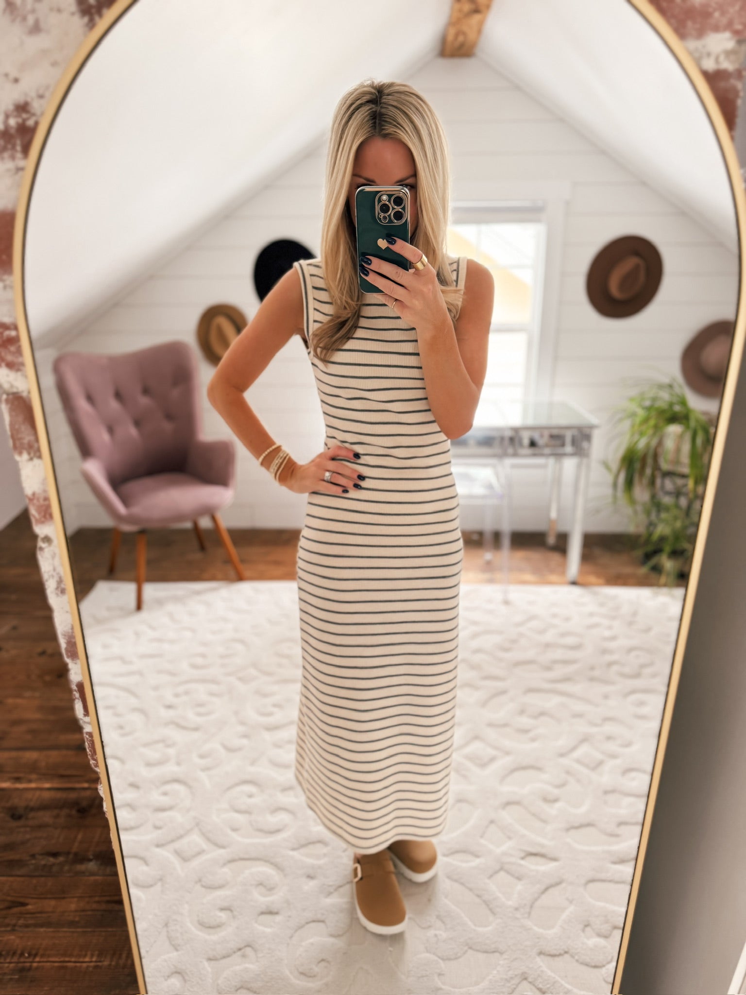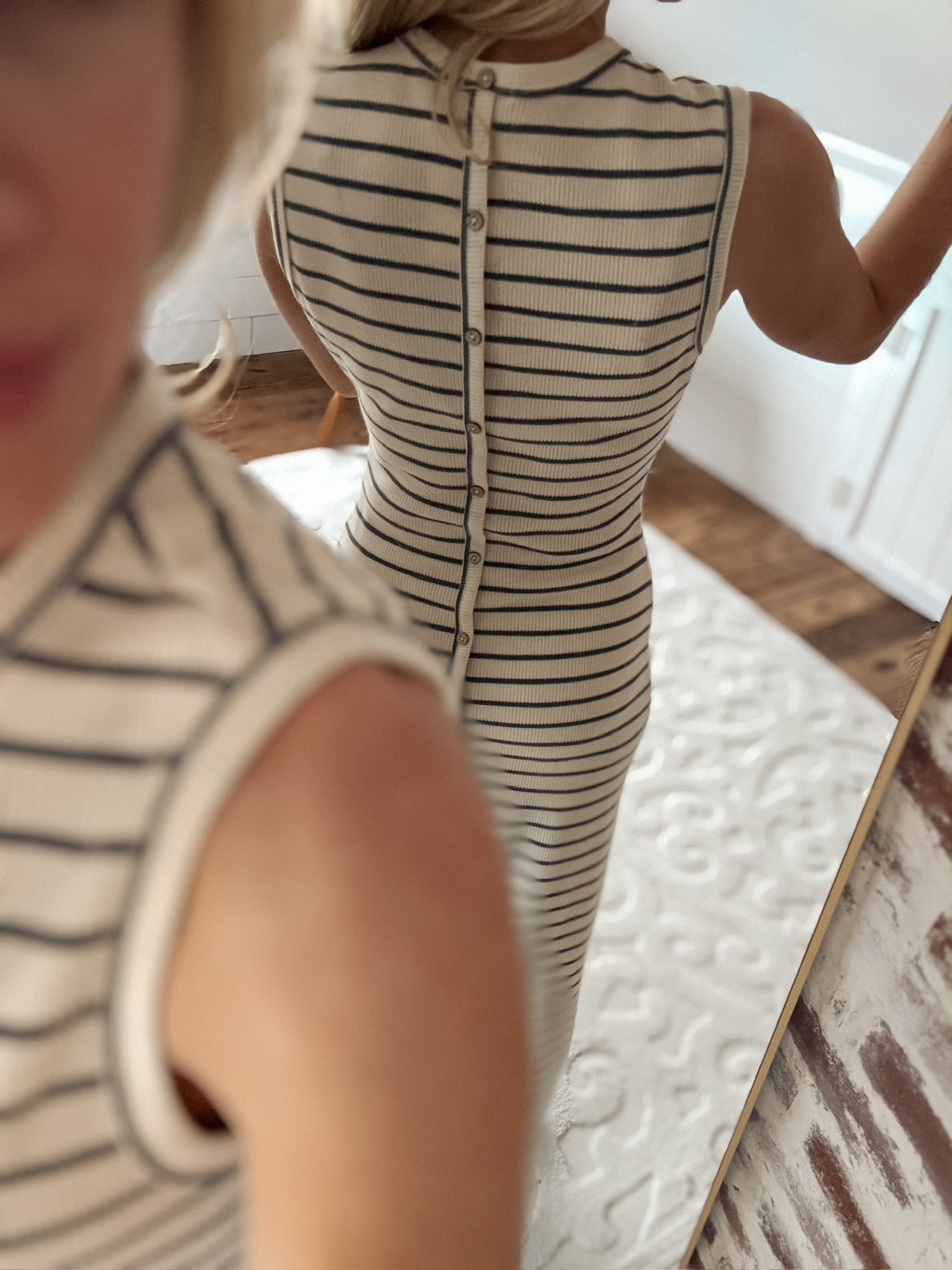 Effortlessly chic meets cozy comfort in this striped knitted dress! Featuring classic beige and gray stripes with a charming button-back detail, it's the perfect piece for layering through the seasons. The soft knit fabric moves with you, while the timeless stripe pattern pairs beautifully with everything in your closet. Whether you're dressing it up with heels or keeping it casual with sneakers, this versatile dress is about to become your go-to favorite.