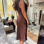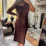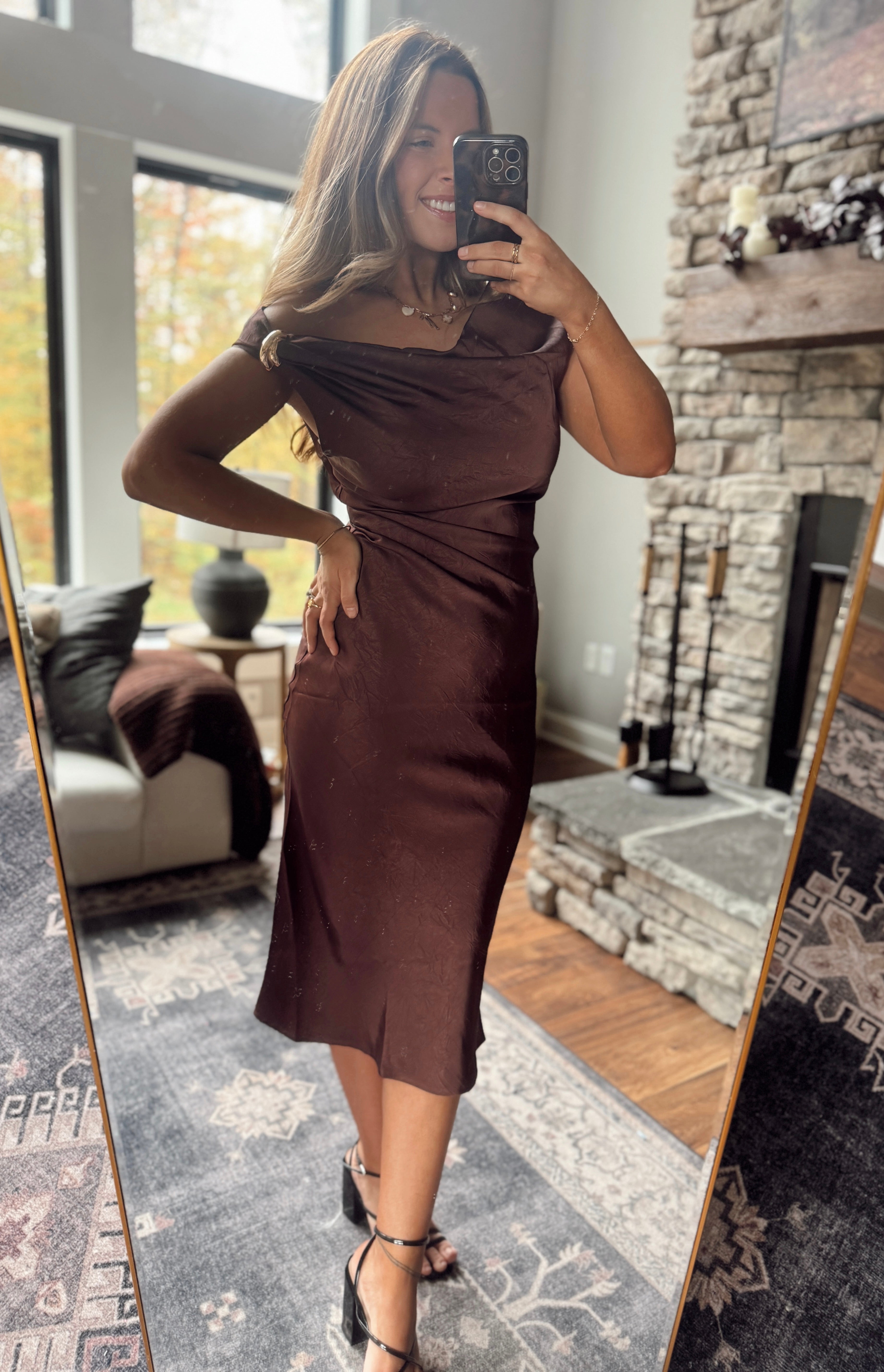 A timeless, flattering silhouette that’s made to turn heads. This satin midi dress drapes beautifully, making it perfect for holiday parties, weddings, or elevated nights out.