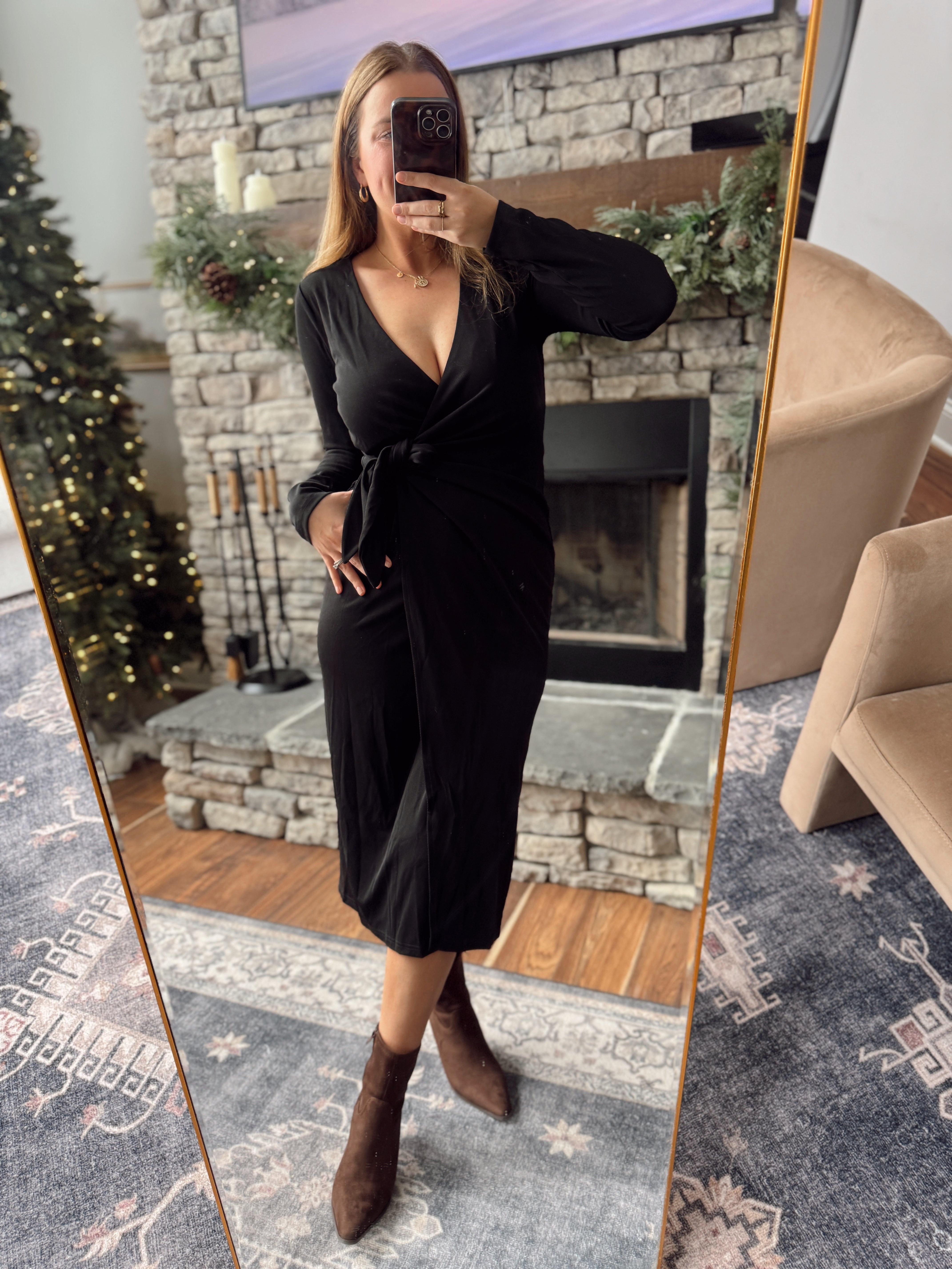 This is the little black dress every woman needs. A true wrap style (not faux!), this dress ties fully at the waist so you can adjust the fit exactly how you want it. The V-neckline, long sleeves, and soft drapey fabric make it incredibly flattering on every body type. Elegant, feminine, and perfect for any event from holiday dinners to date night.