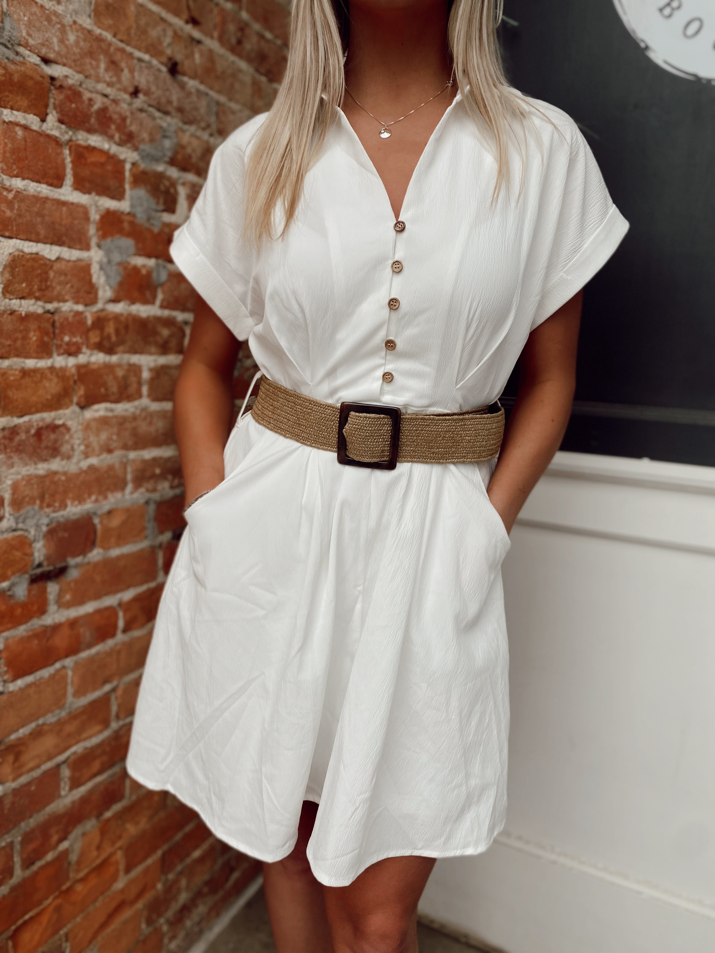 Effortless and timeless, this mini dress is a closet staple with endless styling potential. Featuring a crisp collared neckline, front button closures, and a removable waist belt to cinch your shape, this versatile mini dress transitions seamlessly from workdays to weekends. This is so dang cute!