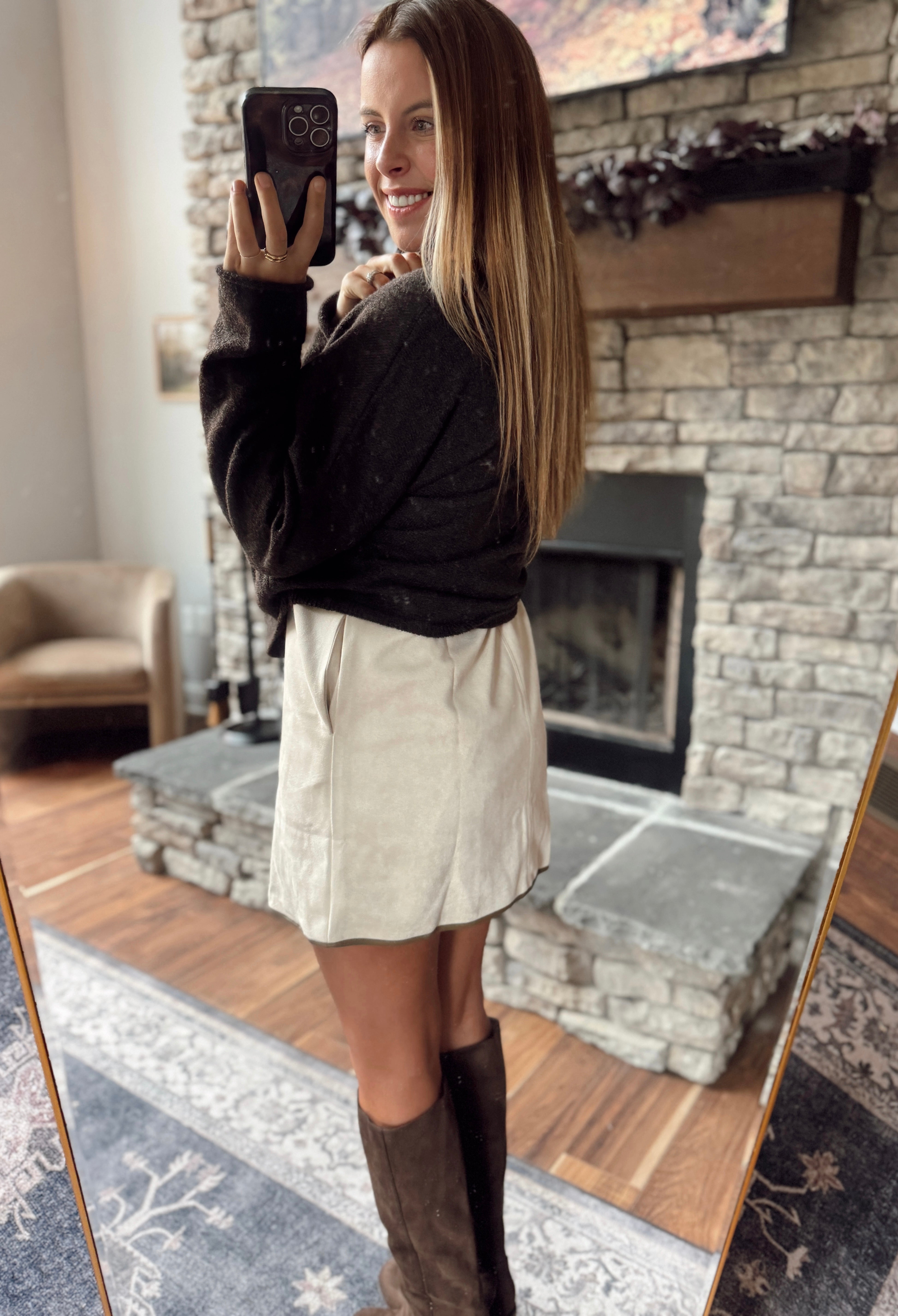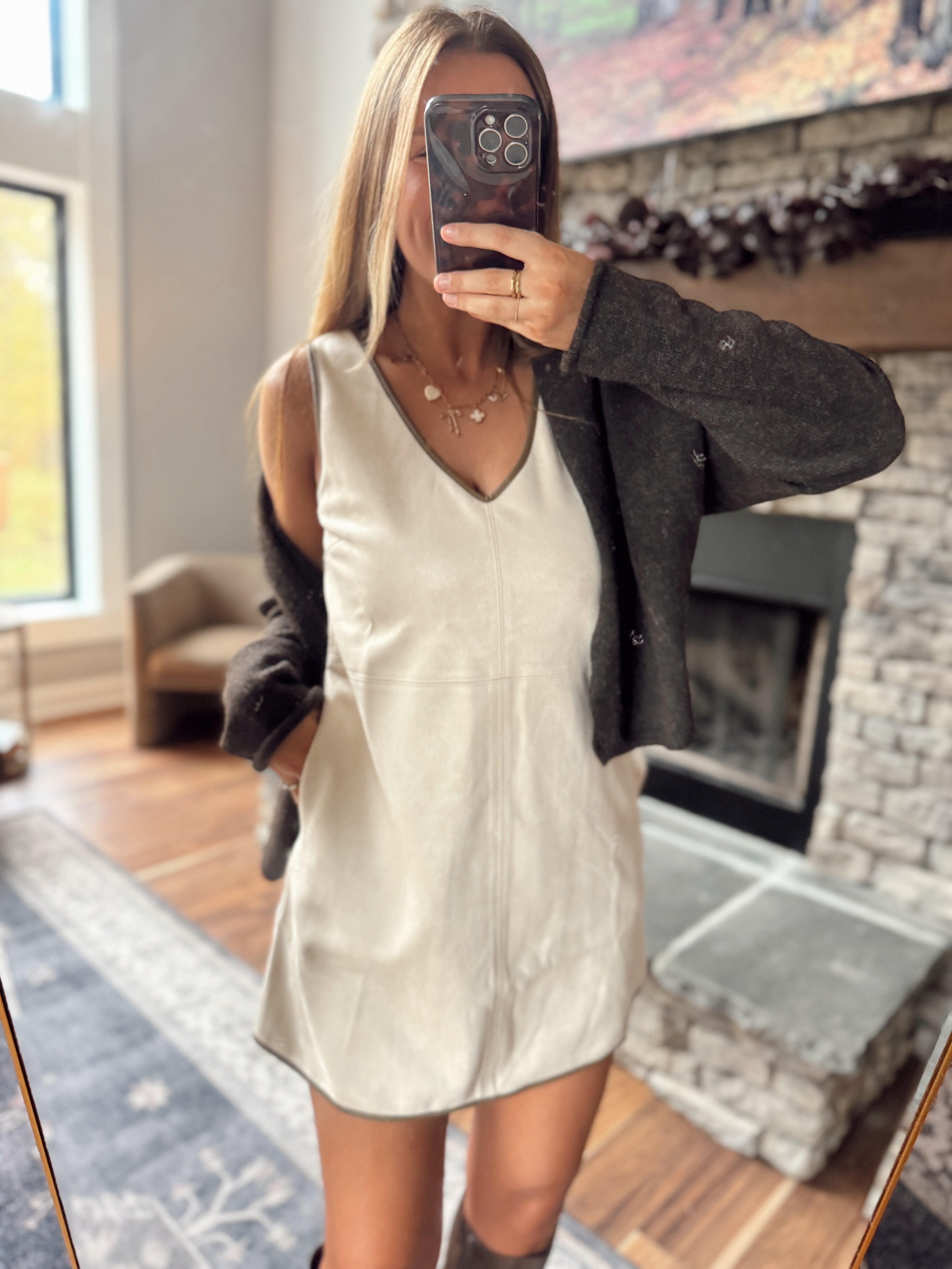 Soft, luxe, and ready to layer — this suede mini dress is the perfect fall staple. It features a flattering V-neckline, subtle structure for shape, and an easy pull-on fit. Dress it up or keep it casual — it’s effortless either way.