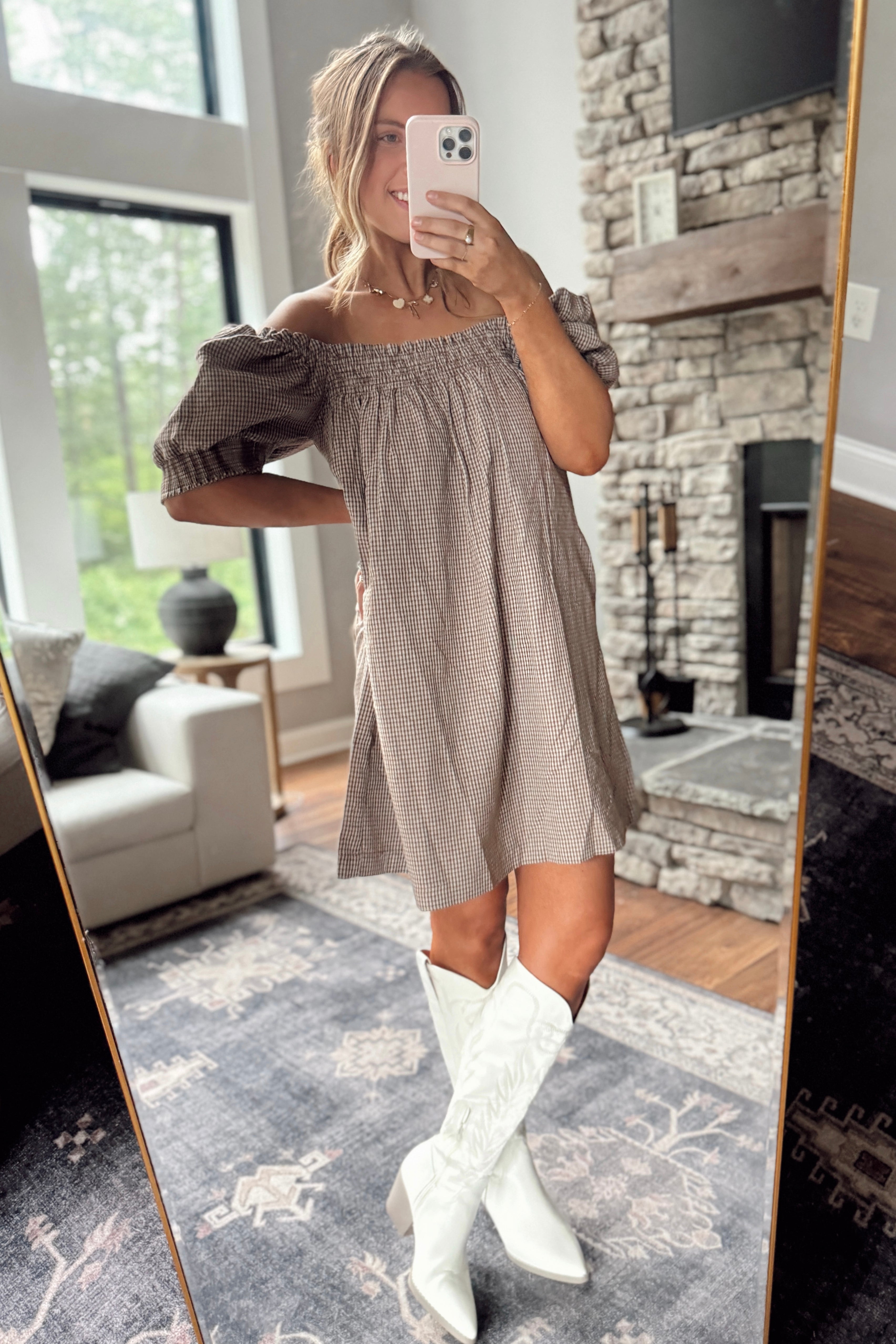Choco Plaid Pattern Play Puff Sleeve Mini